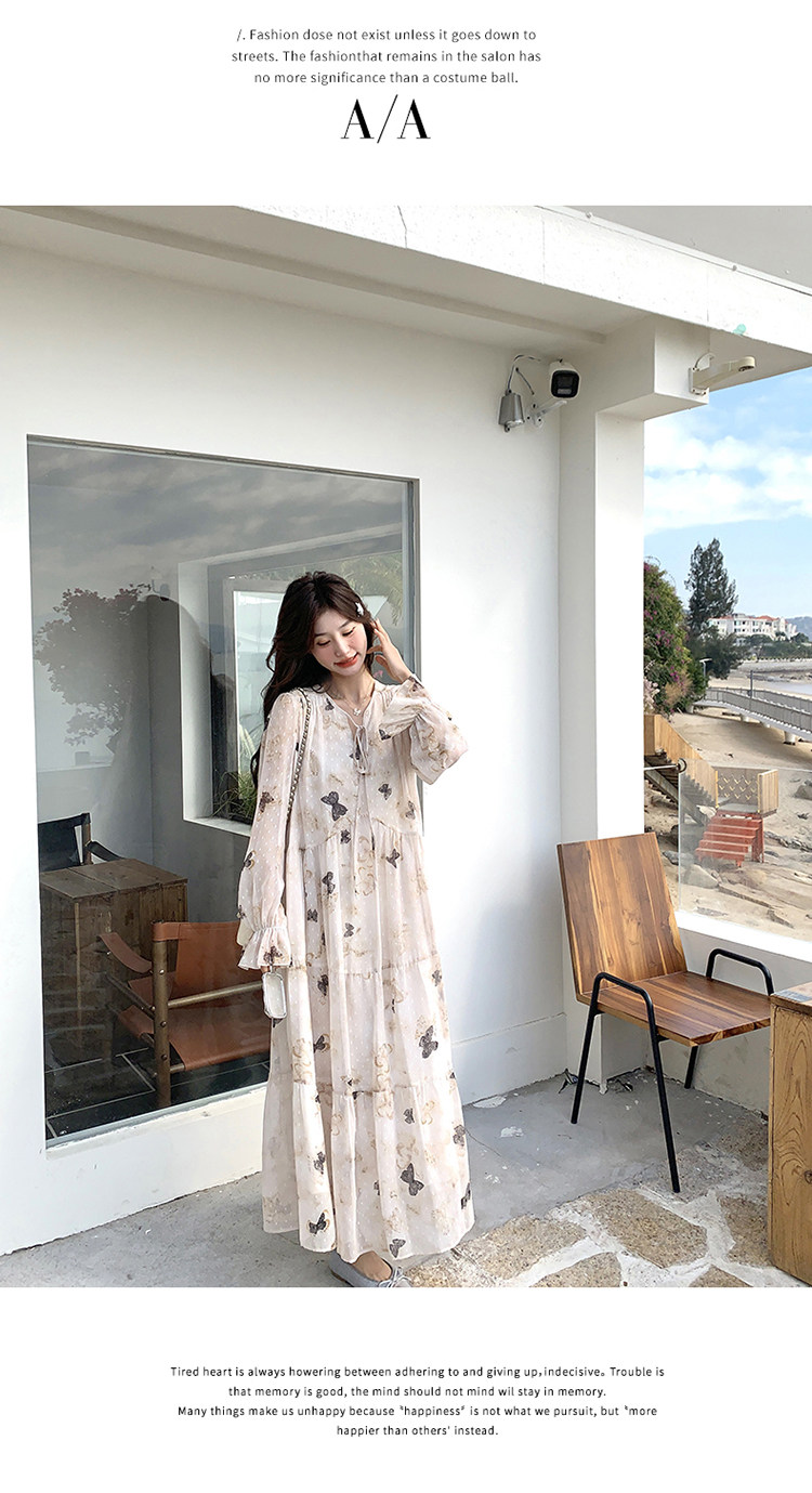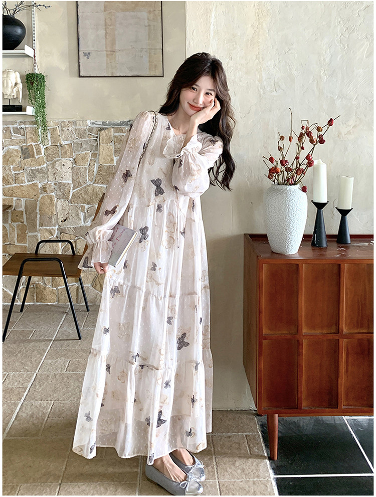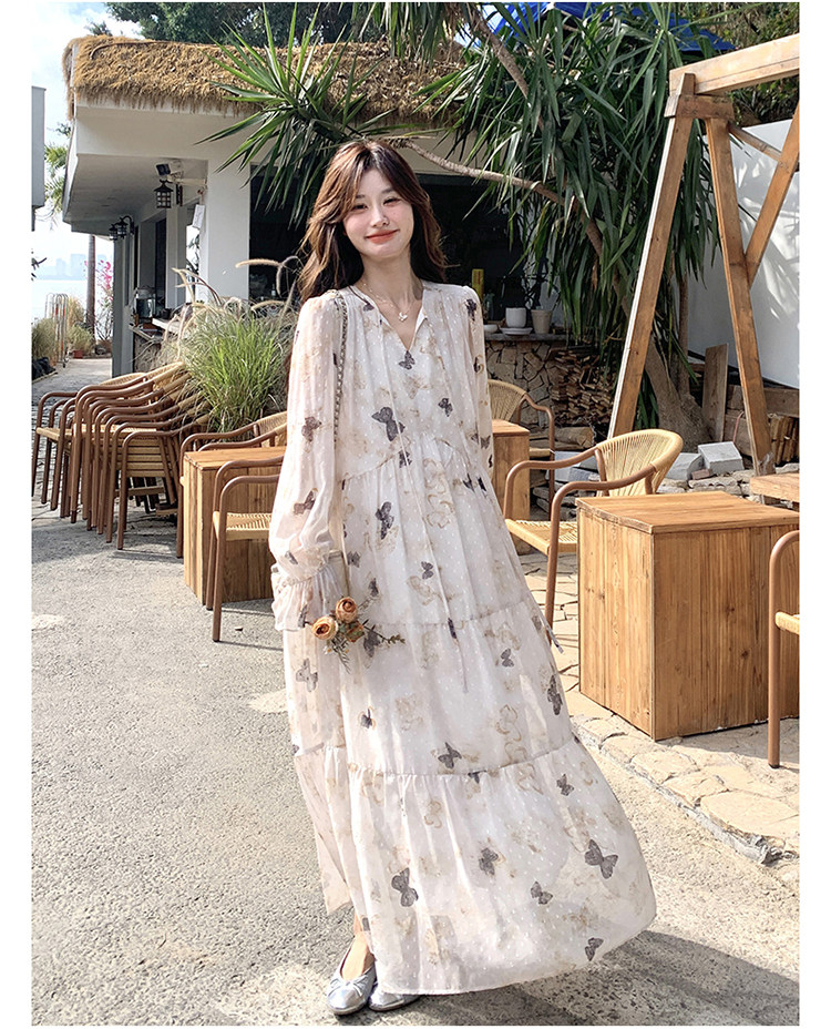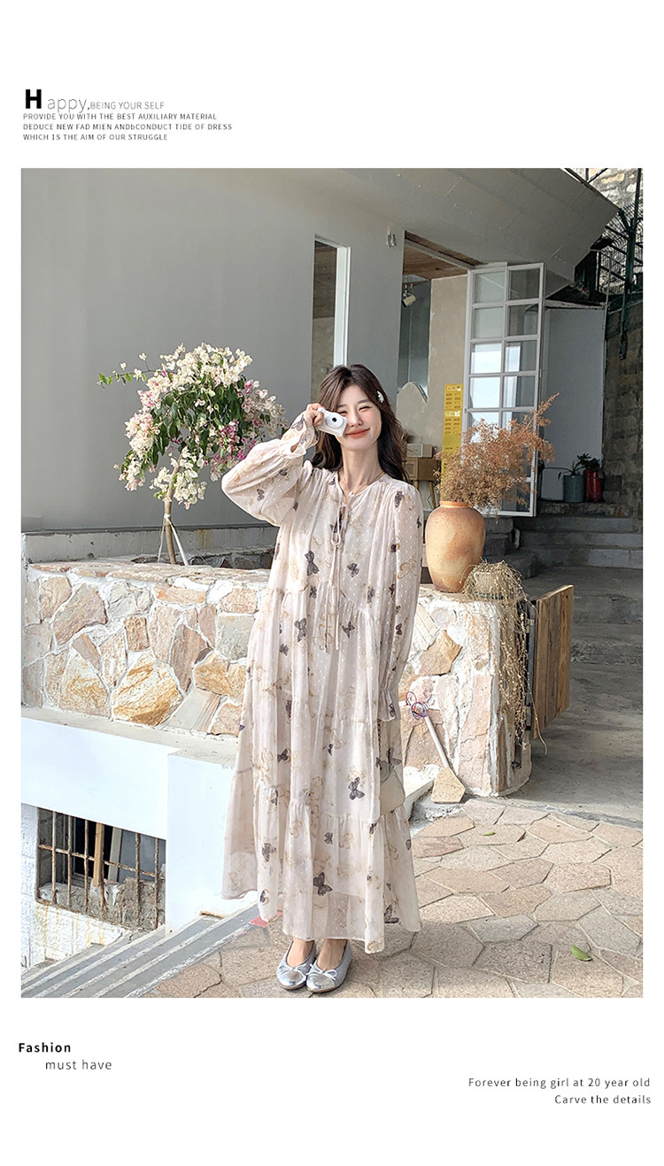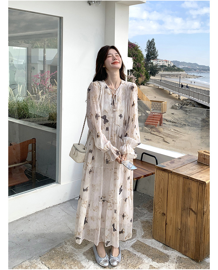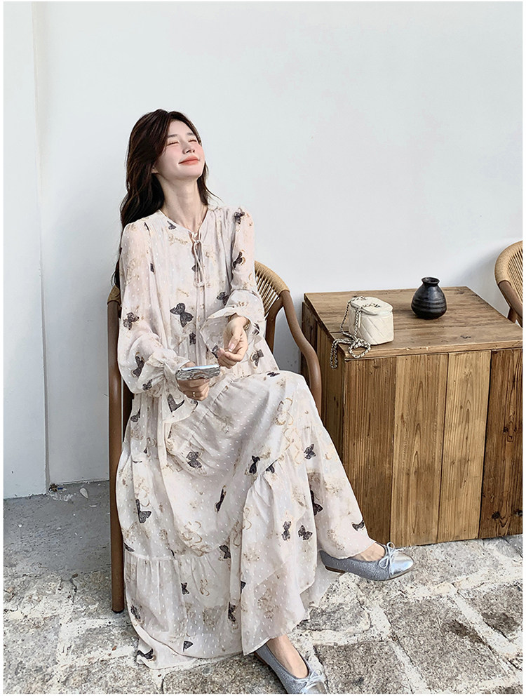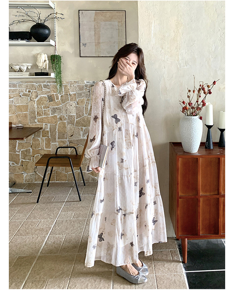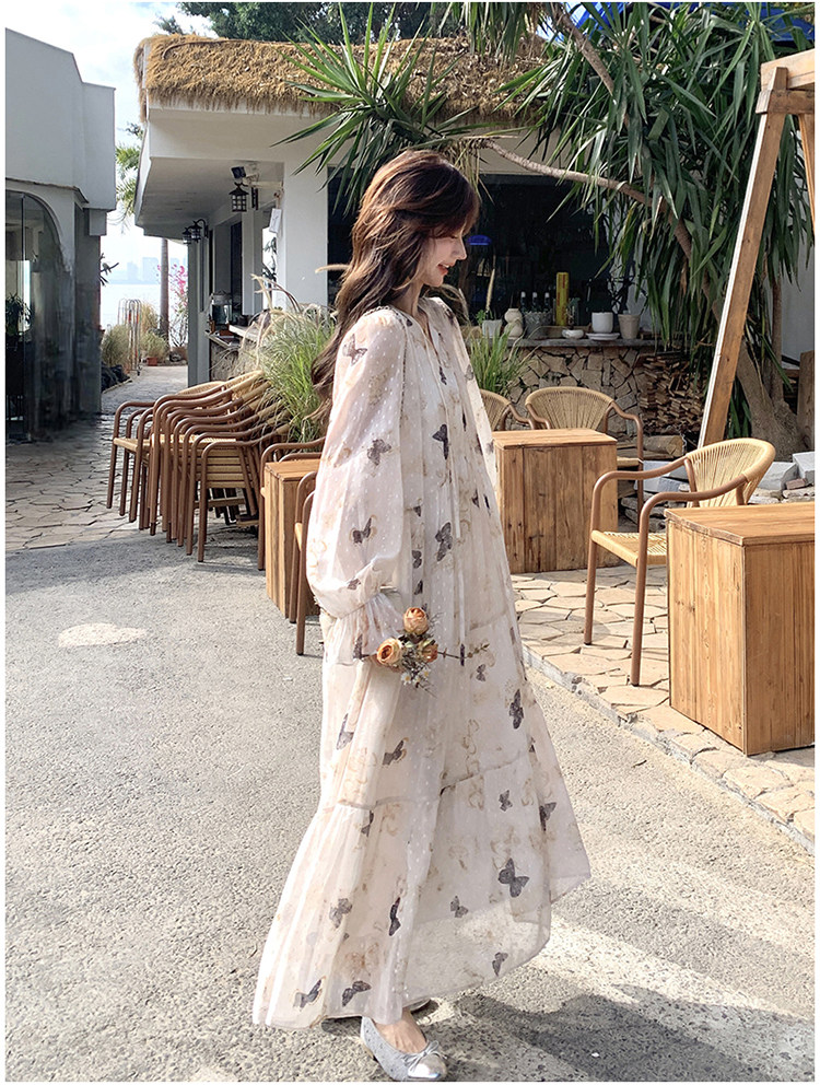 【商品名】【ワンピース】フレンチロマン 蝶々柄ワンピース レディース 2026春新作 ロング丈 ゆったり 体型カバー リゾート 海辺 旅行長袖ワンピース【SHシリーズ】