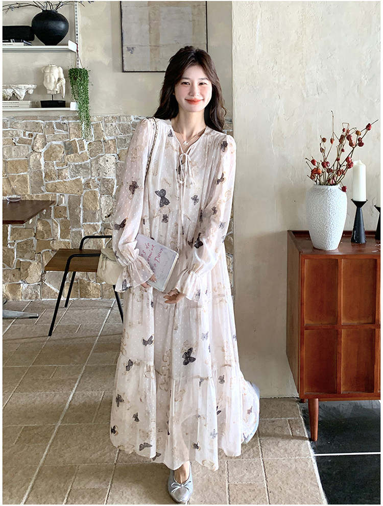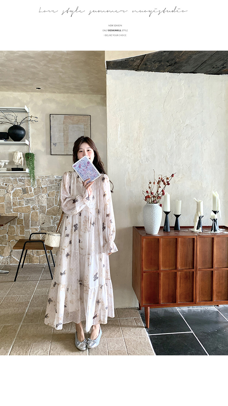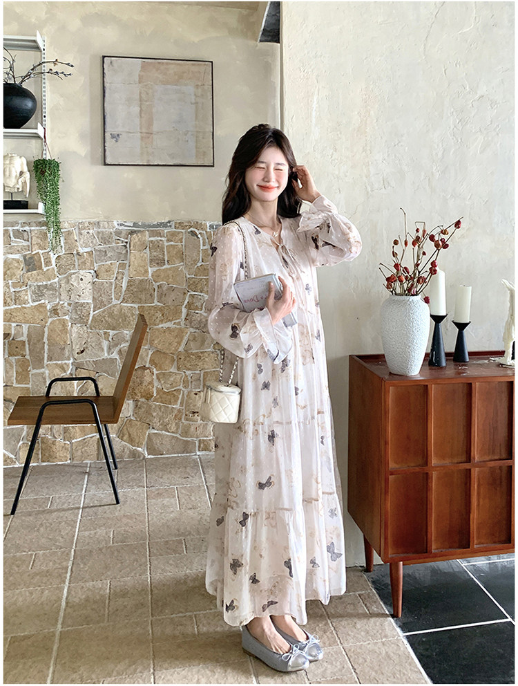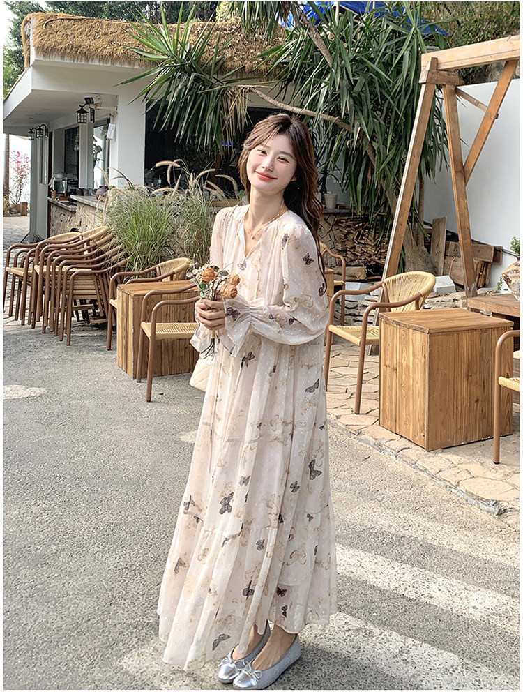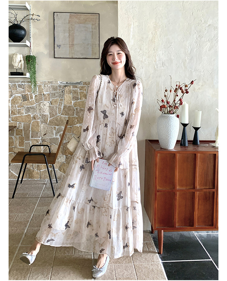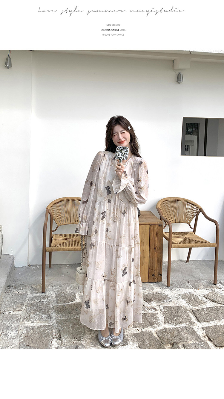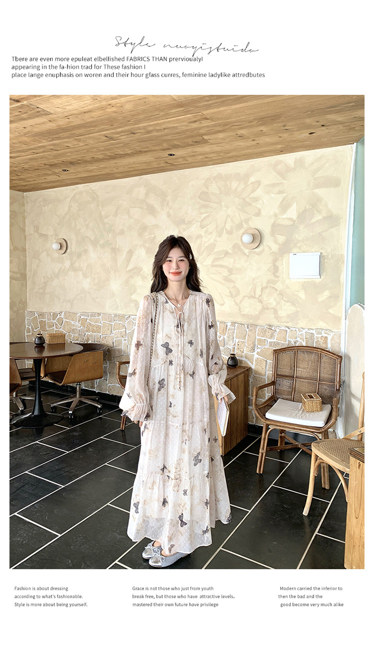 【商品名】【ワンピース】フレンチロマン 蝶々柄ワンピース レディース 2026春新作 ロング丈 ゆったり 体型カバー リゾート 海辺 旅行長袖ワンピース【SHシリーズ】