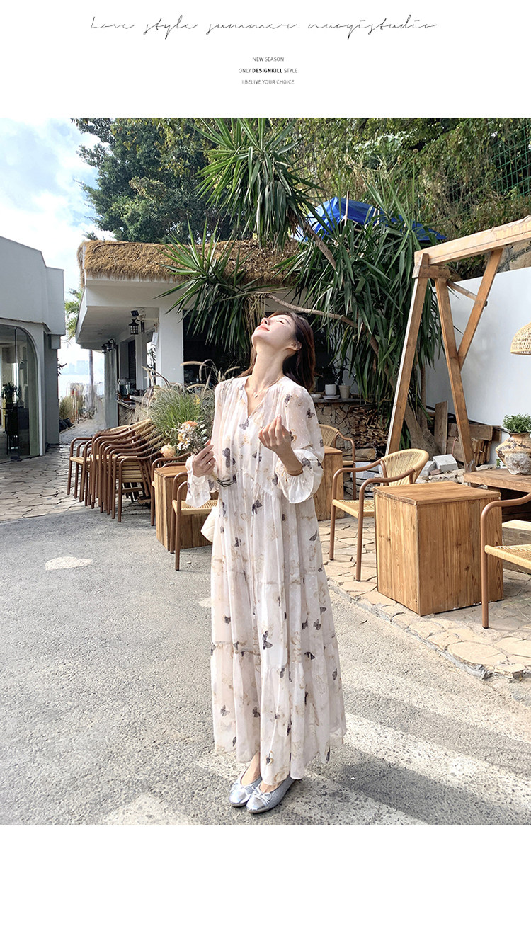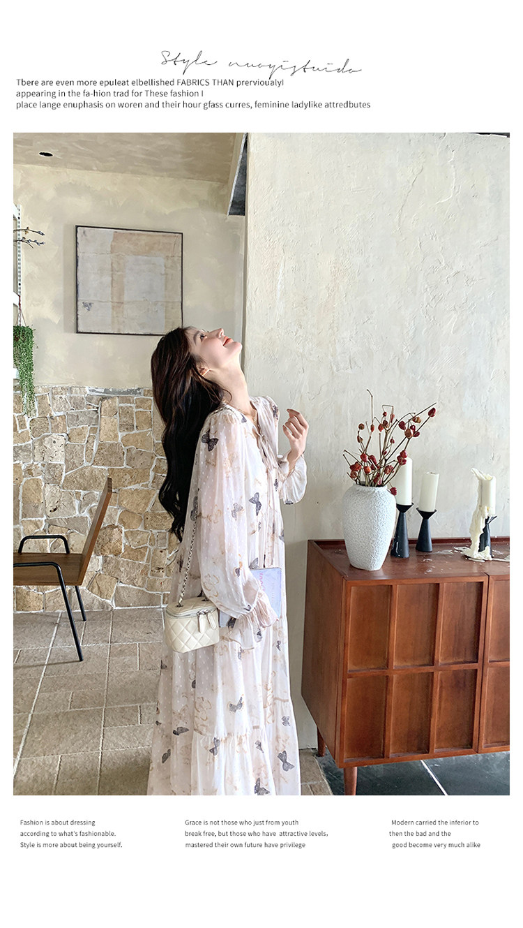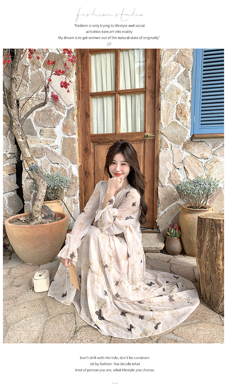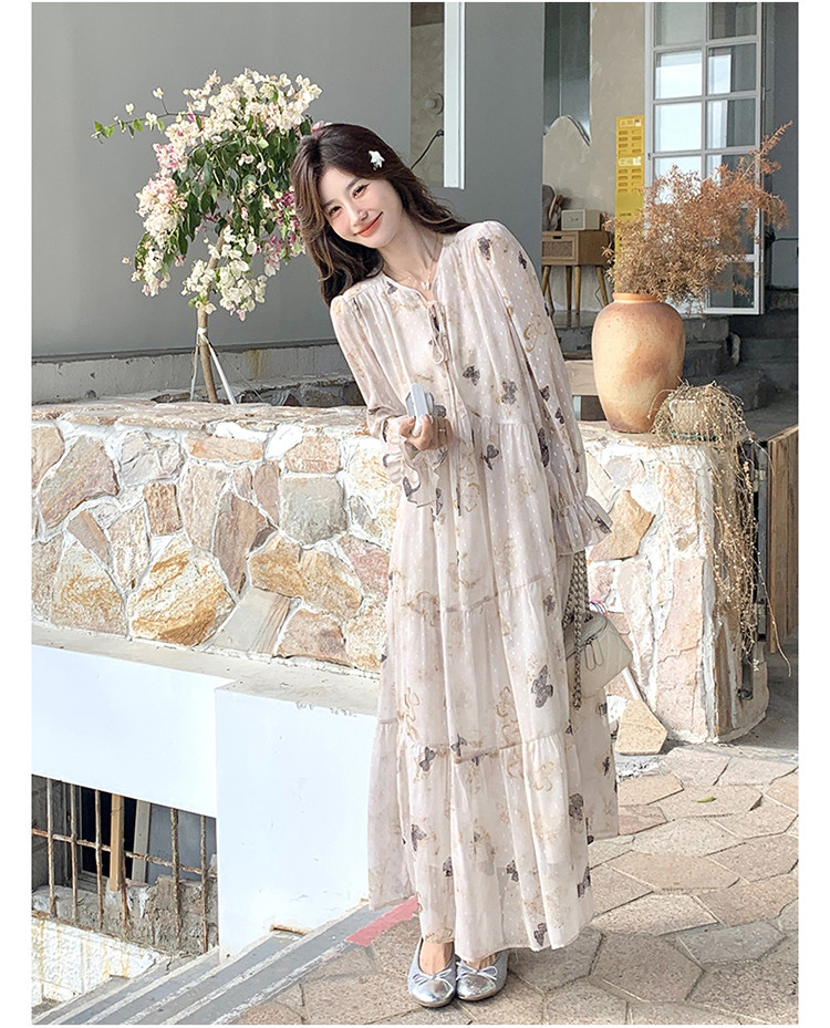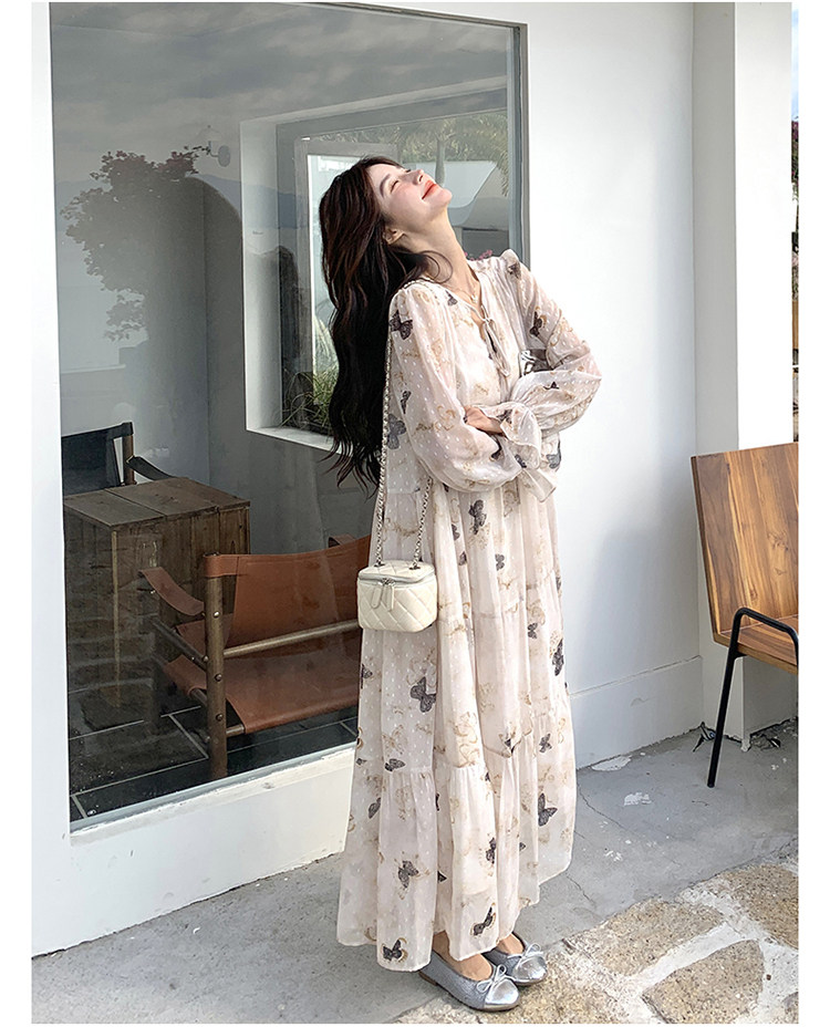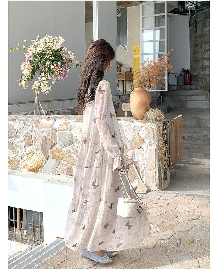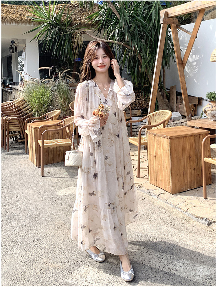 【商品名】【ワンピース】フレンチロマン 蝶々柄ワンピース レディース 2026春新作 ロング丈 ゆったり 体型カバー リゾート 海辺 旅行長袖ワンピース【SHシリーズ】