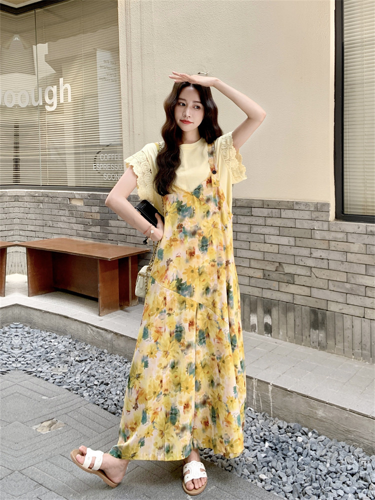 【ワンピース】レース切替 小花柄ワンピース レディース春新作 長袖 ゆったりシルエット 体型カバー 着痩せ ロング丈 韓国風ワンピース【SHシリーズ】