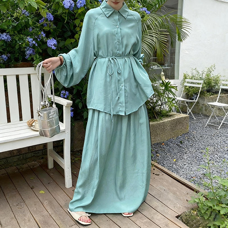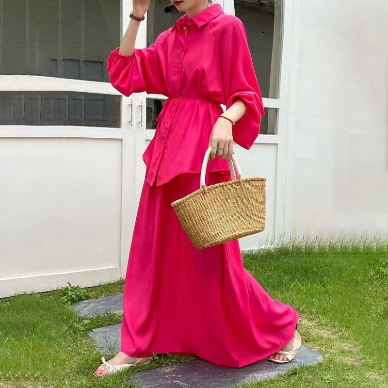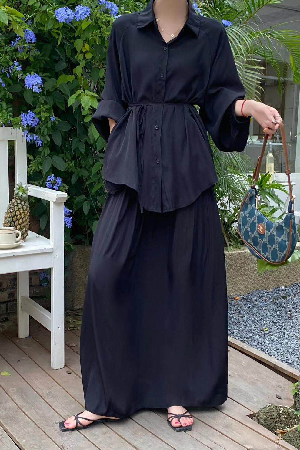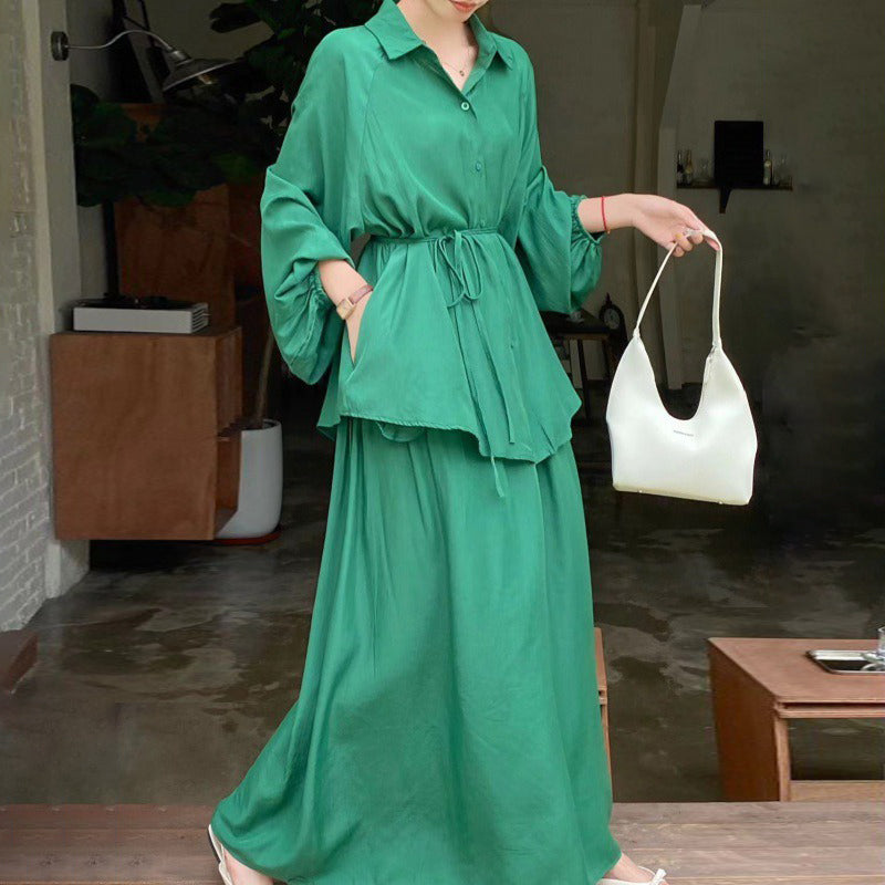 2点セット!【セットアップ】春新作 韓国風 大きいサイズ レディース ゆったりシルエット ウエストリボン シャツ+スカート 上下セット【JZシリーズ】