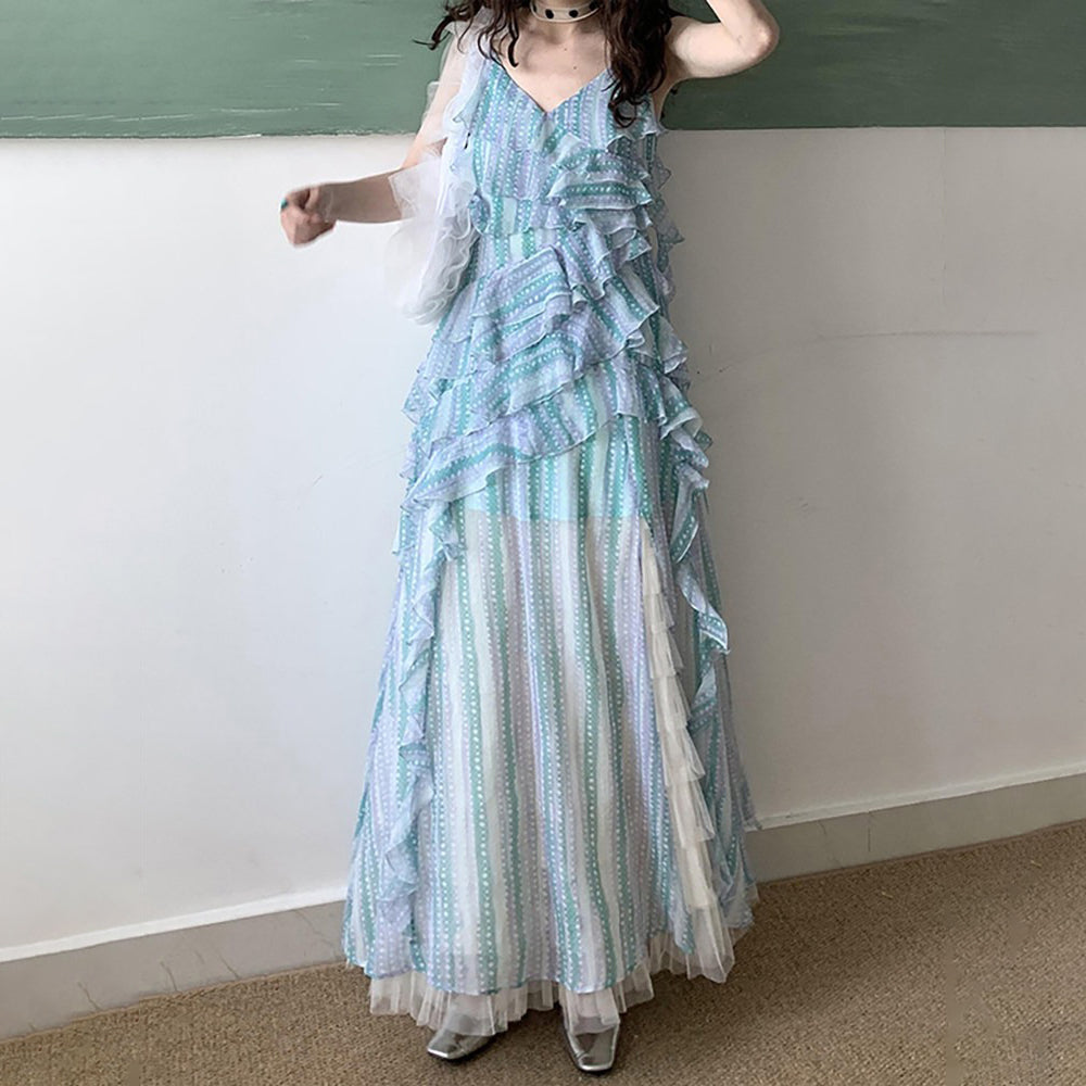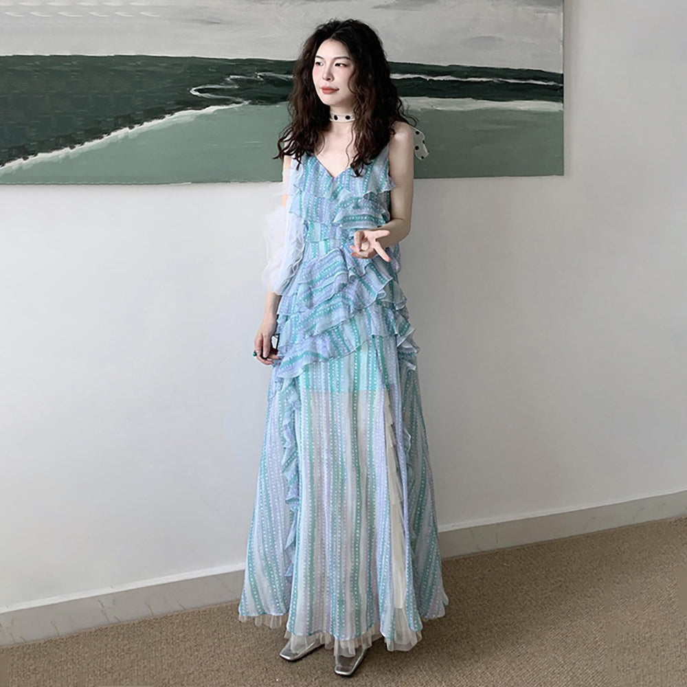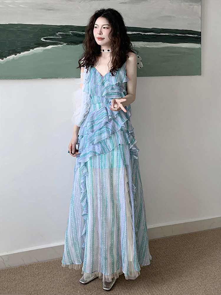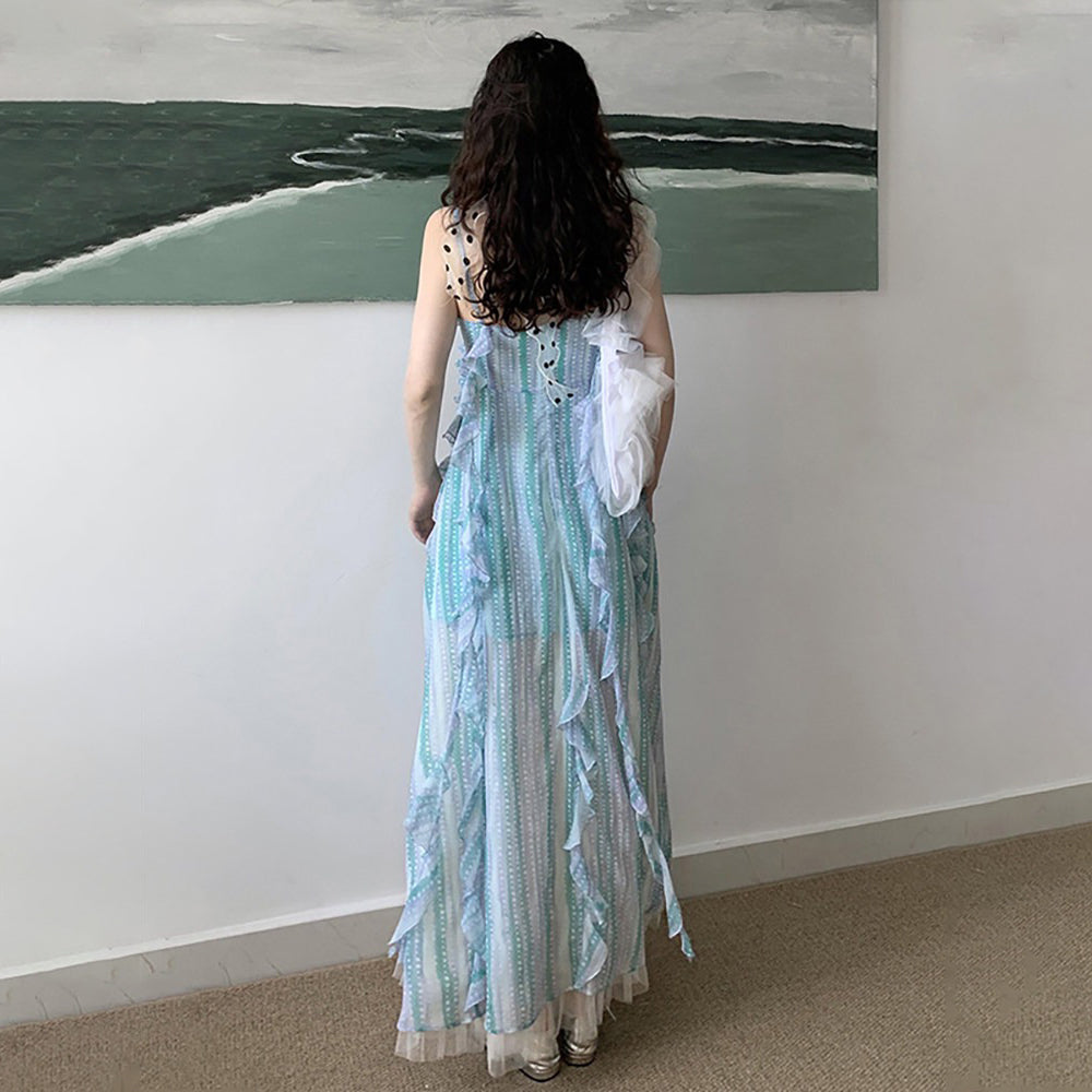 【商品名】【ワンピース】アート風 ブループリント フリル キャミソールワンピース レディース 夏 アシンメトリー ノースリーブ ロングドレス 涼感リゾート【SHシリーズ】