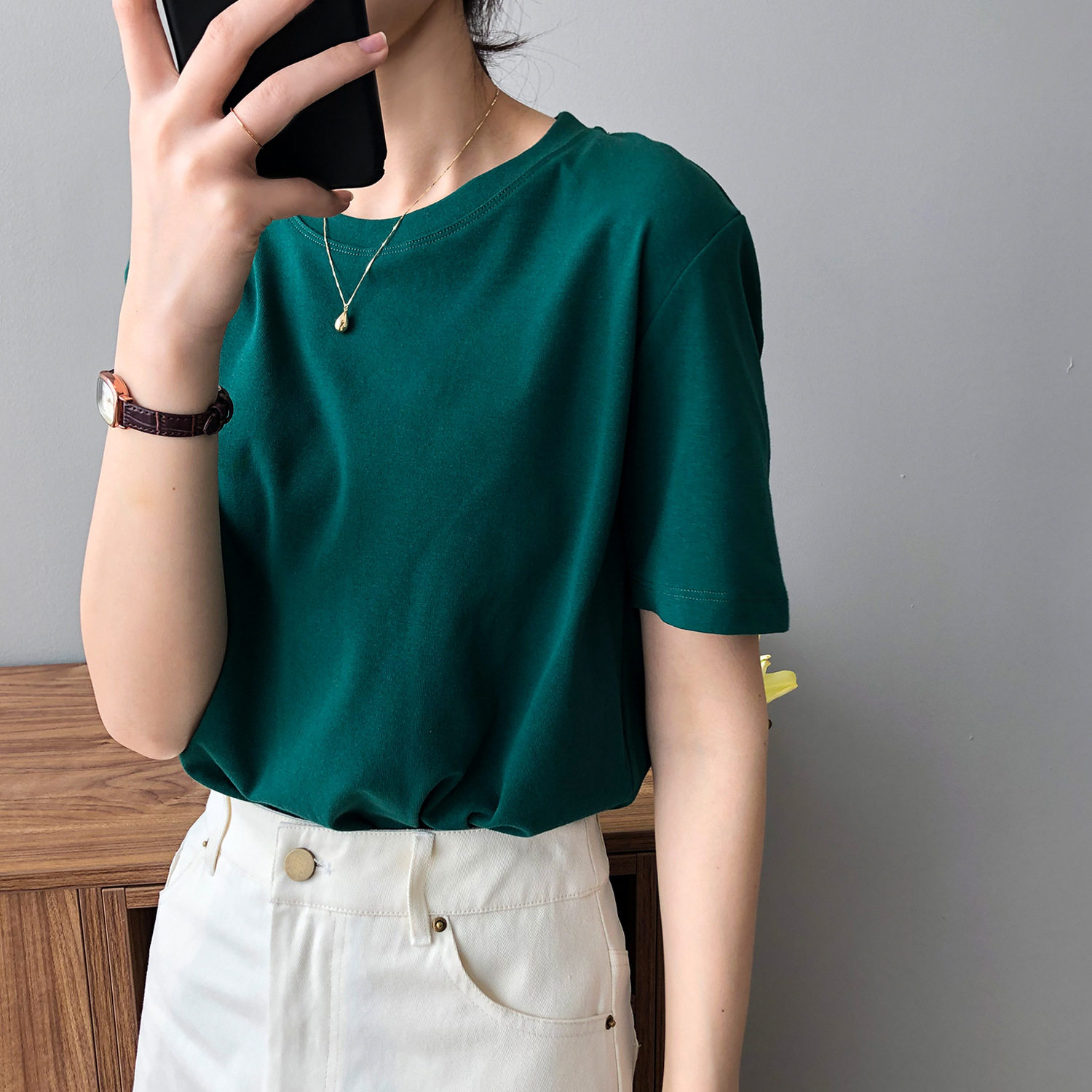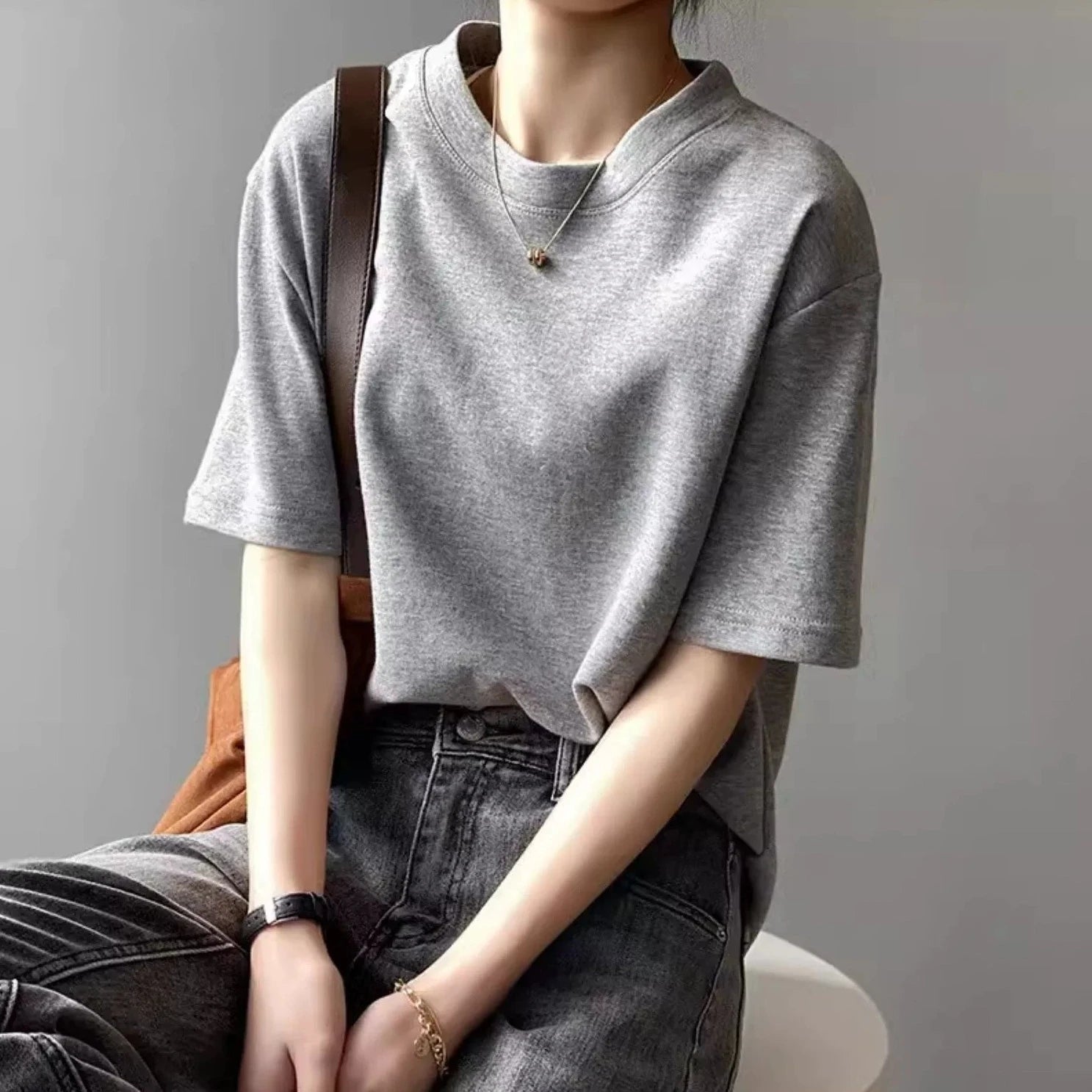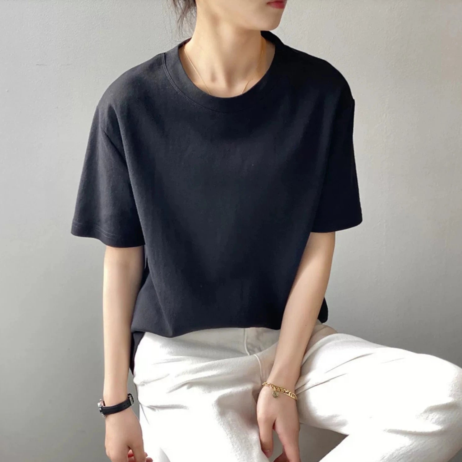 【商品名】【トップス】無地 ラウンドネック Tシャツ