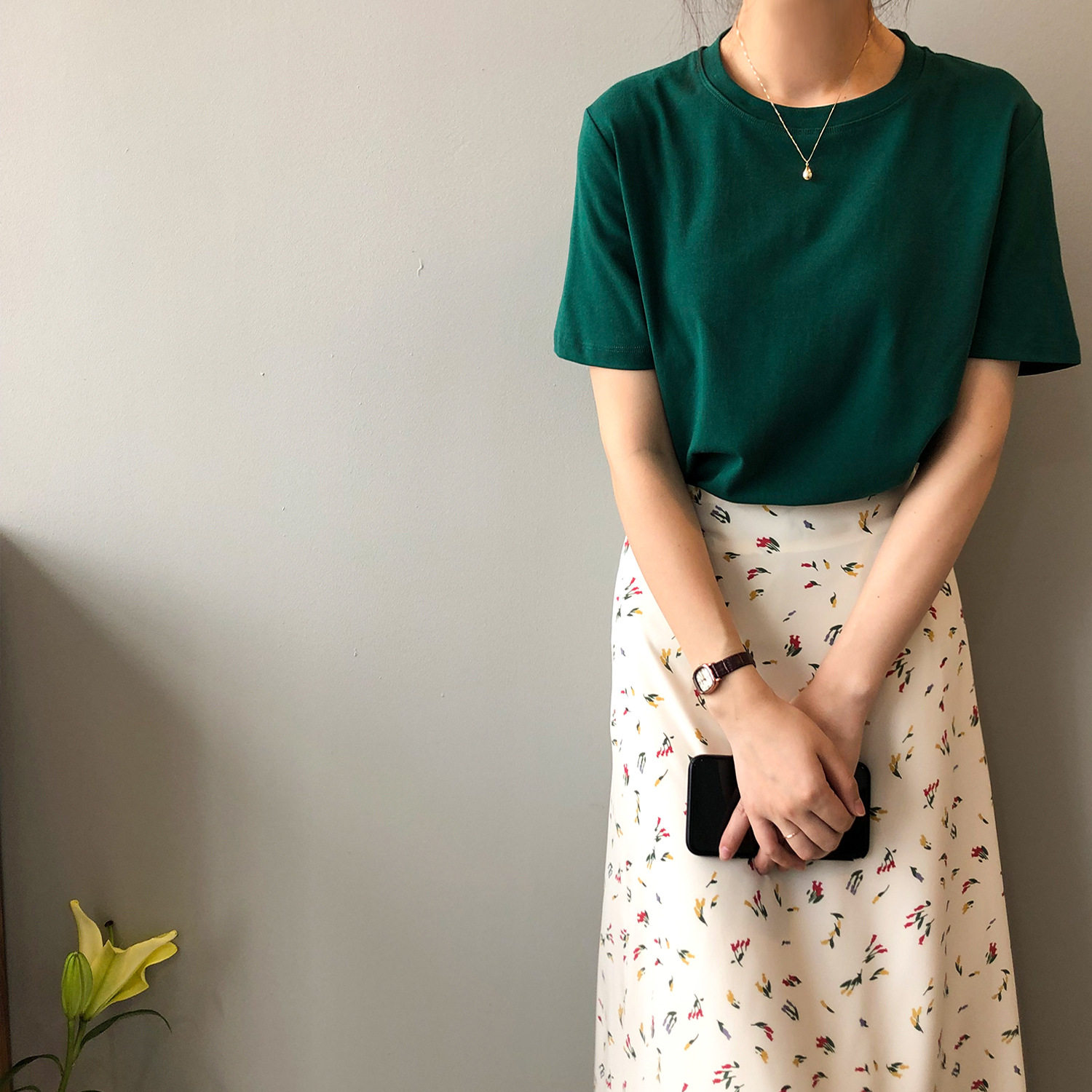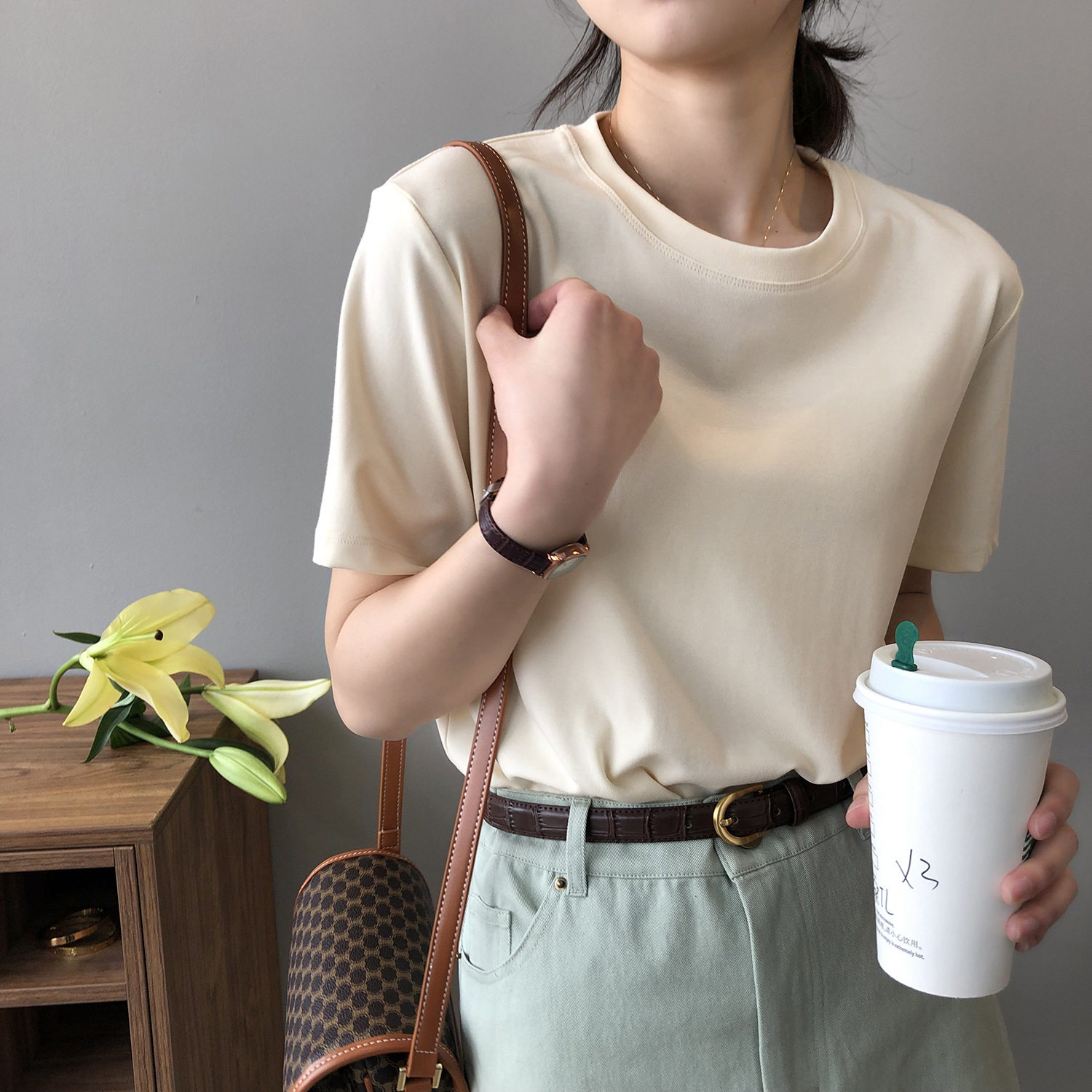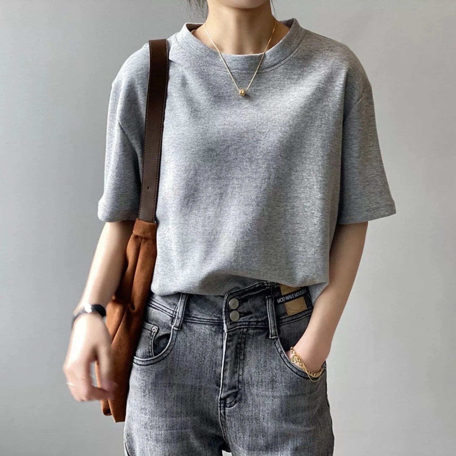 【商品名】【トップス】無地 ラウンドネック Tシャツ