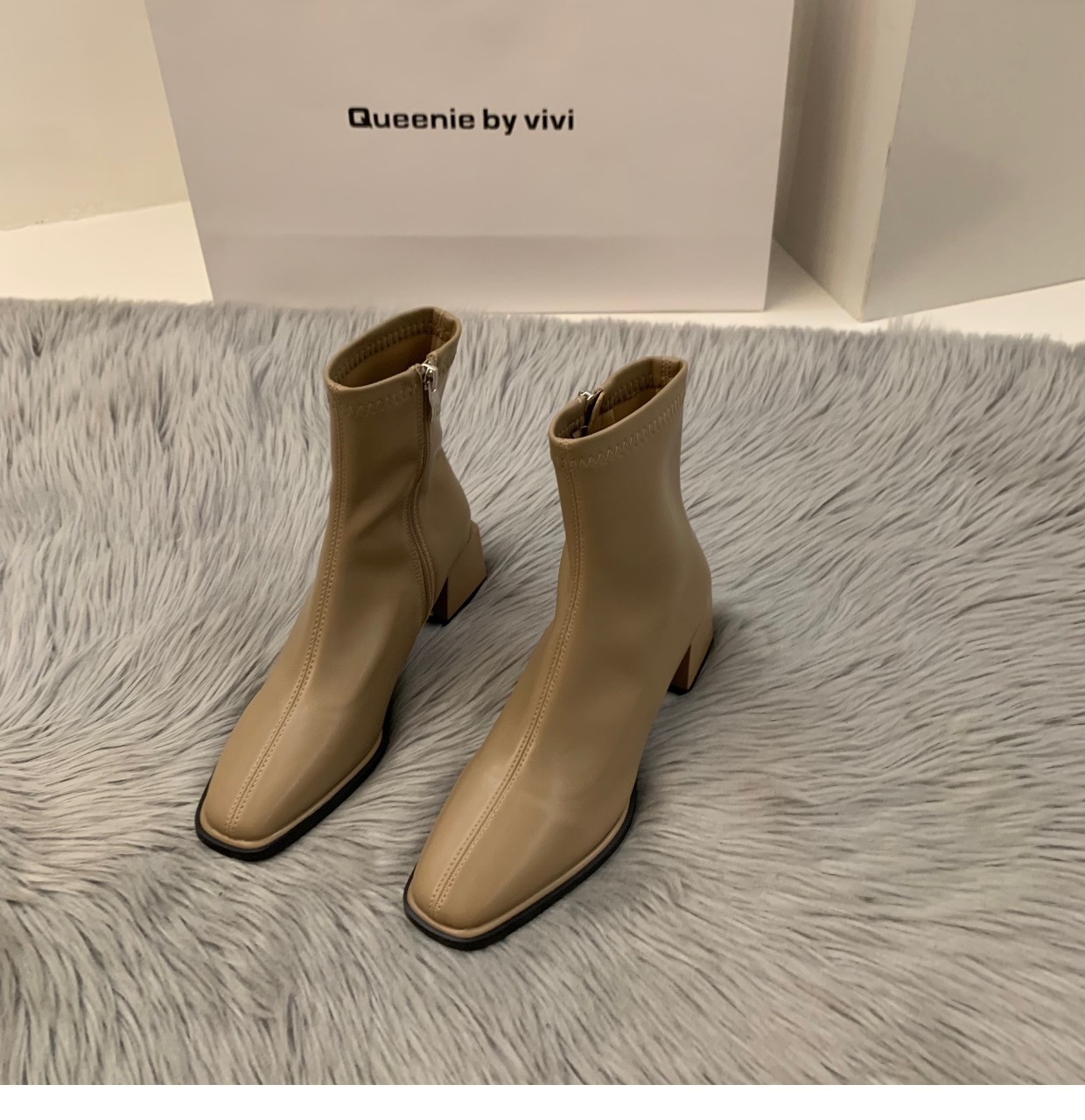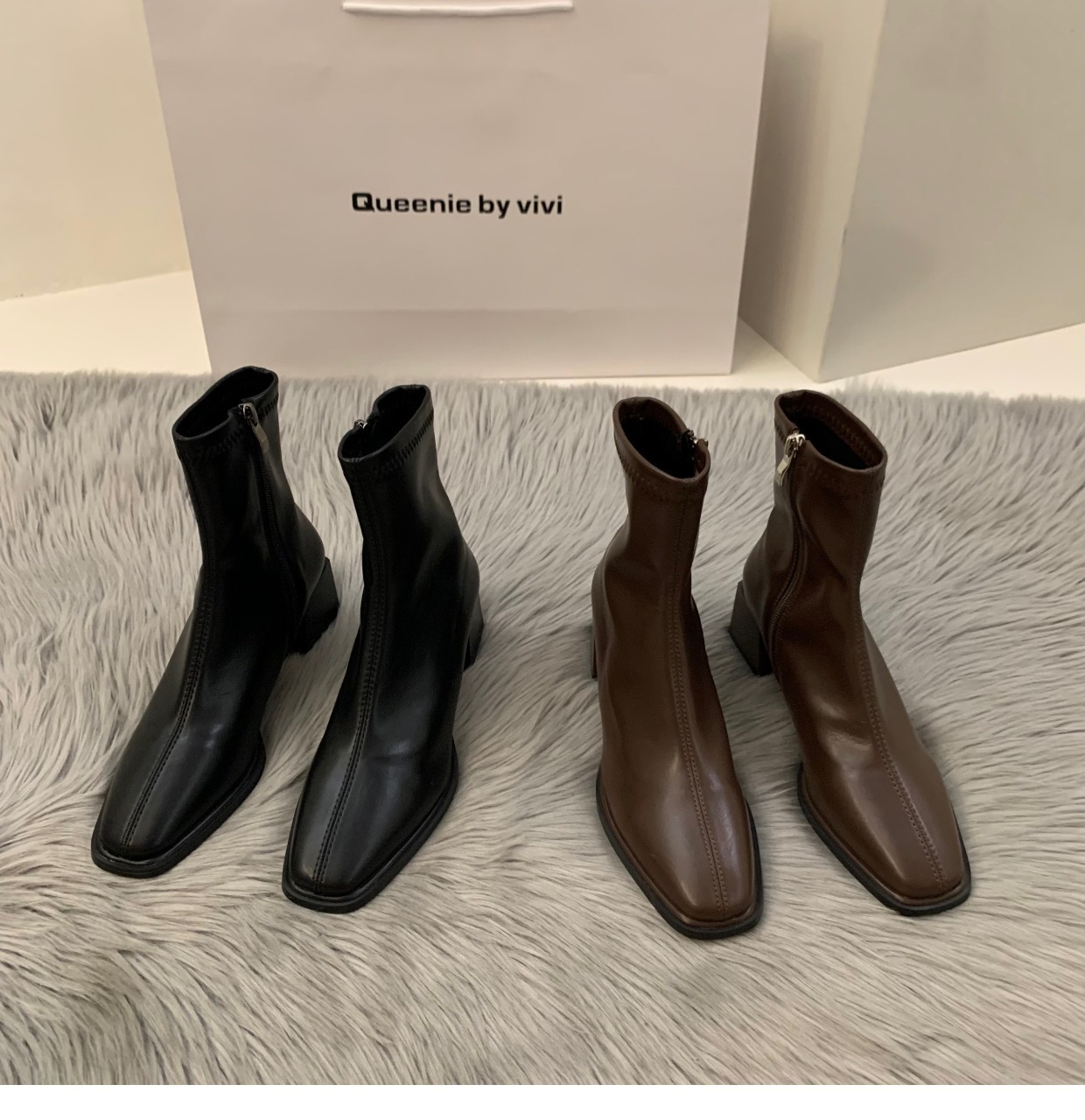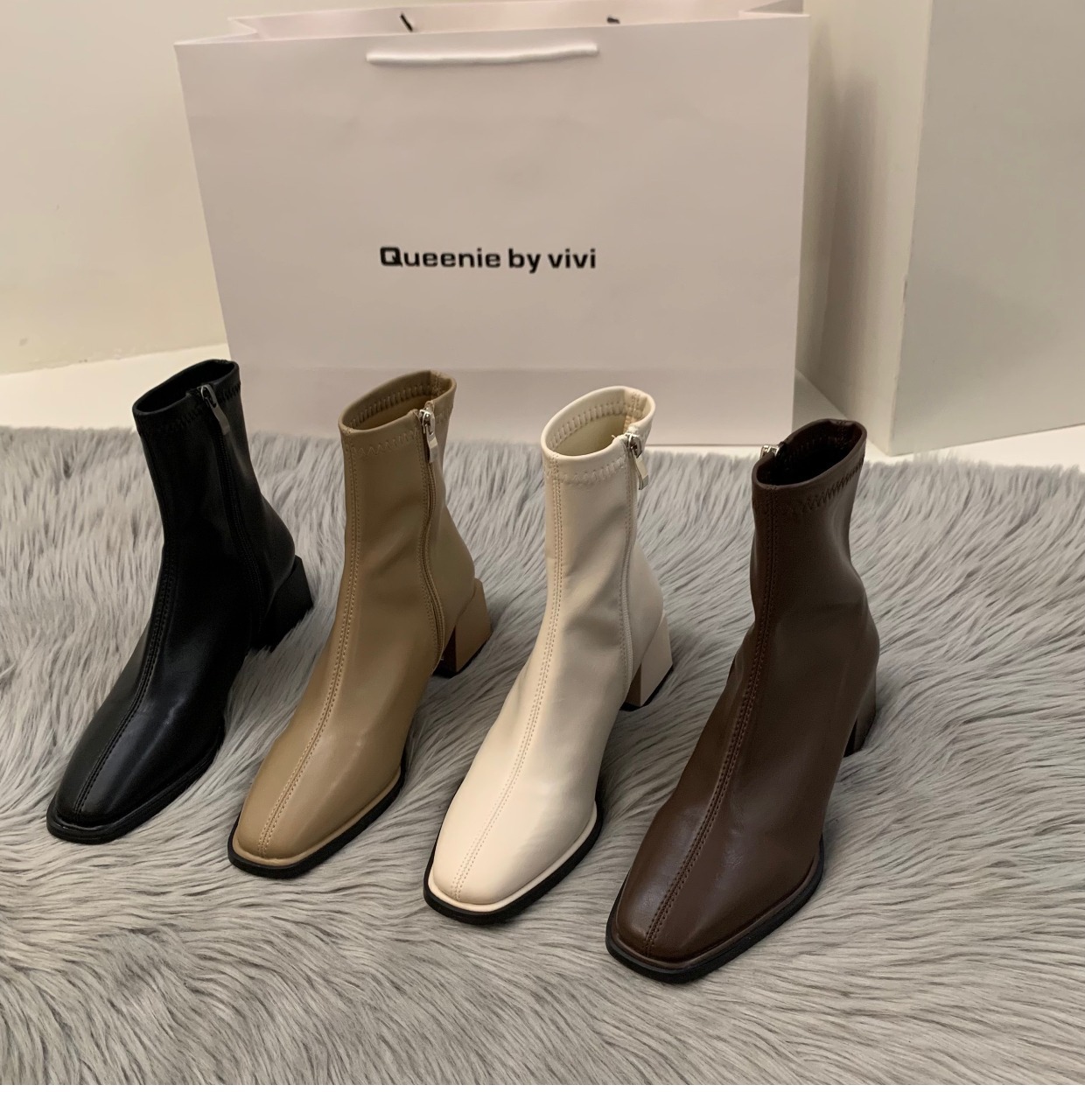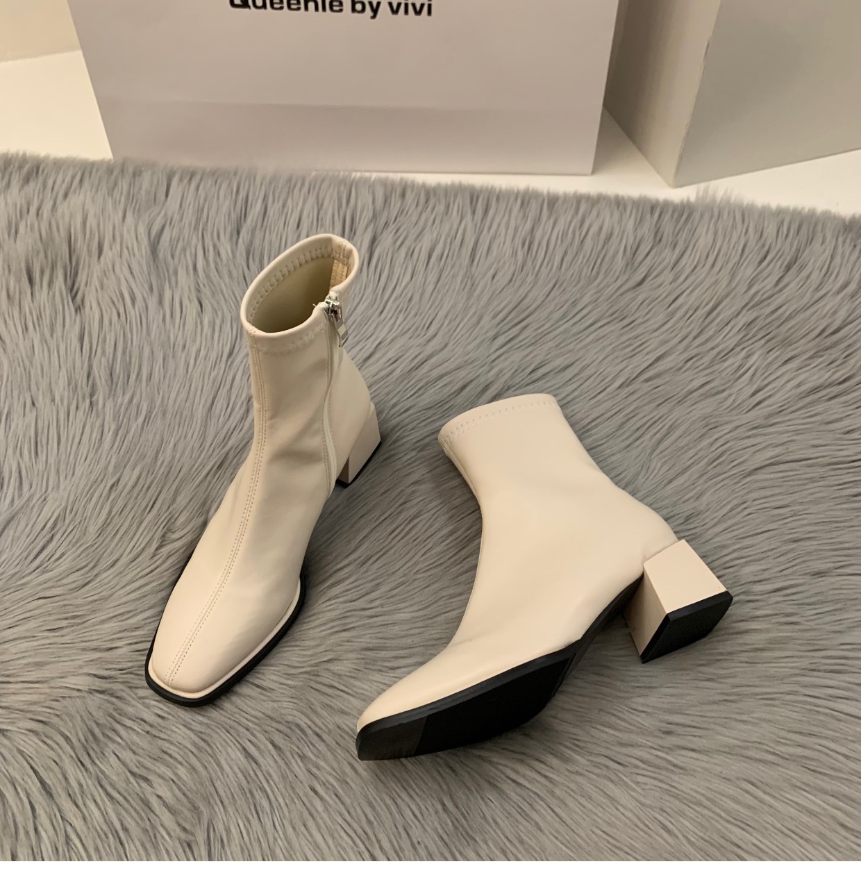 白色高跟方头瘦瘦法式小短靴女鞋2023新款春秋季单靴棕色马丁靴子