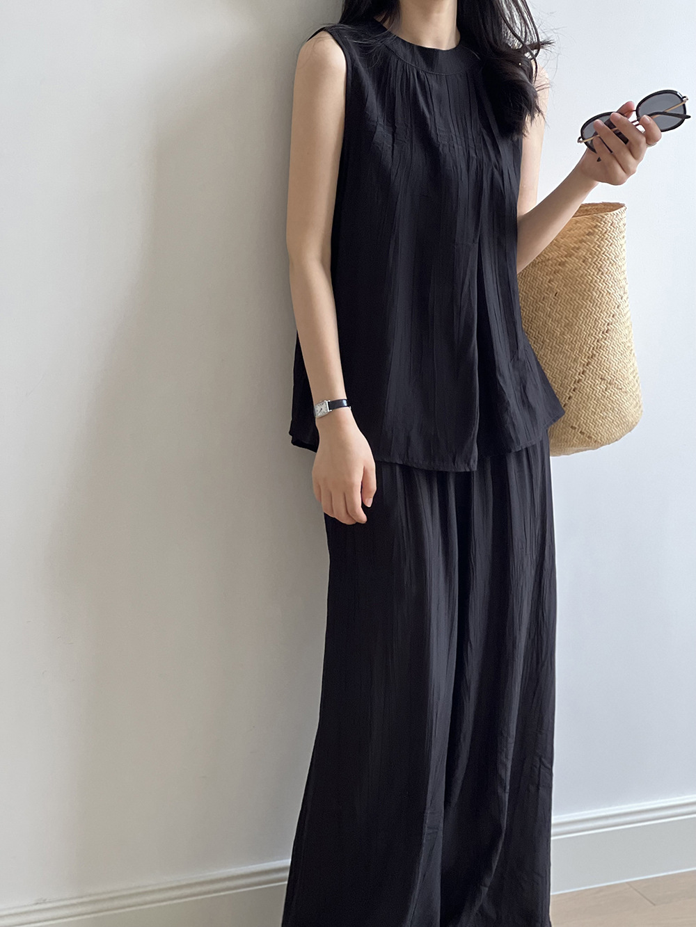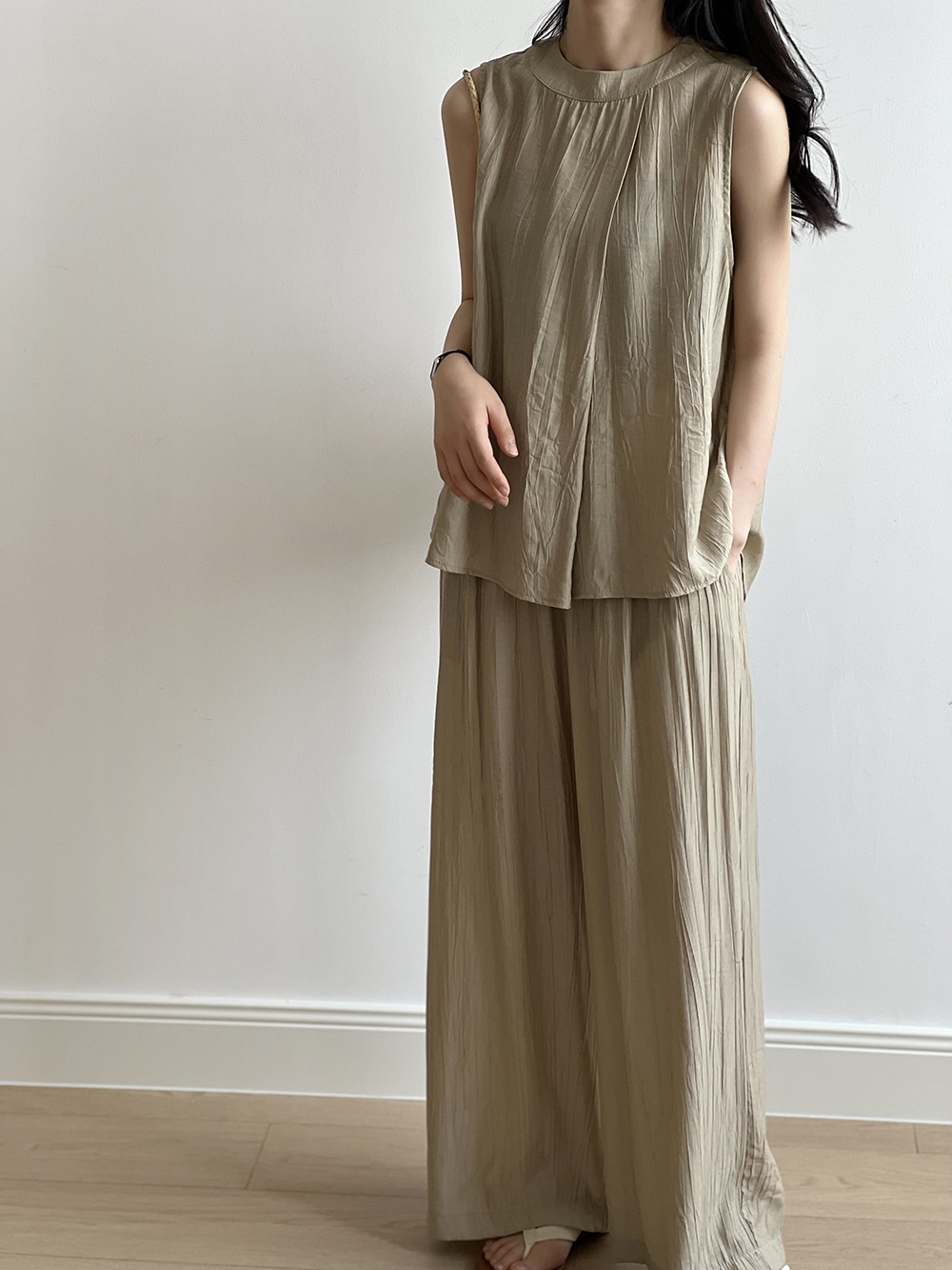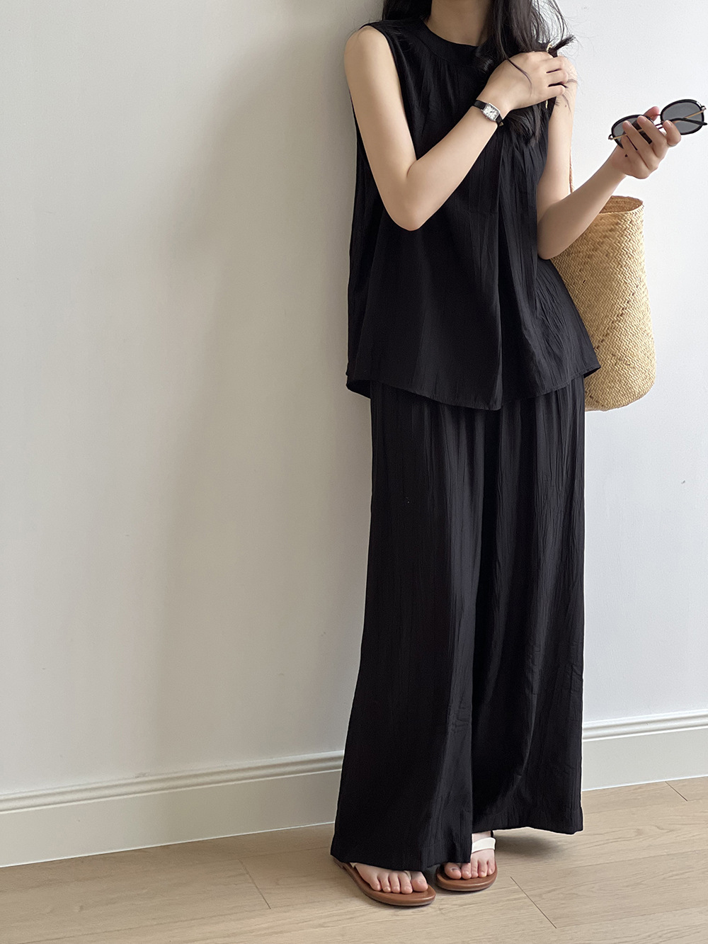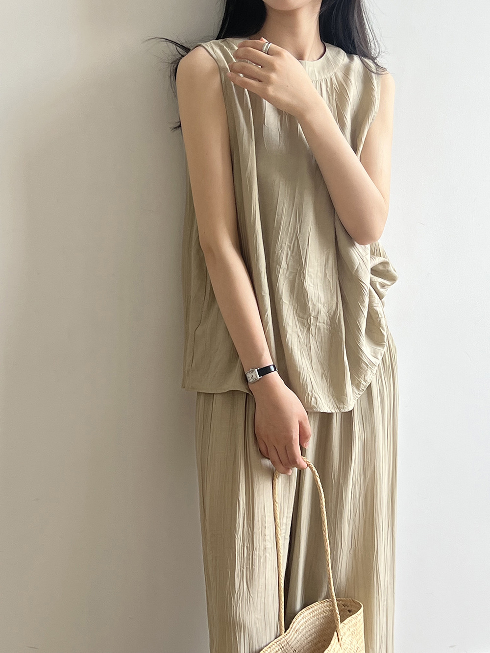 【商品名】【ボトムス】気質よい シャーリング ノースリーブ Tシャツ + パンツ 上下セット