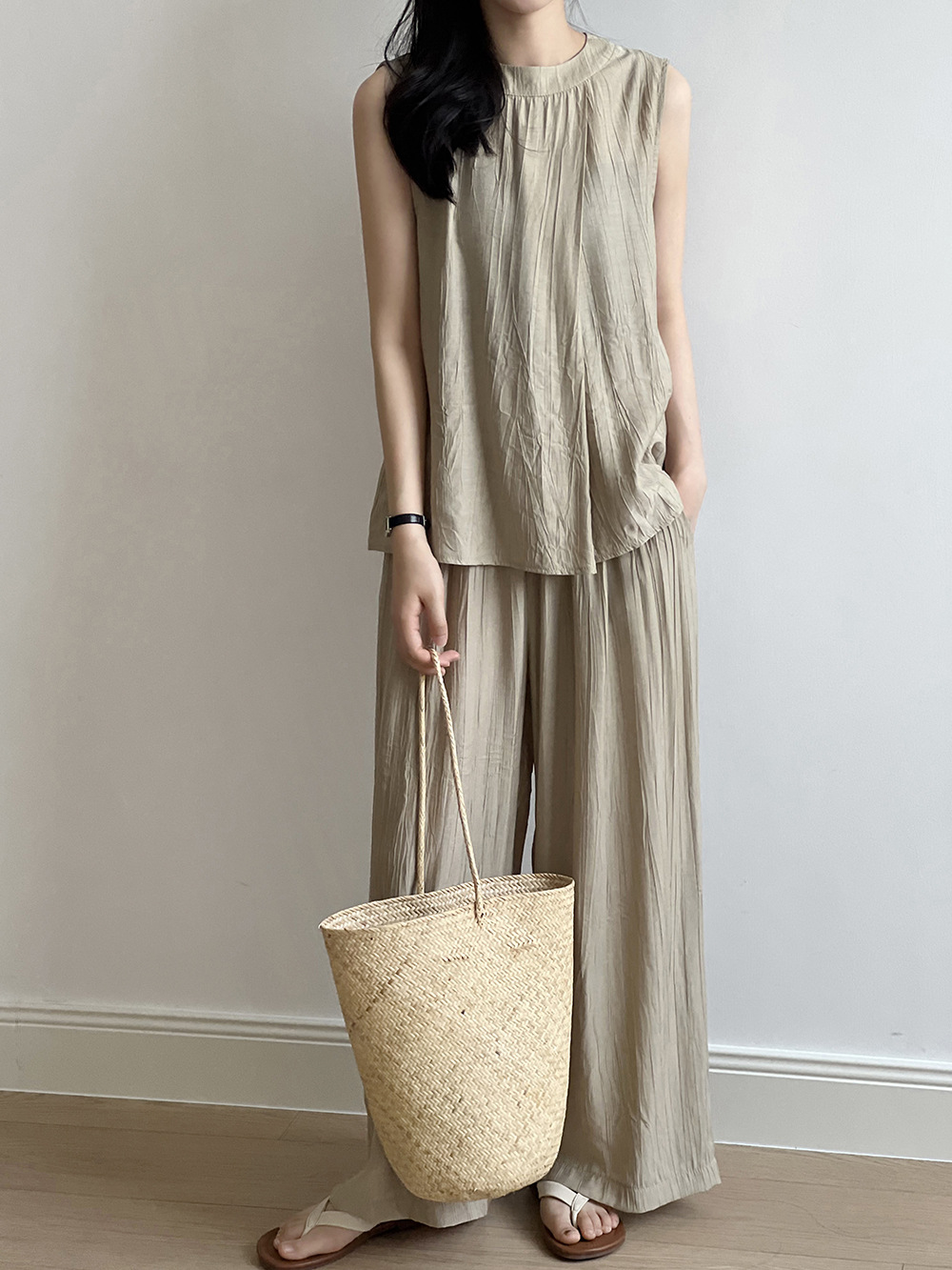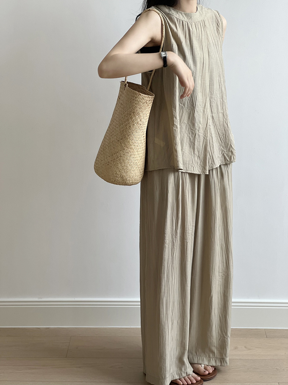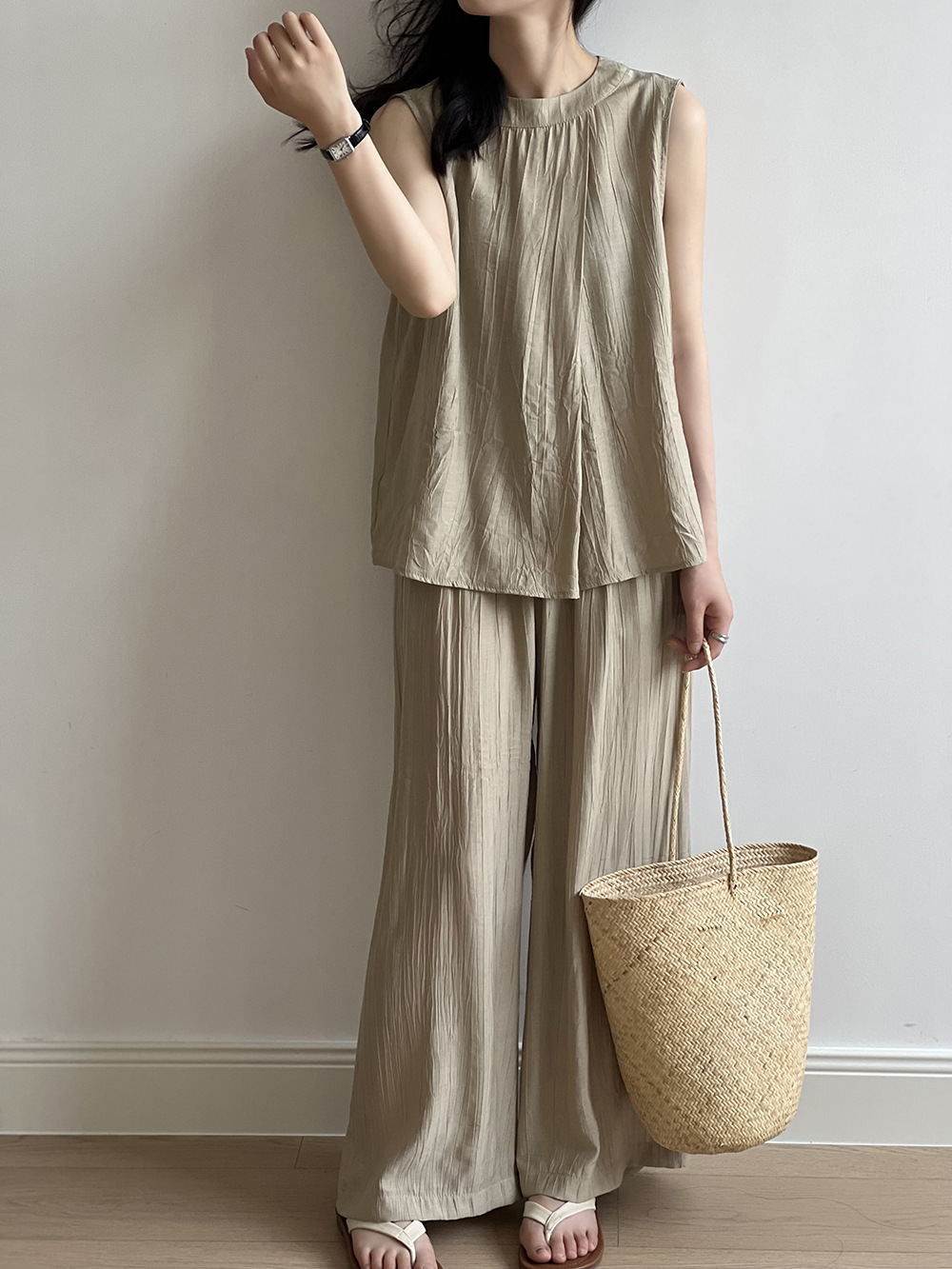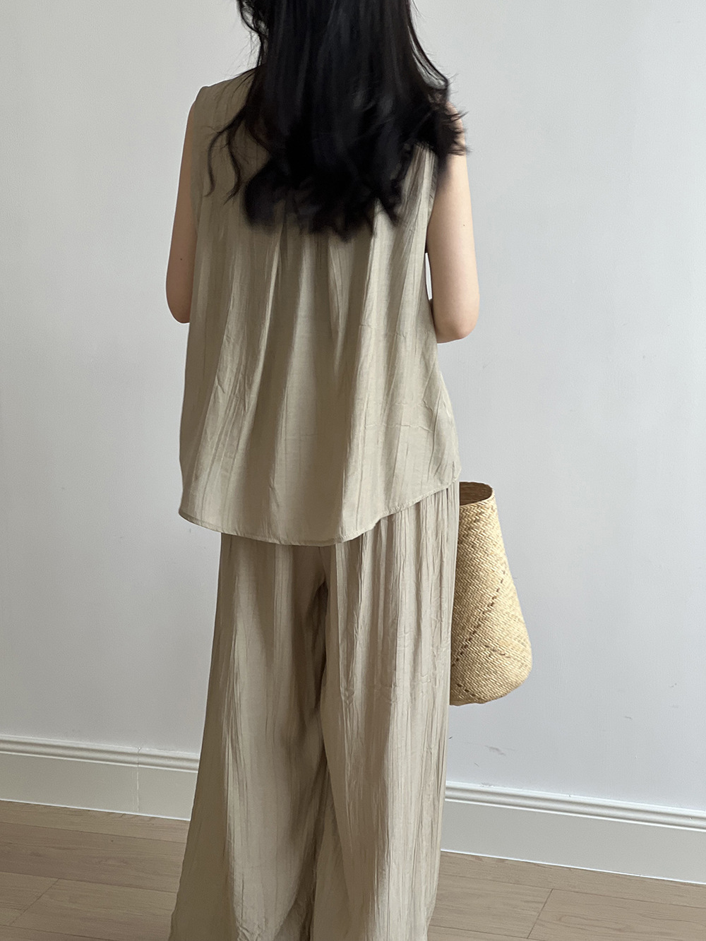 【商品名】【ボトムス】気質よい シャーリング ノースリーブ Tシャツ + パンツ 上下セット