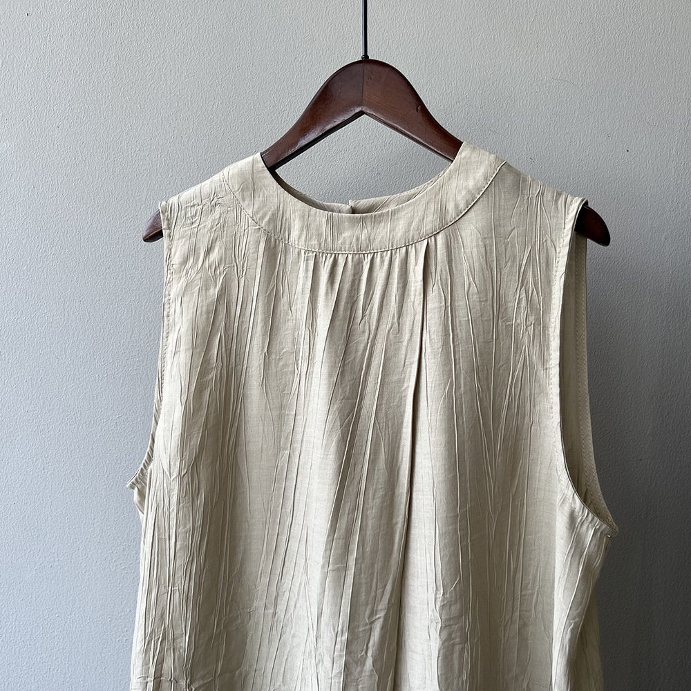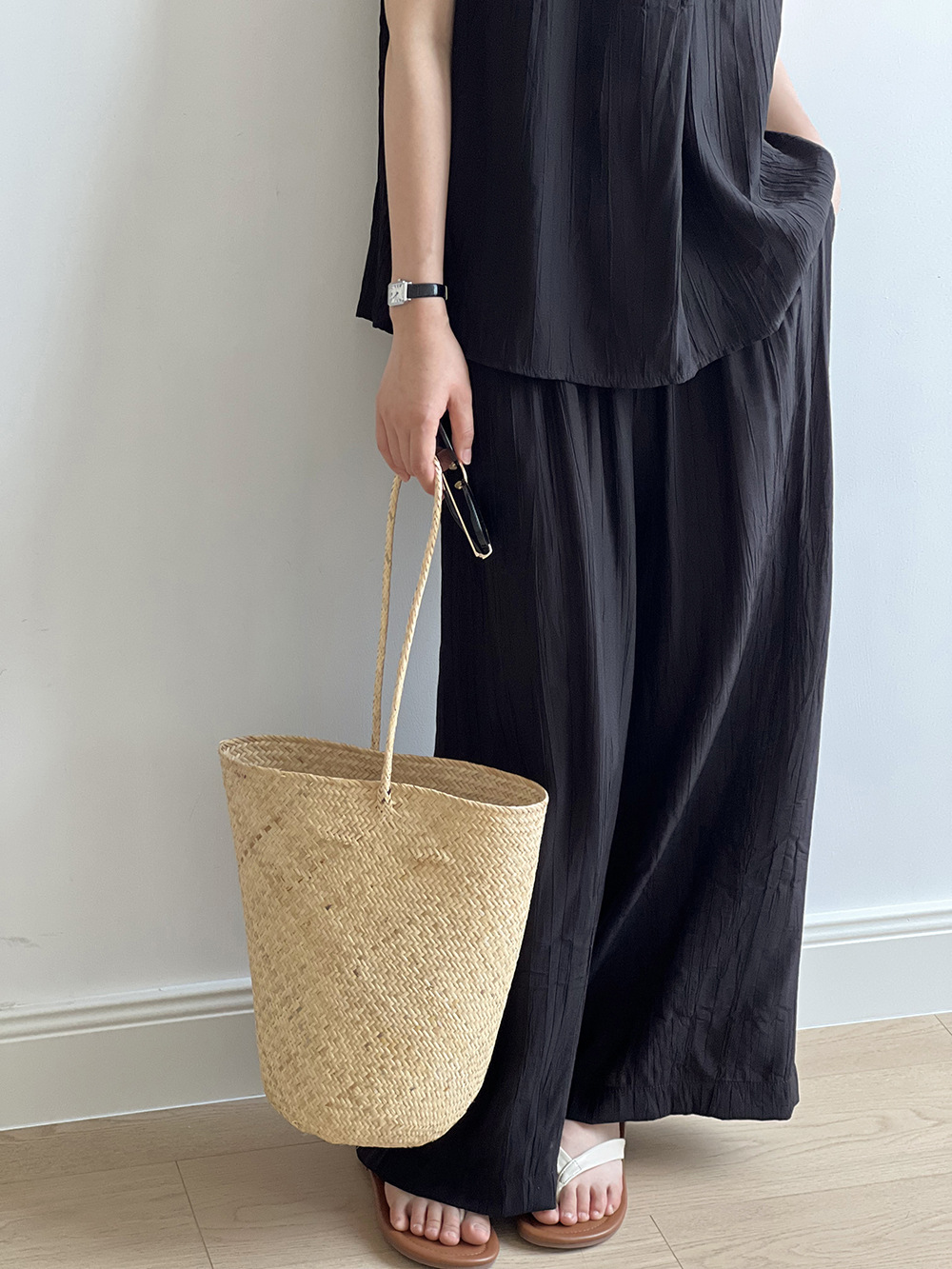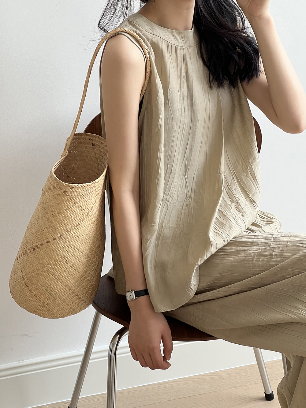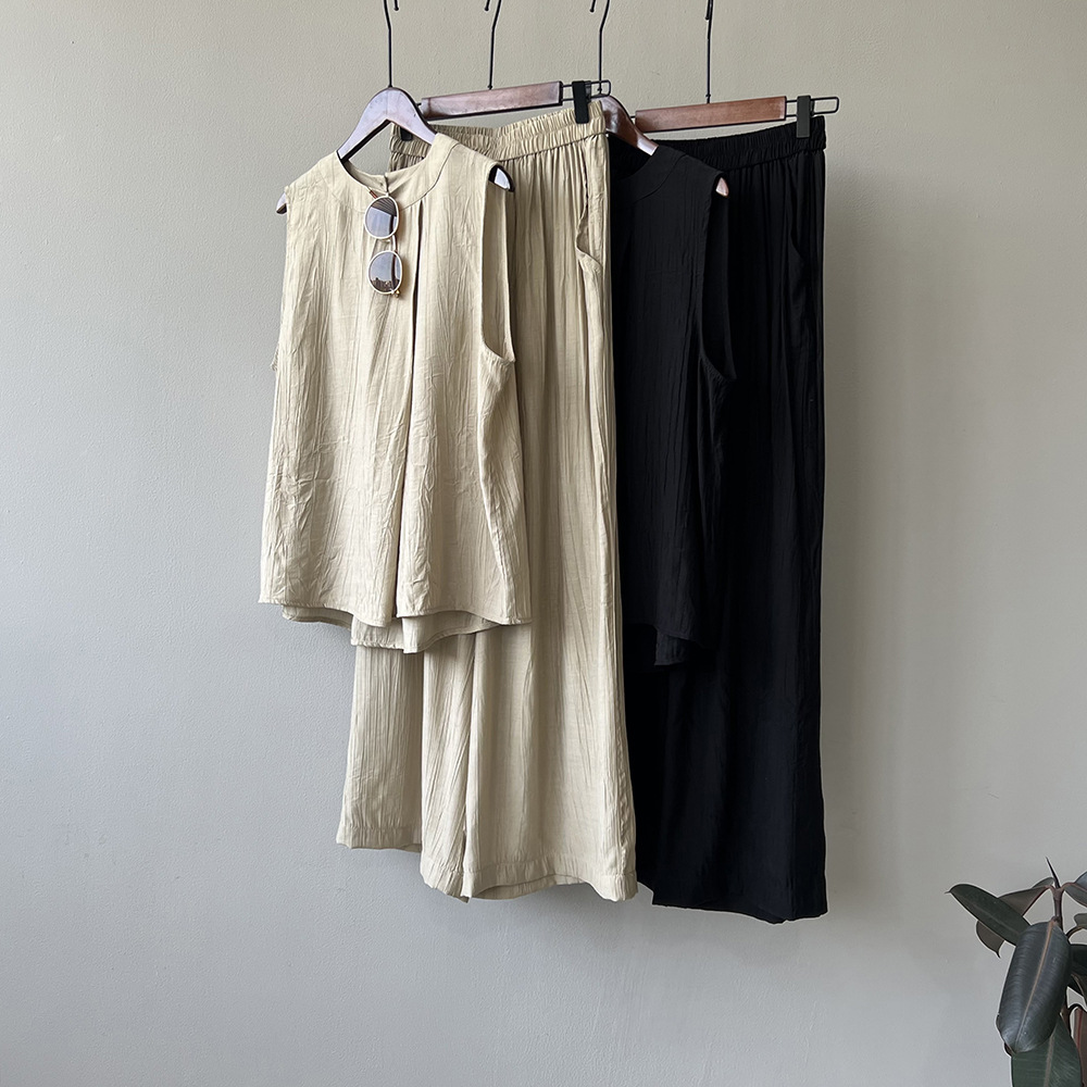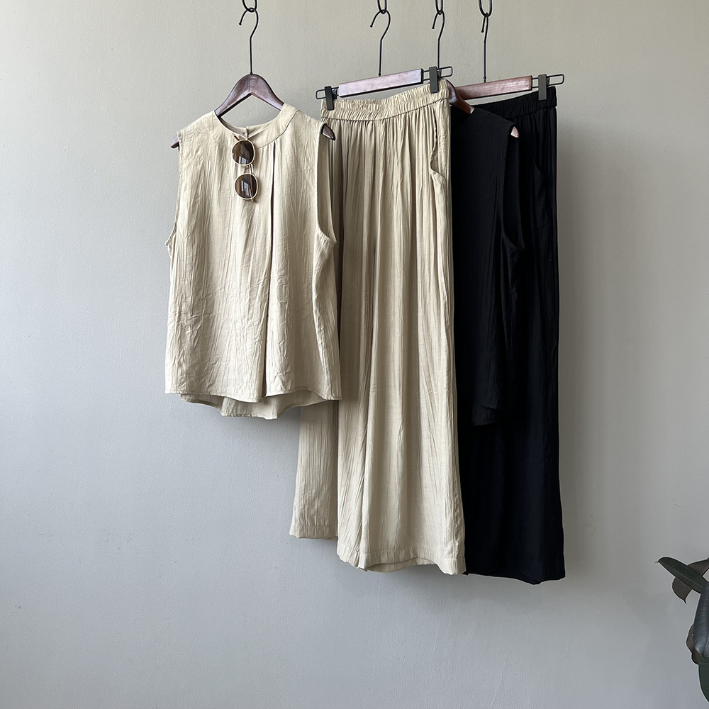 【商品名】【ボトムス】気質よい シャーリング ノースリーブ Tシャツ + パンツ 上下セット