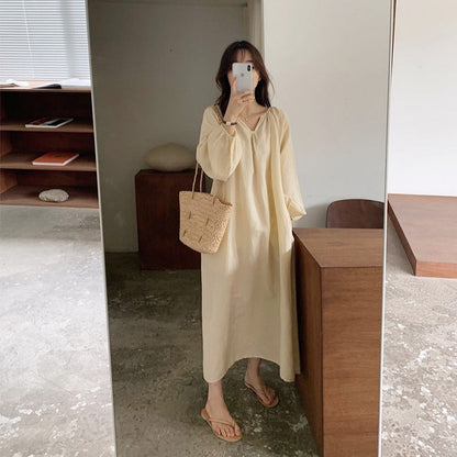 【ワンピース】夏 日系 コットン 無地 ルームウェア 長袖ワンピース