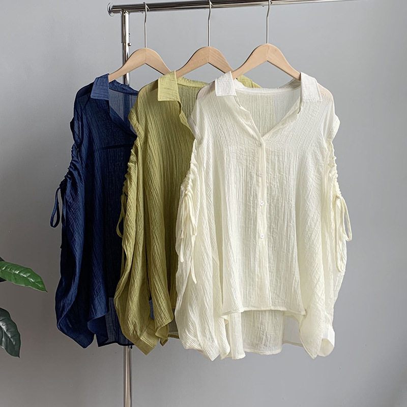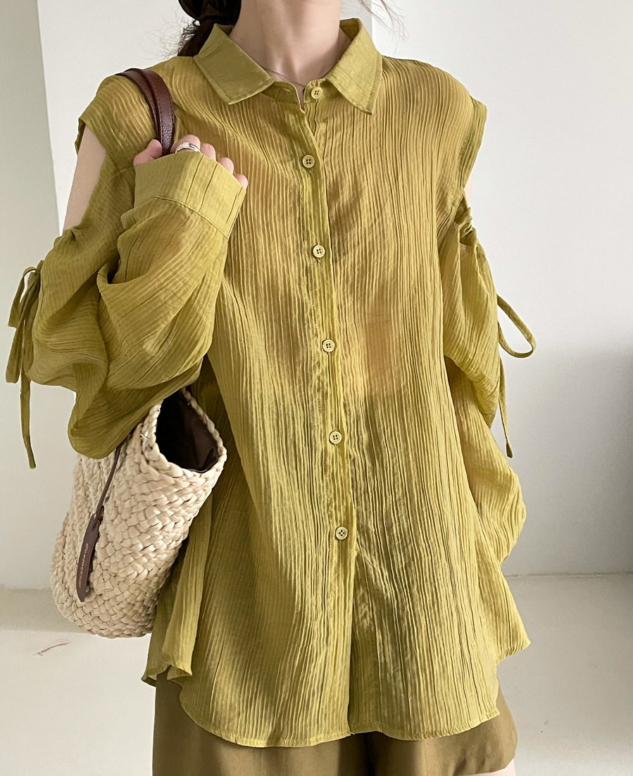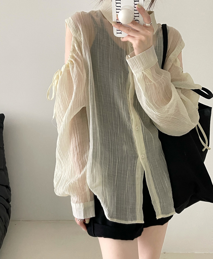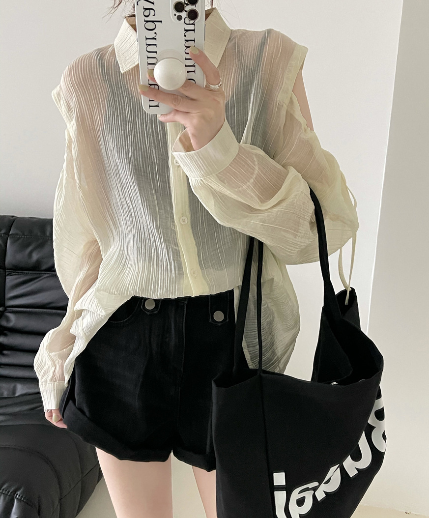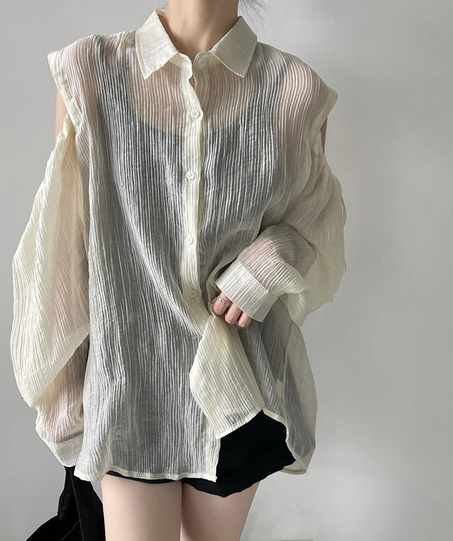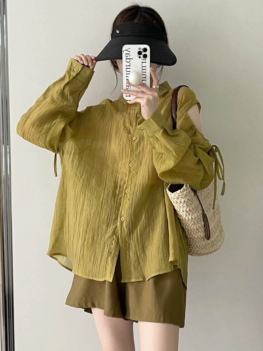 【商品名】【トップス】無地 薄手 オフショルダー ルーズ 日焼け止め シャツ