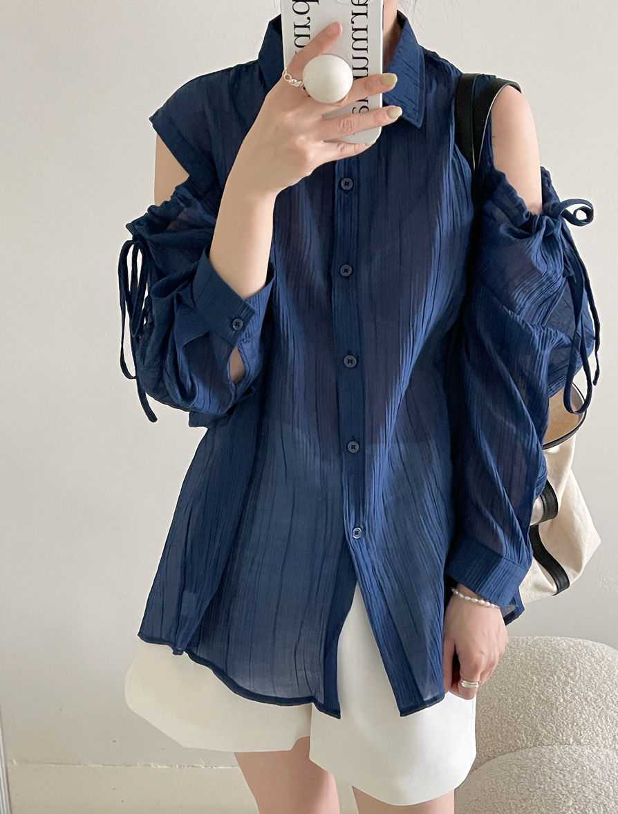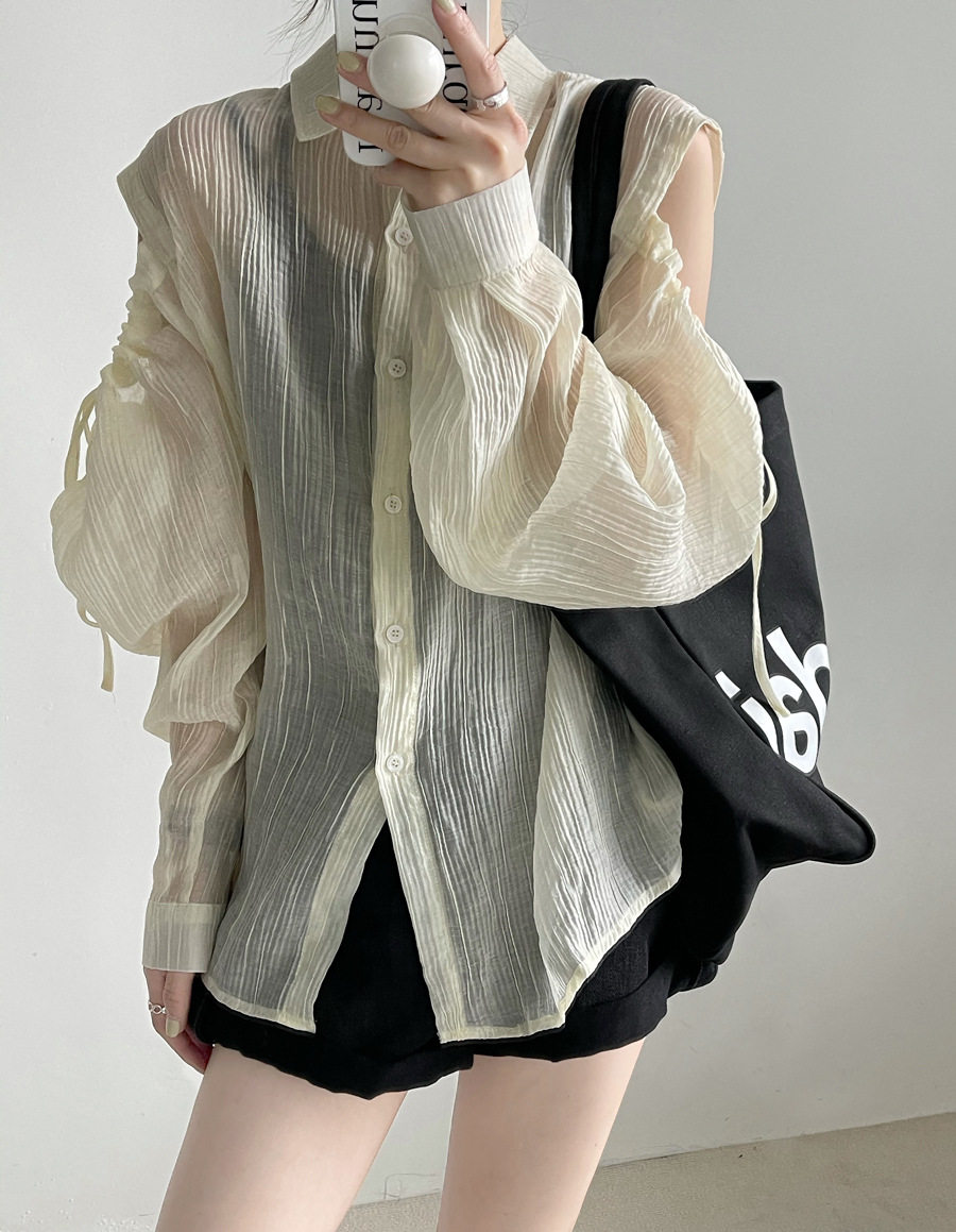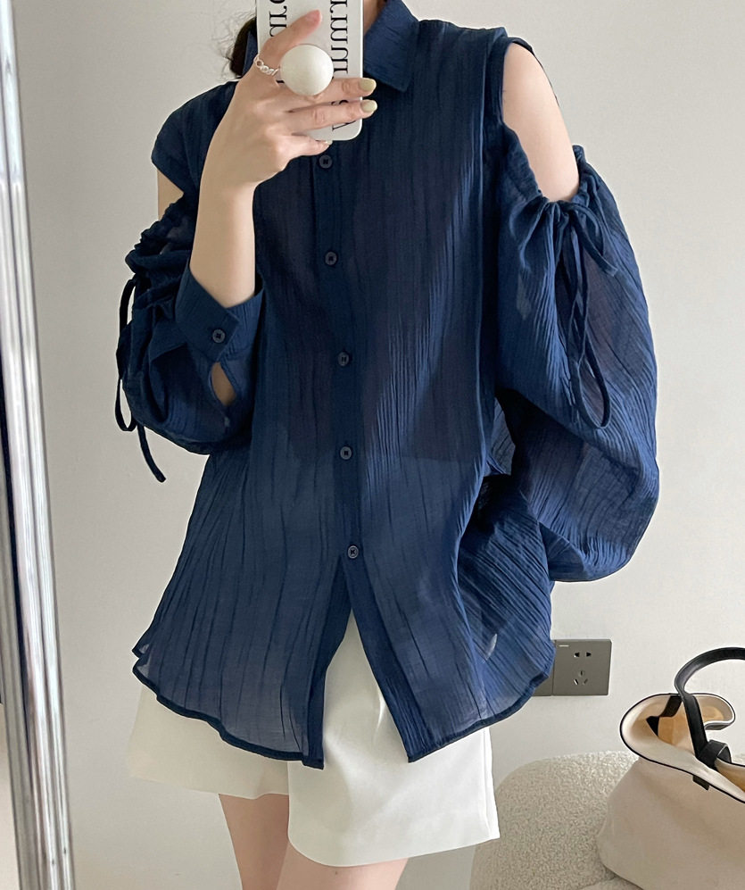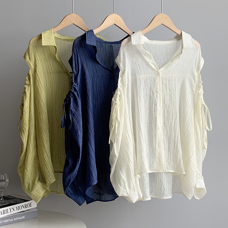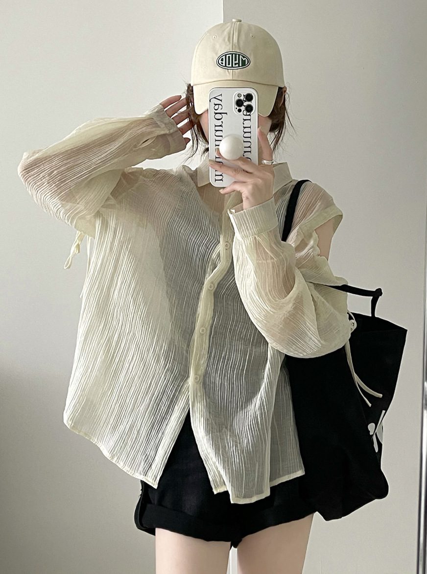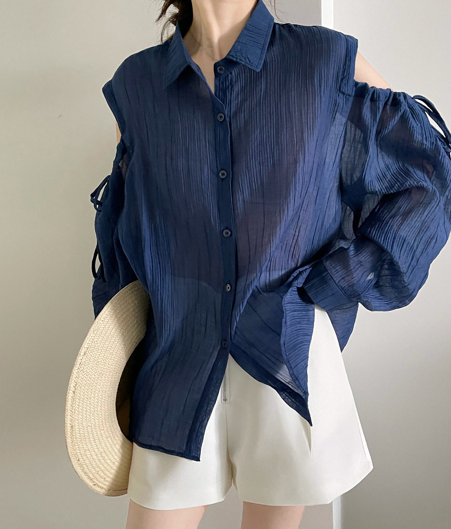 【商品名】【トップス】無地 薄手 オフショルダー ルーズ 日焼け止め シャツ