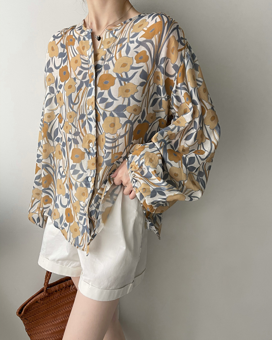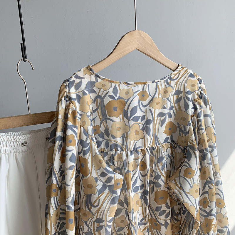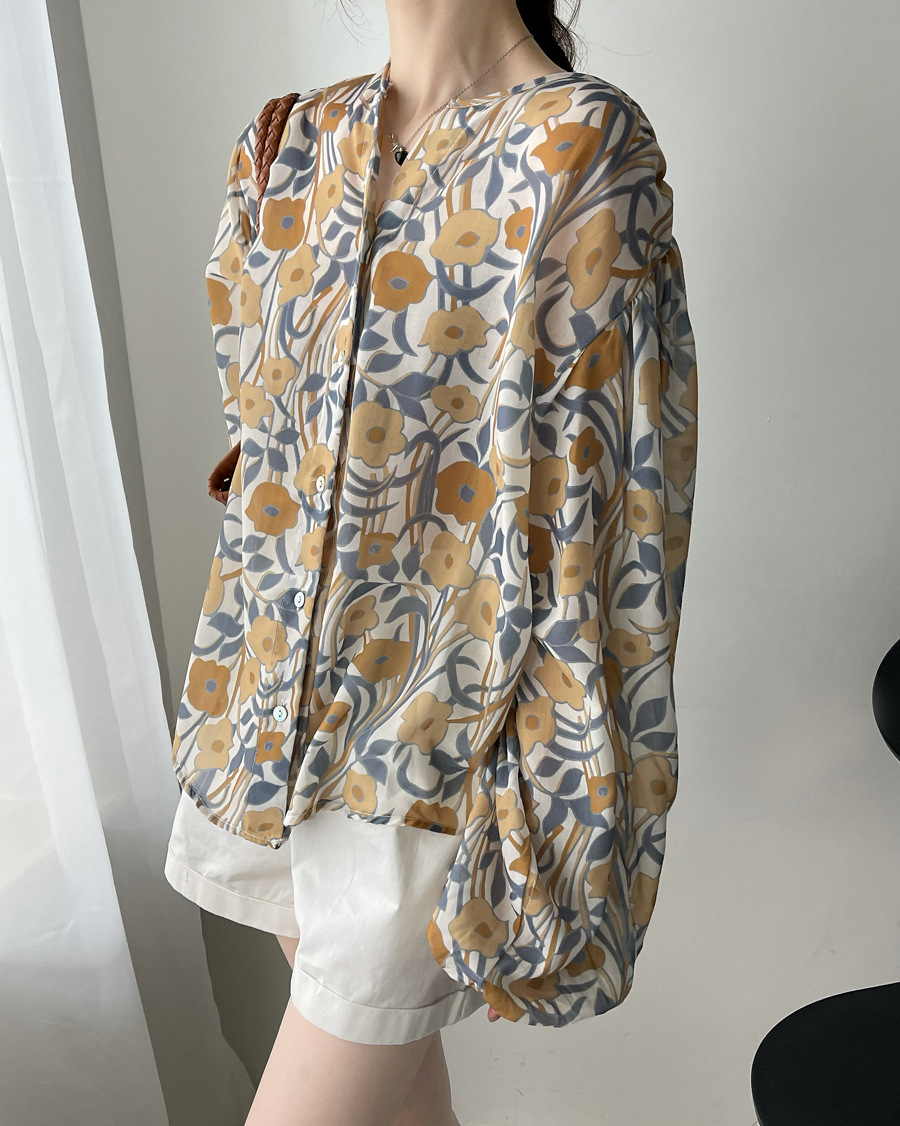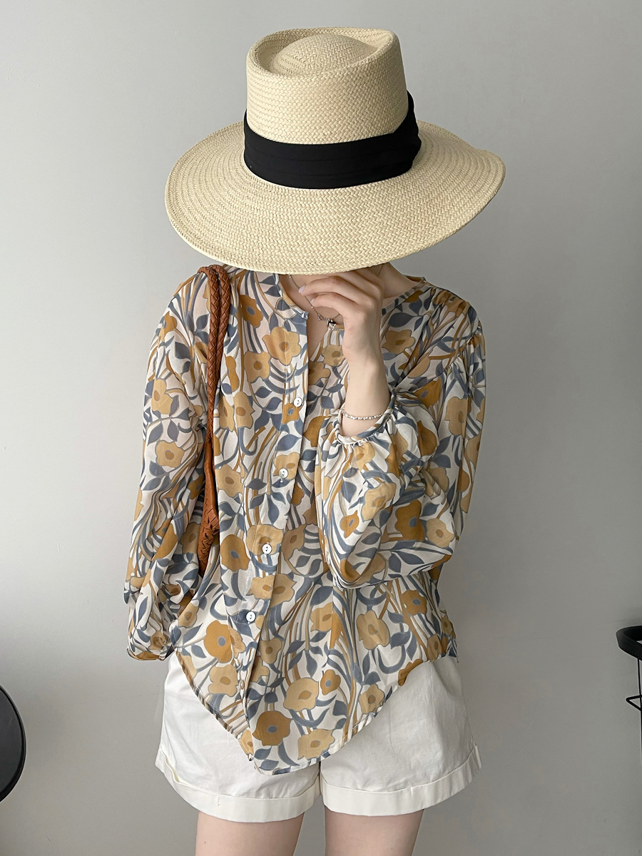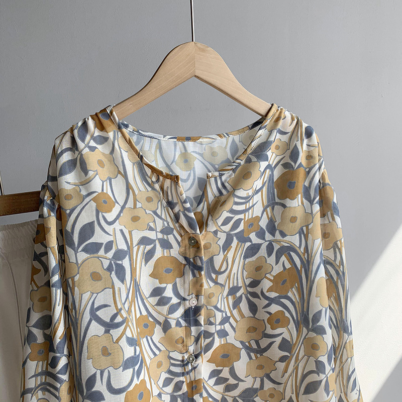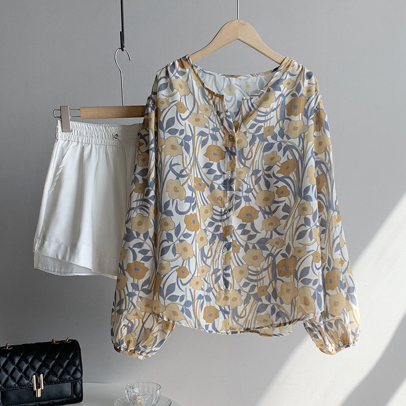 【トップス】春秋 Vネック 花柄 日焼け止め 長袖 レトロ シャツ【JZシリーズ】