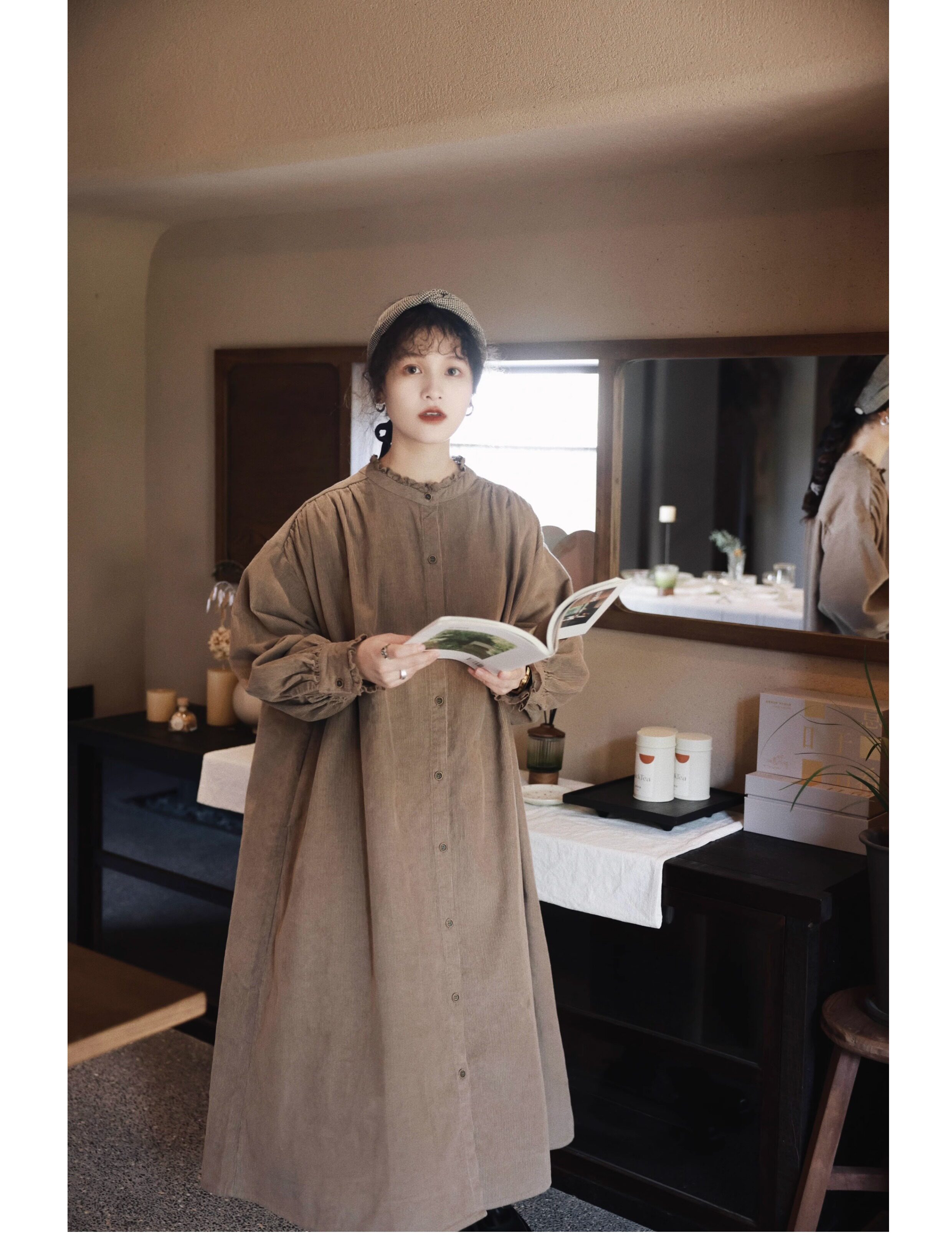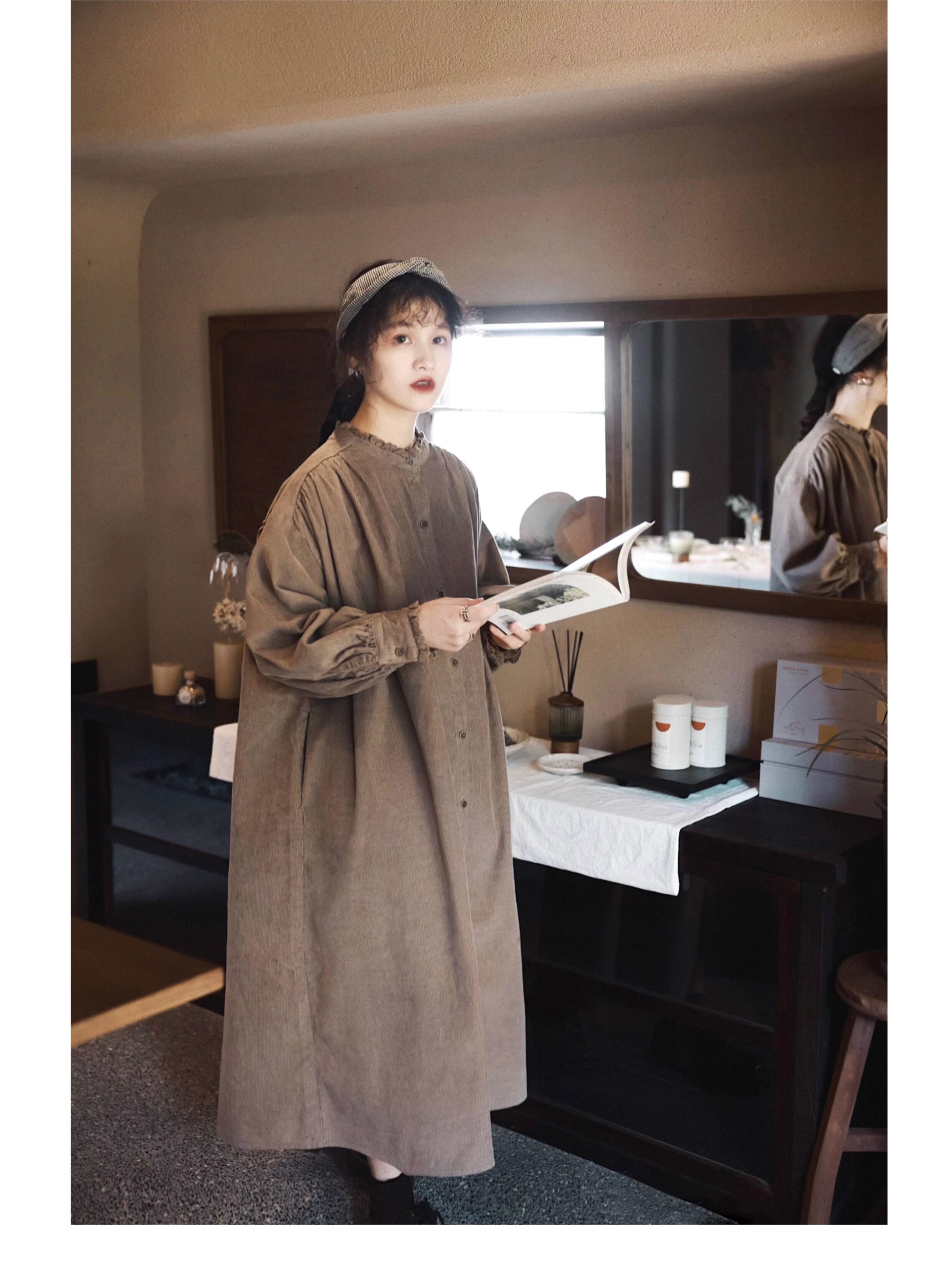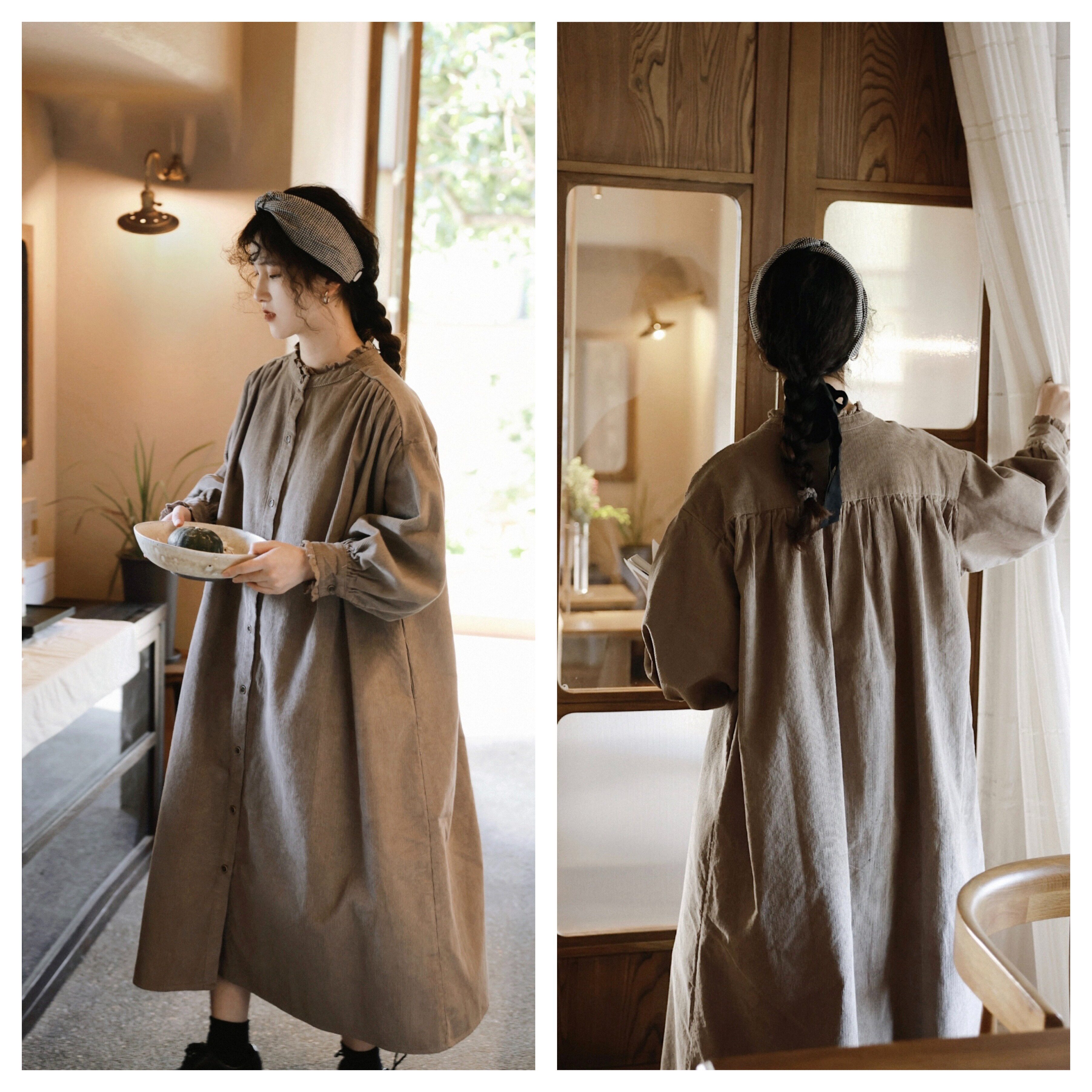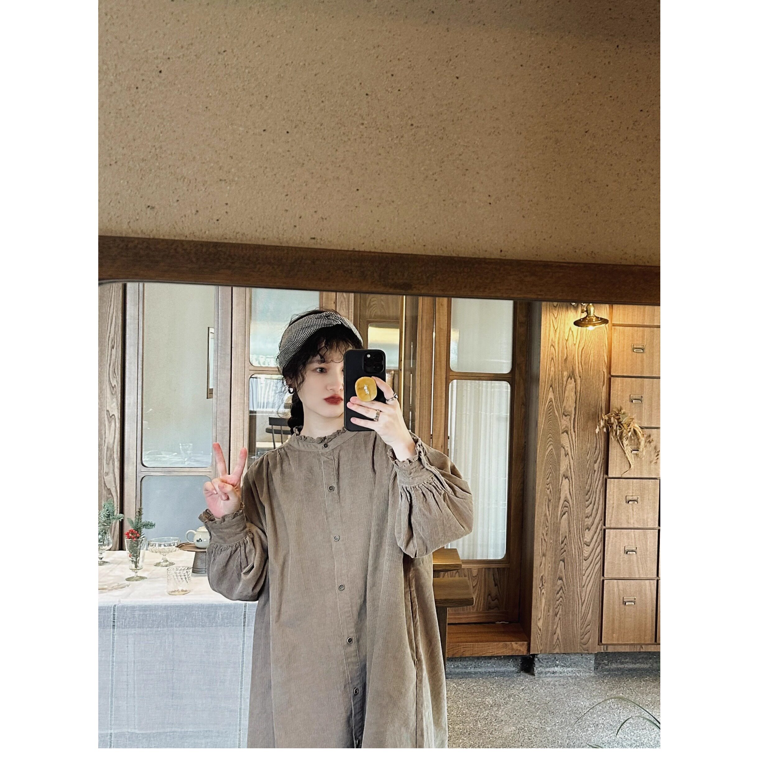 【商品名】【ワンピース】日系 レトロ 文芸スタイル スタンドネック 長袖ワンピース