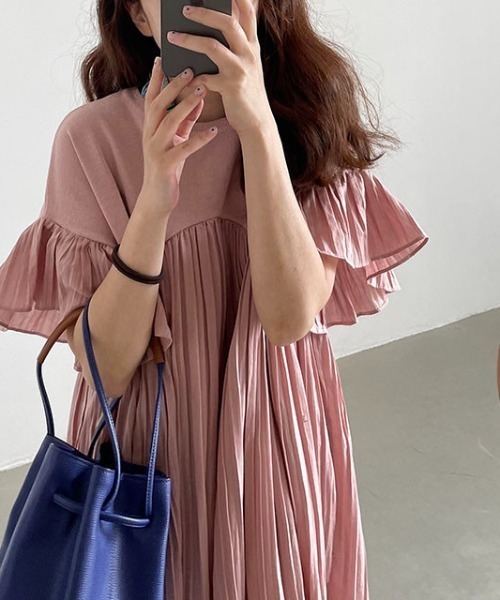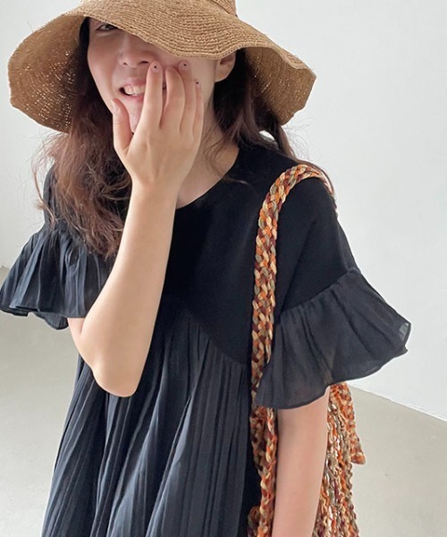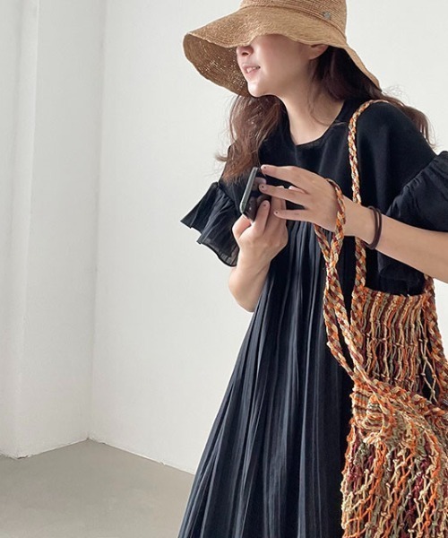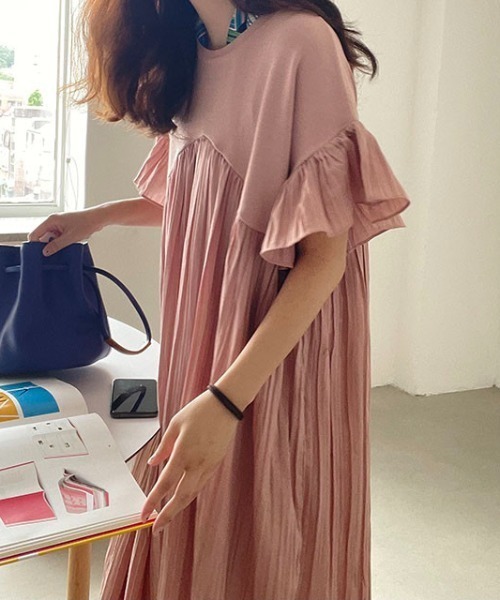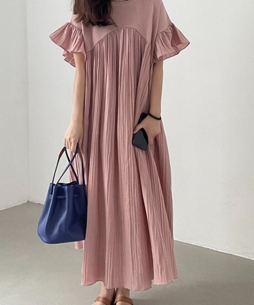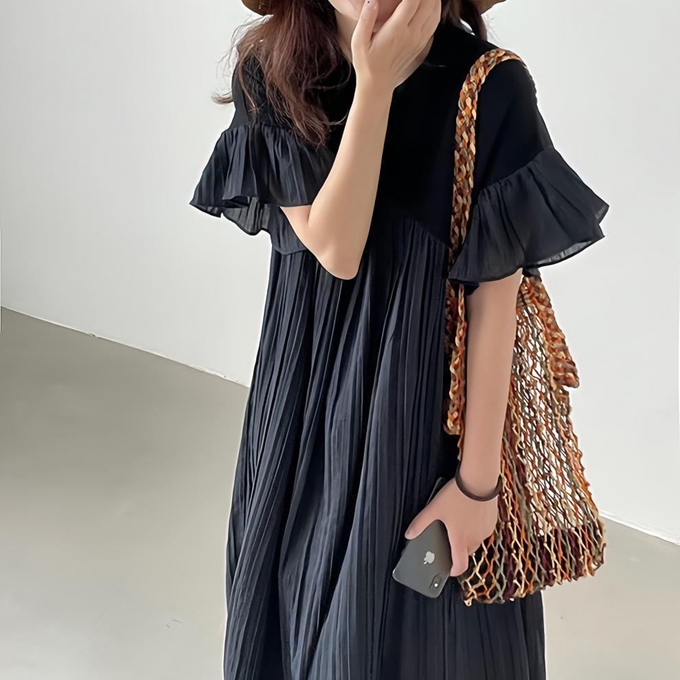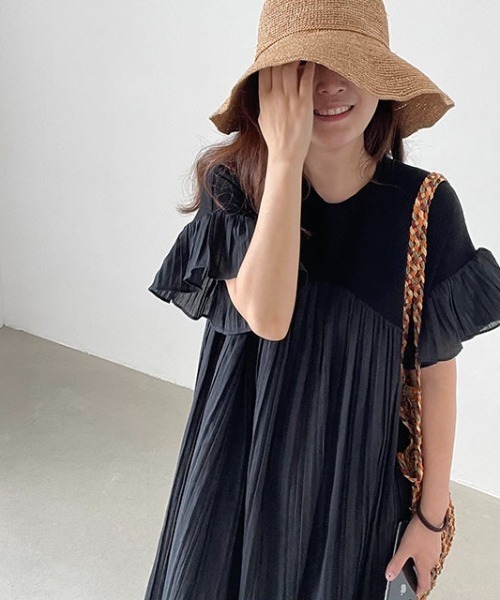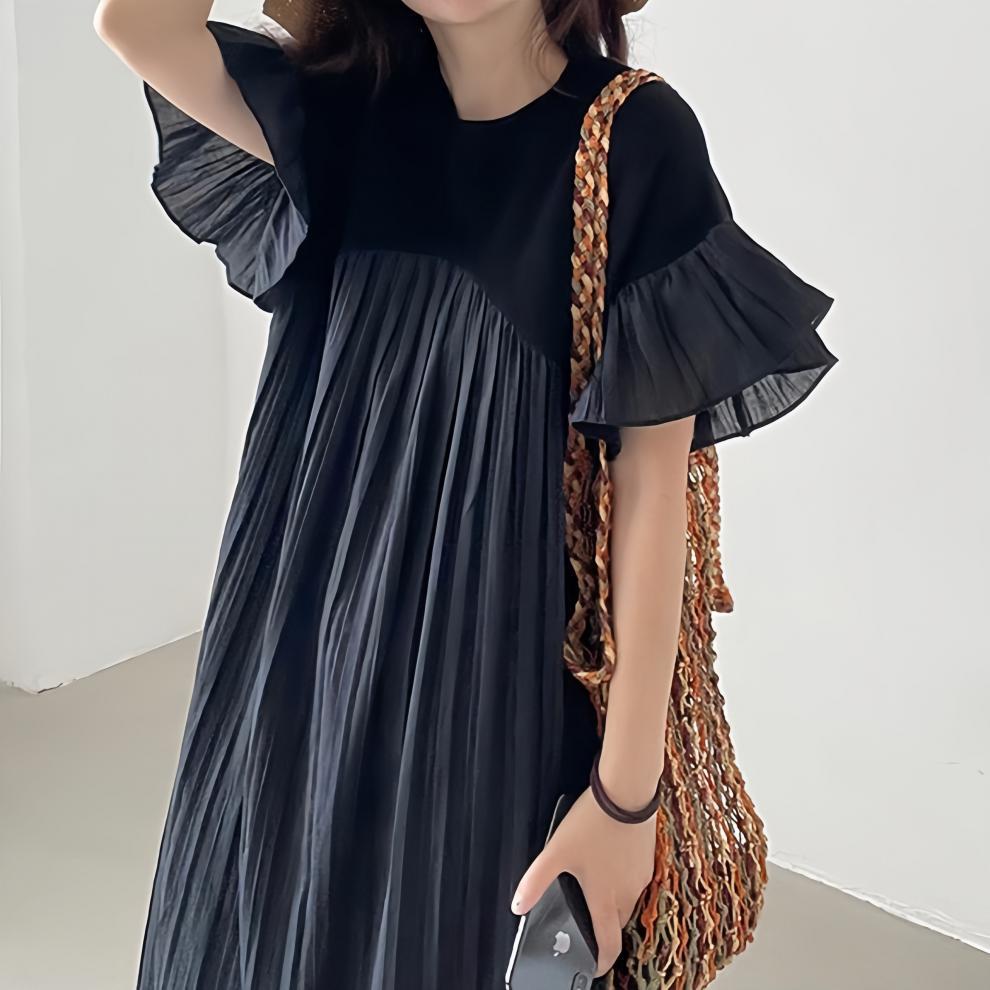 【ワンピース】夏 ゆったり プリーツ 切り替え 半袖ワンピース