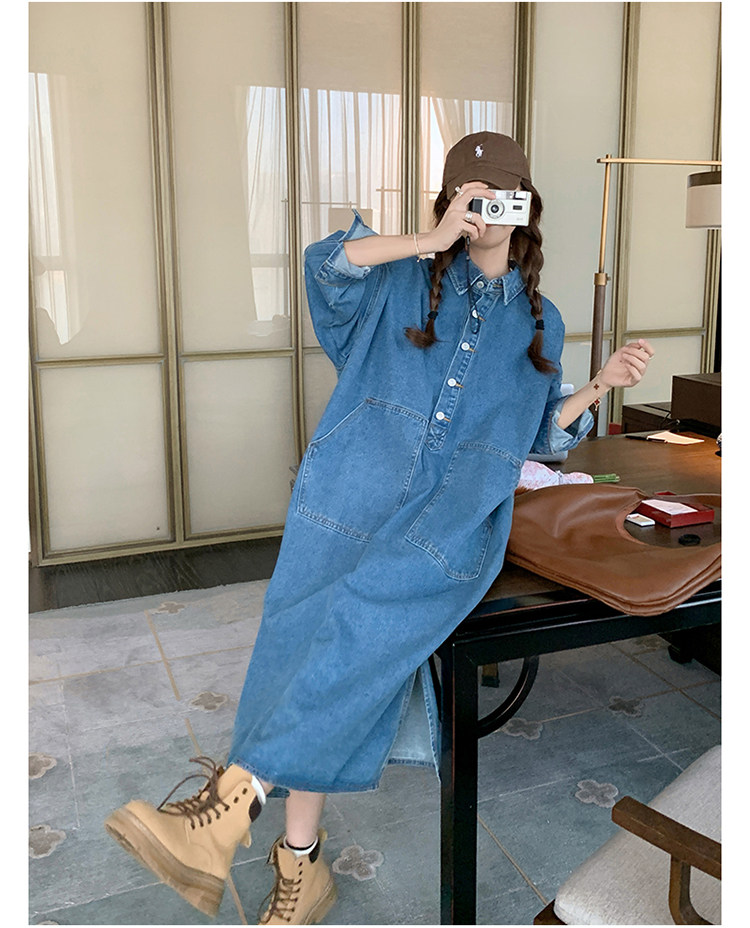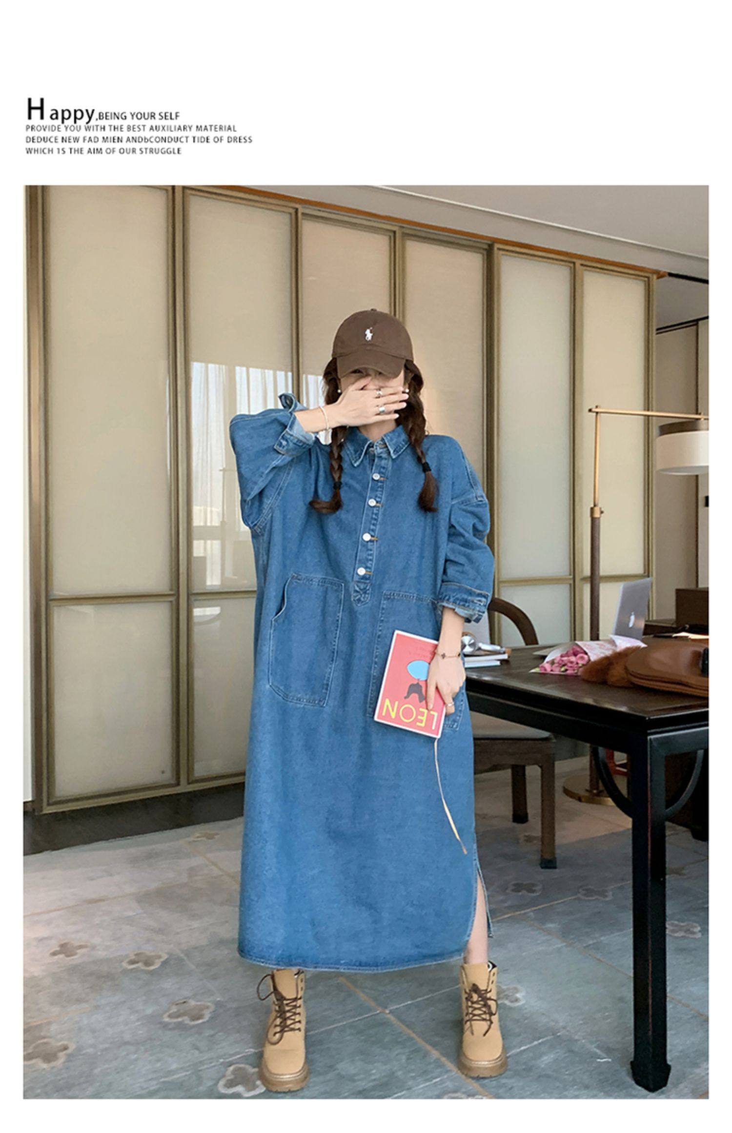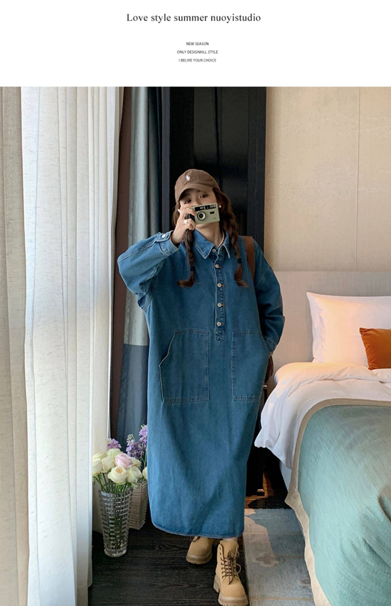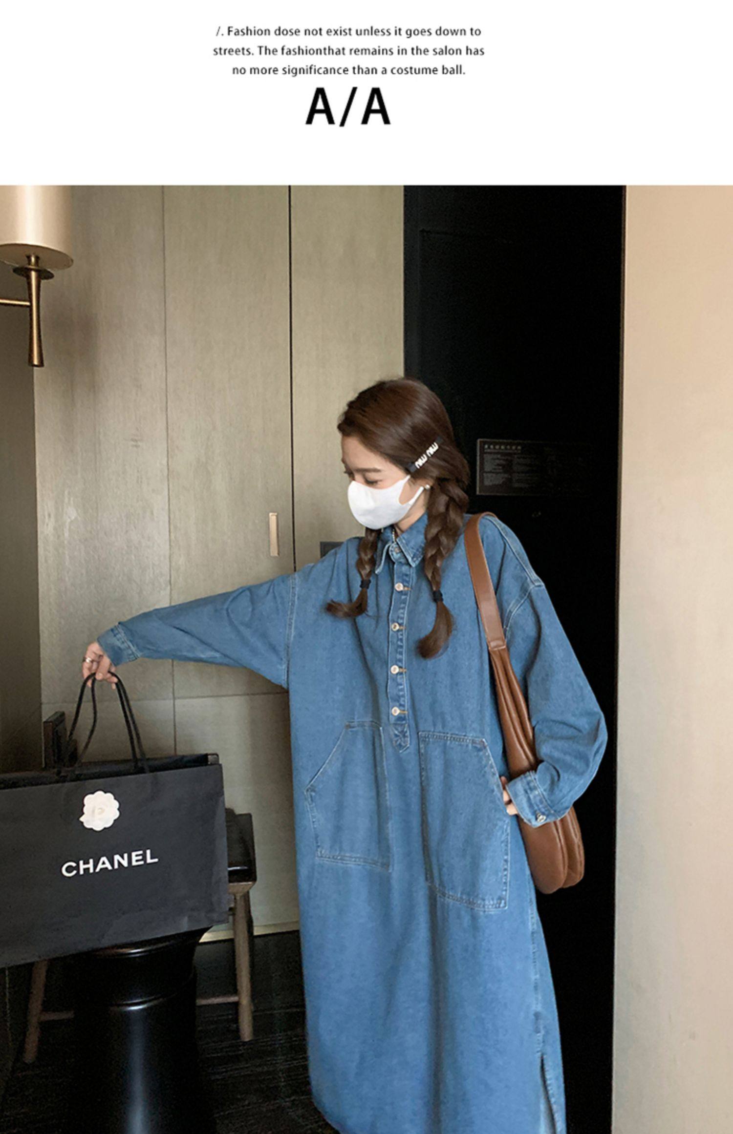 【ワンピース】春秋冬 ミドル丈 お腹カバー ゆったり 着痩せ 大きいサイズ デニム 長袖ワンピース