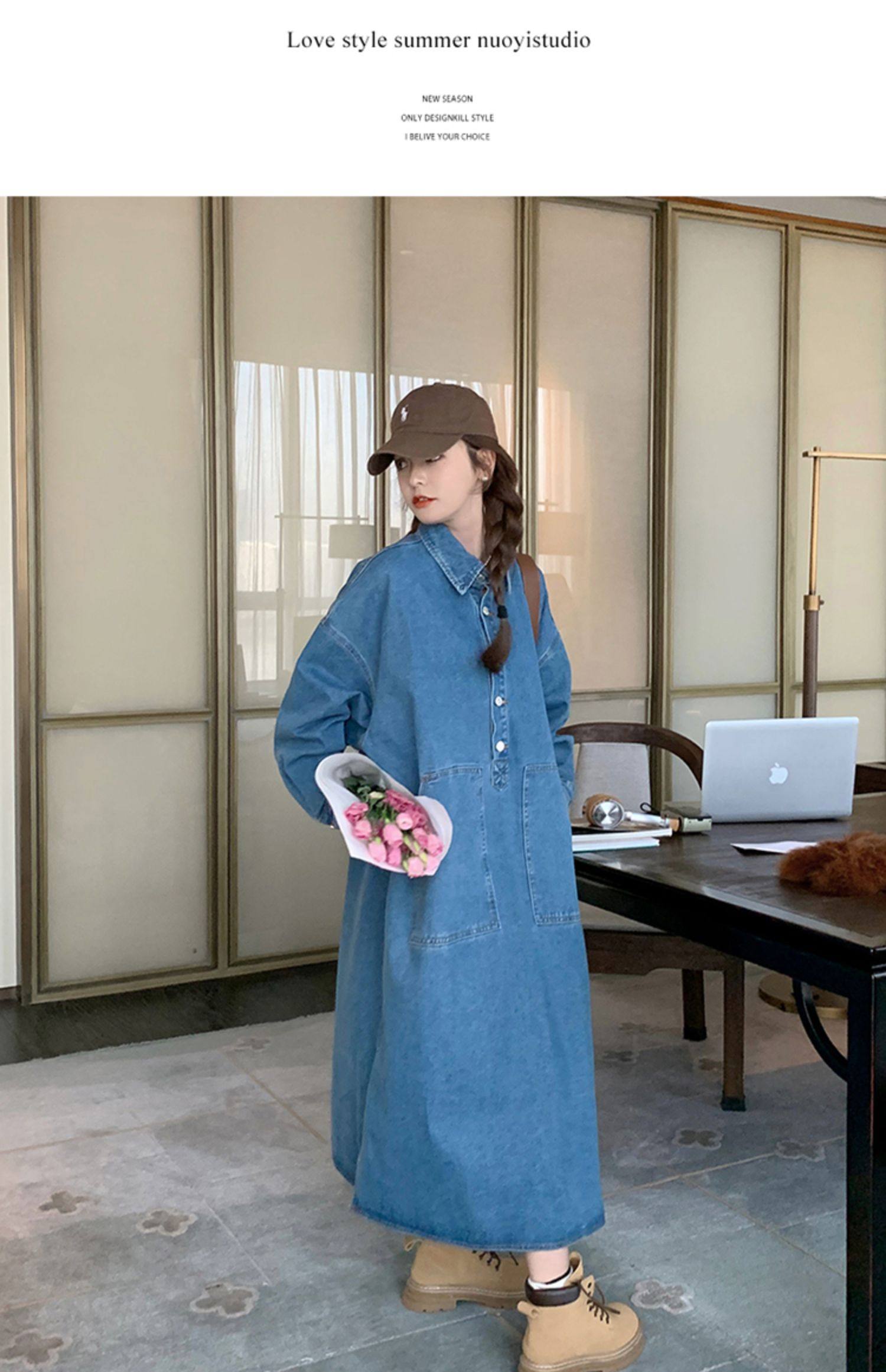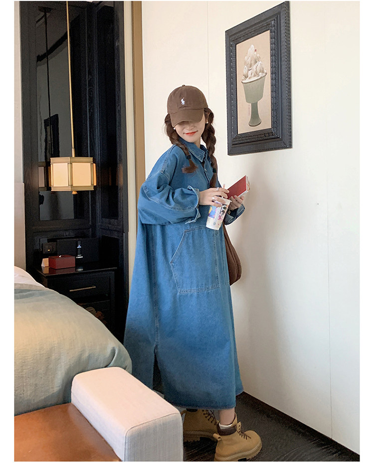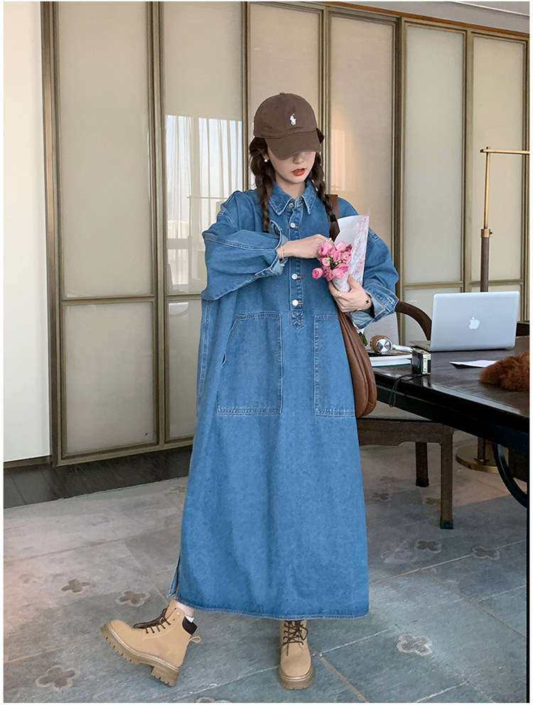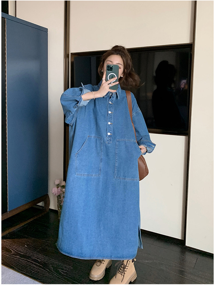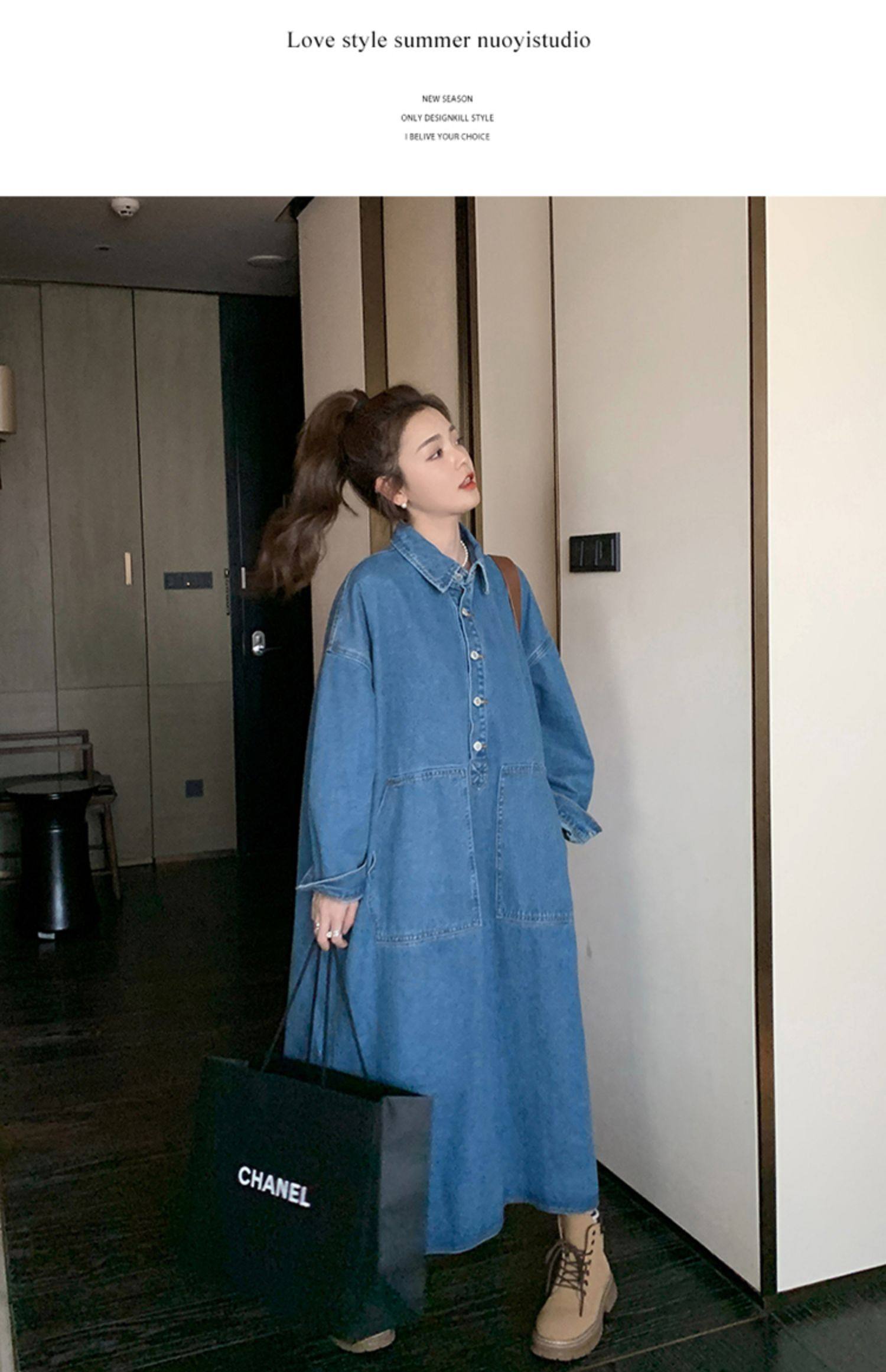 【ワンピース】春秋冬 ミドル丈 お腹カバー ゆったり 着痩せ 大きいサイズ デニム 長袖ワンピース