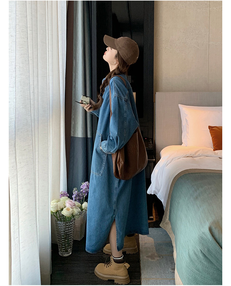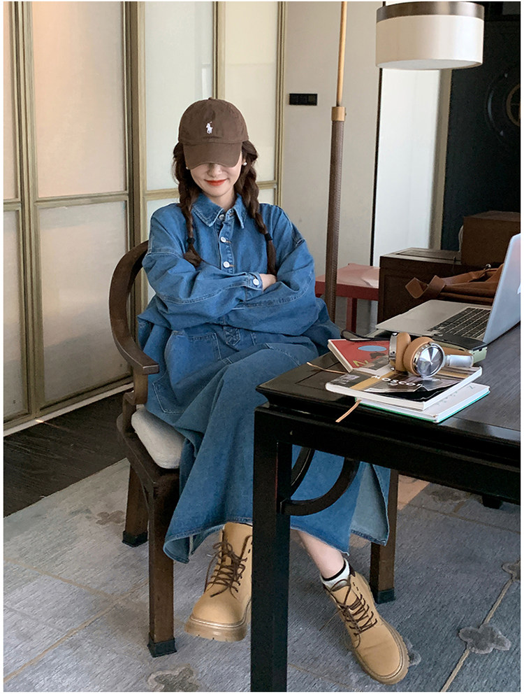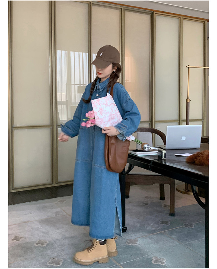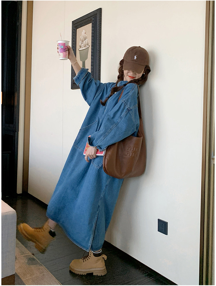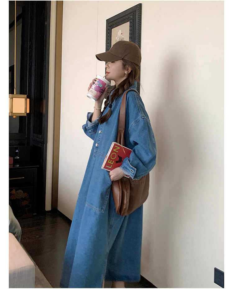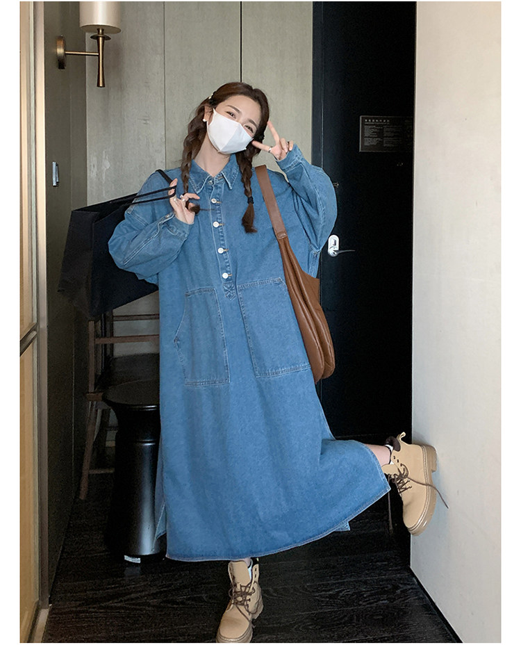 【ワンピース】春秋冬 ミドル丈 お腹カバー ゆったり 着痩せ 大きいサイズ デニム 長袖ワンピース