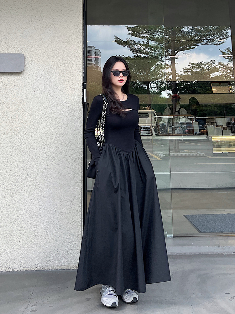 【ワンピース】ドローストリング付き ゆったりとした 春 秋 冬 切り替え 長袖 ワンピース 【AHシリーズ】