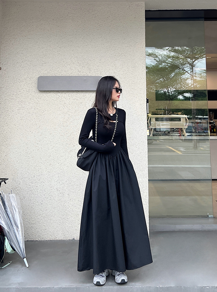 【ワンピース】細見え 日系 Vネック 無地 長袖ワンピース 切替デザイン ゆったり 気質ロング【JZシリーズ】【AHシリーズ】