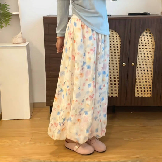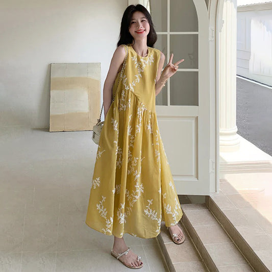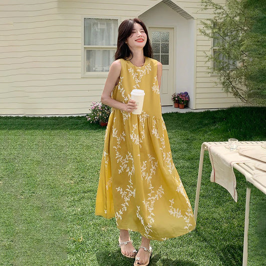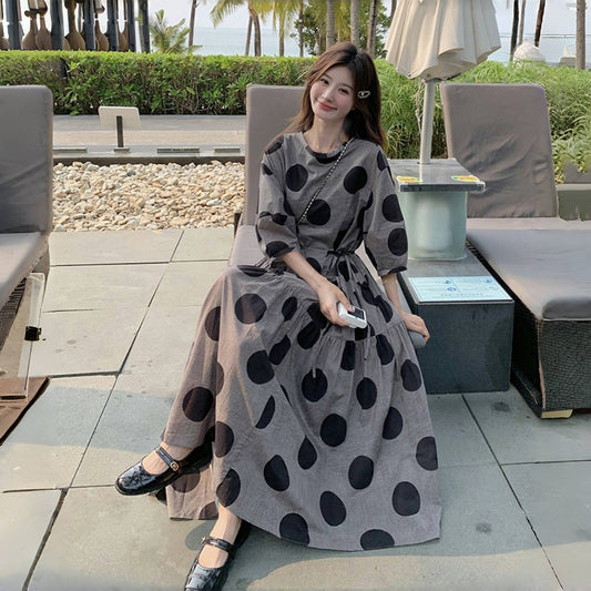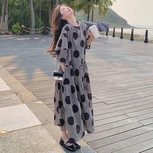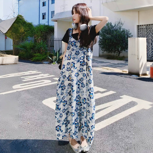 【ワンピース】韓国風 春秋新作 ゆったり大きめサイズ 体型カバー 花柄長袖ミディアムワンピース【SHシリーズ】