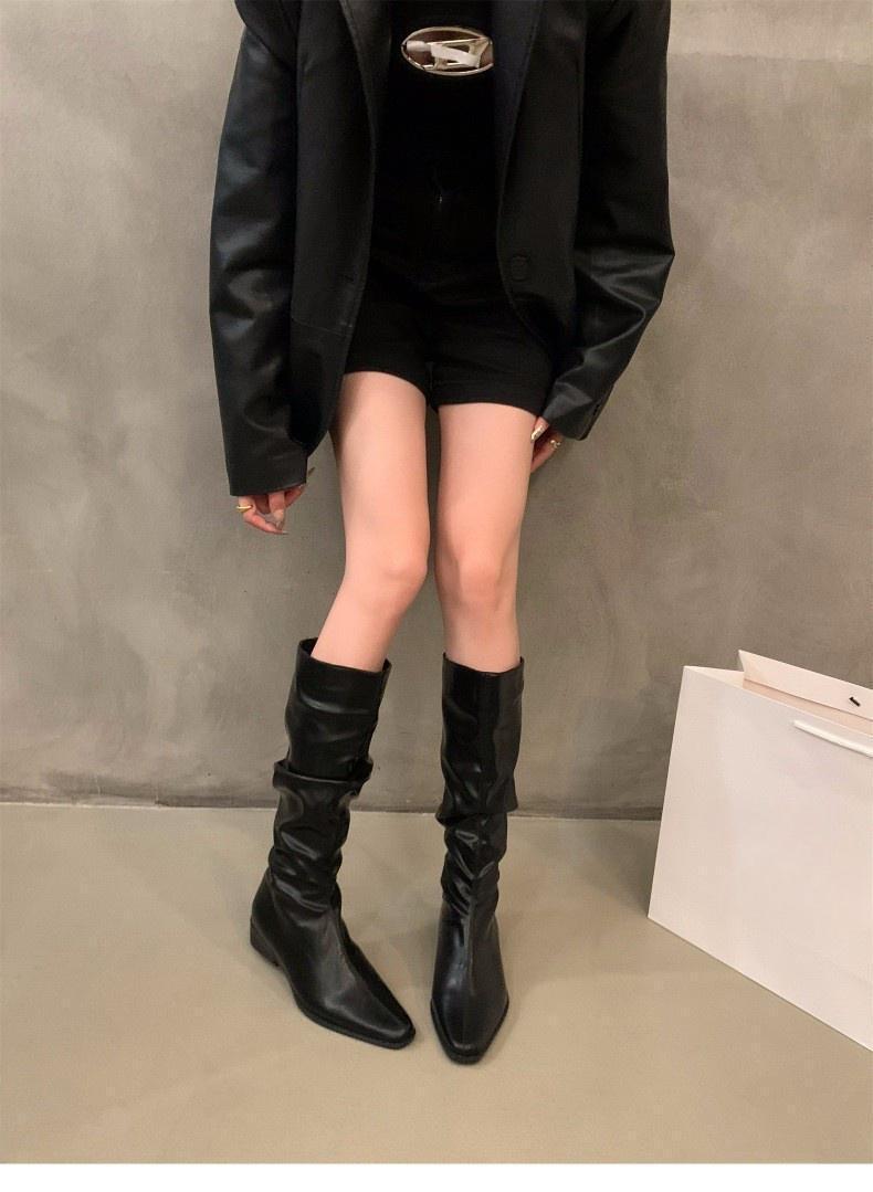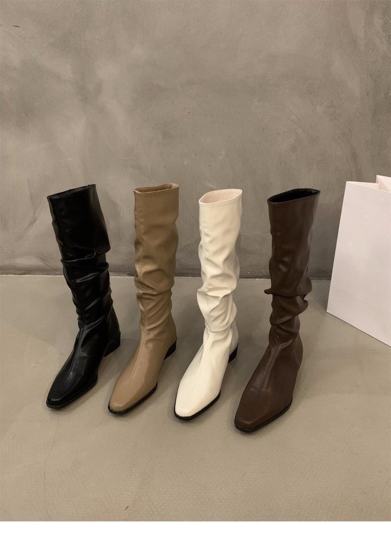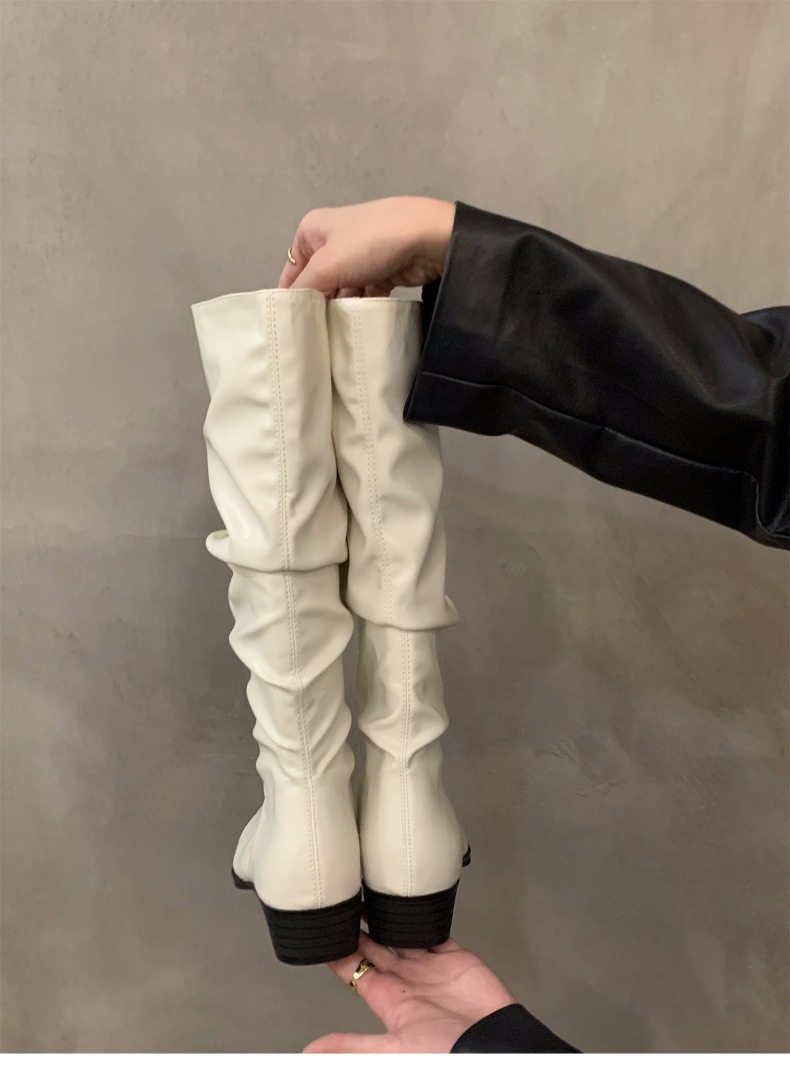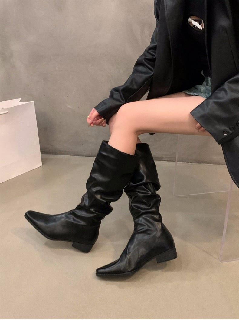 【シューズ】春秋冬 シャーリング ポインテッドトゥ 太ヒール 秋冬 ハイブーツ