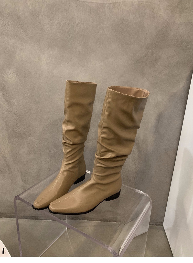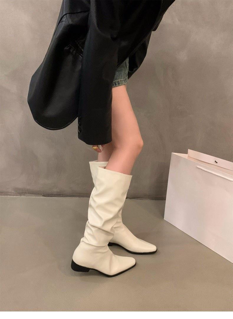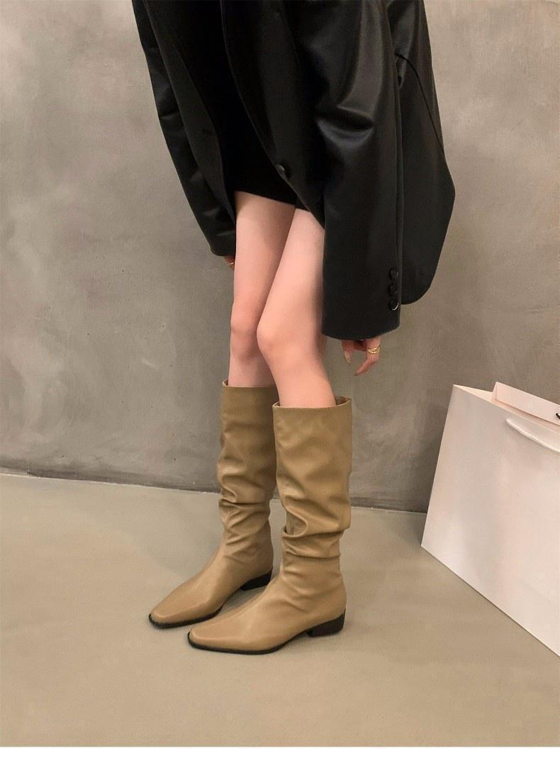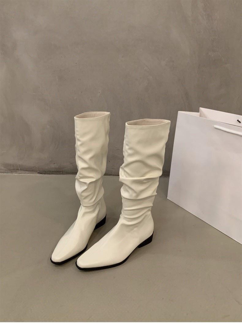 【シューズ】春秋冬 シャーリング ポインテッドトゥ 太ヒール 秋冬 ハイブーツ