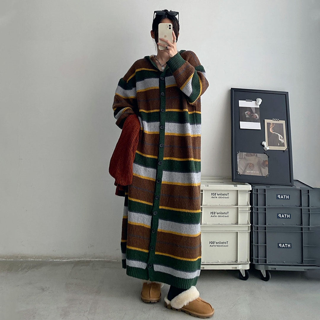 【ワンピース】冬 カジュアル ゆったり しま模様 フード付き 長袖ワンピース【FCシリーズ】