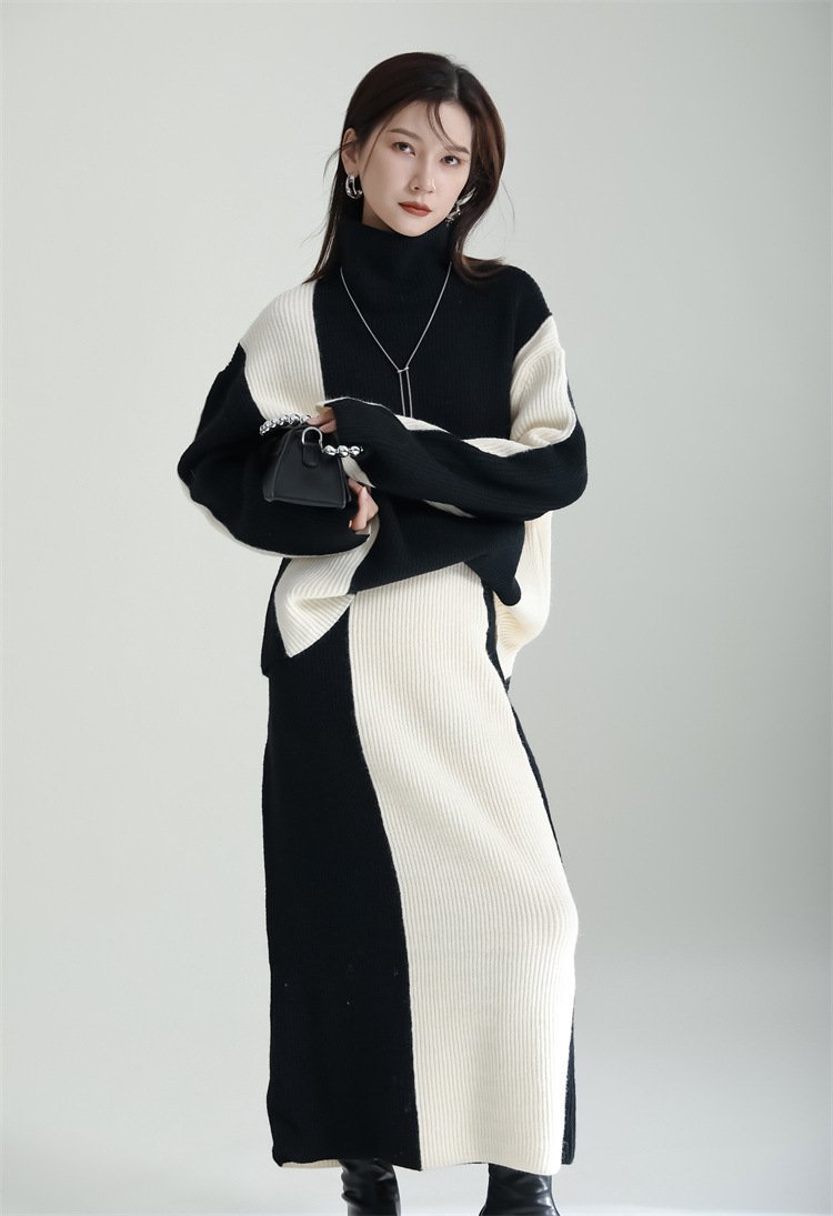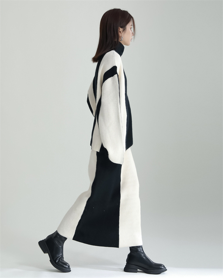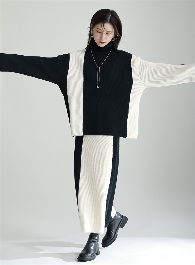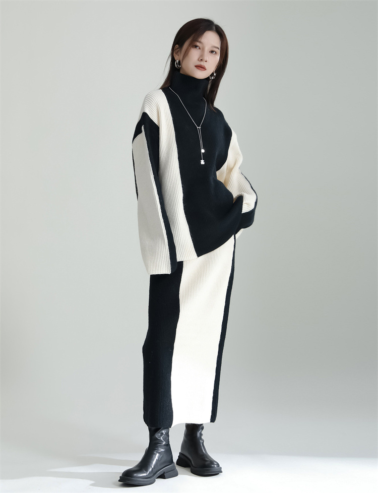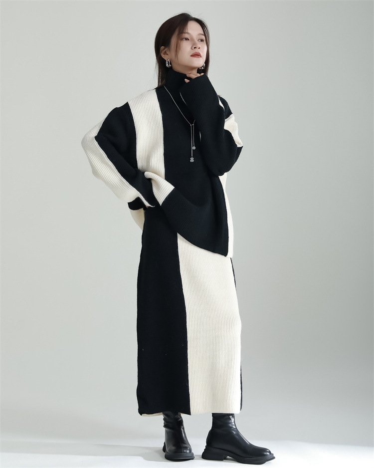 【セットアップ】高品質 秋冬 人気 着痩せ カラーマッチング ニットセーター+スカート 上下セット