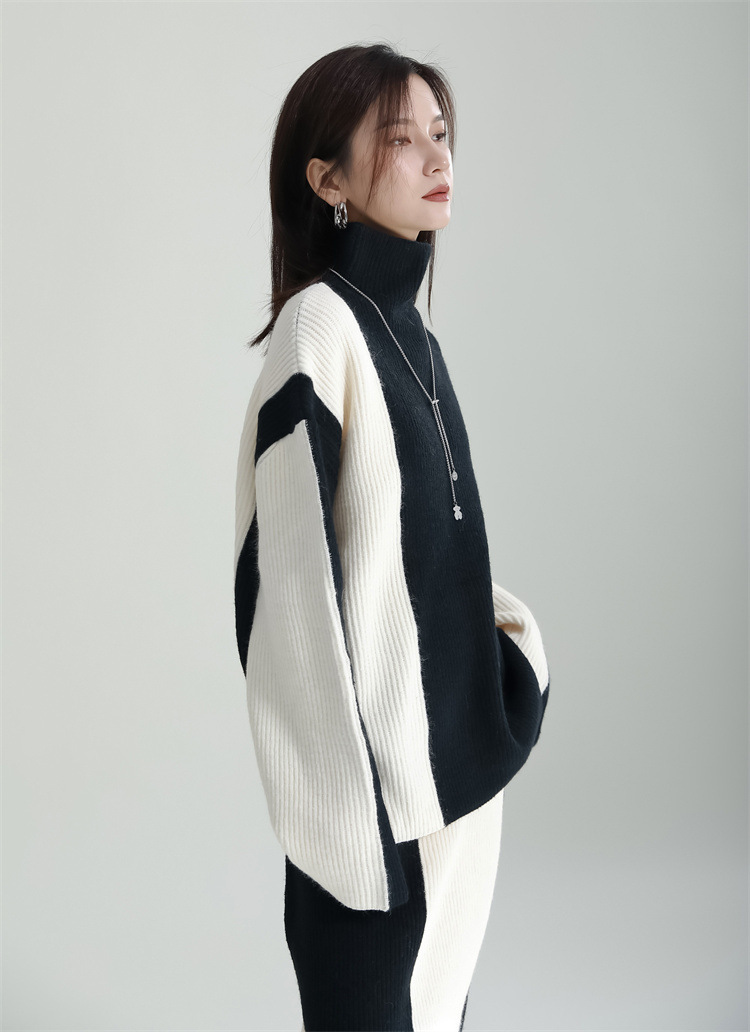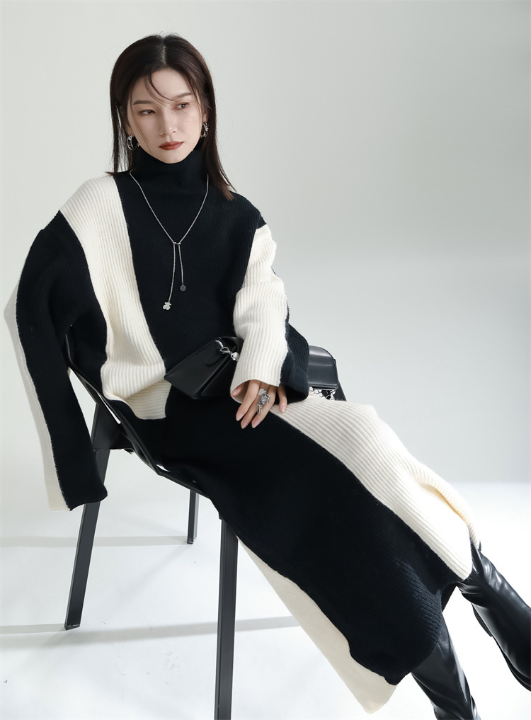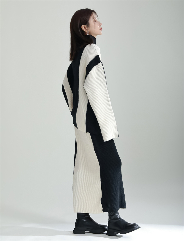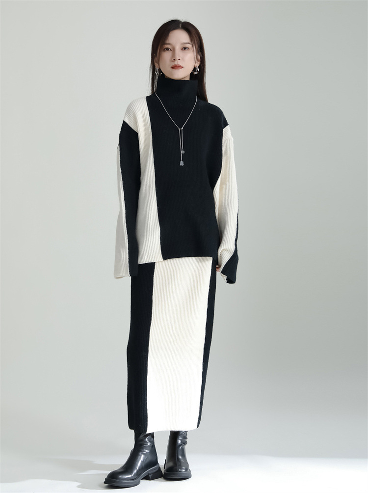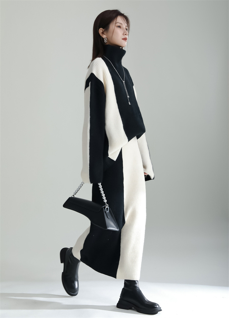【セットアップ】高品質 秋冬 人気 着痩せ カラーマッチング ニットセーター+スカート 上下セット