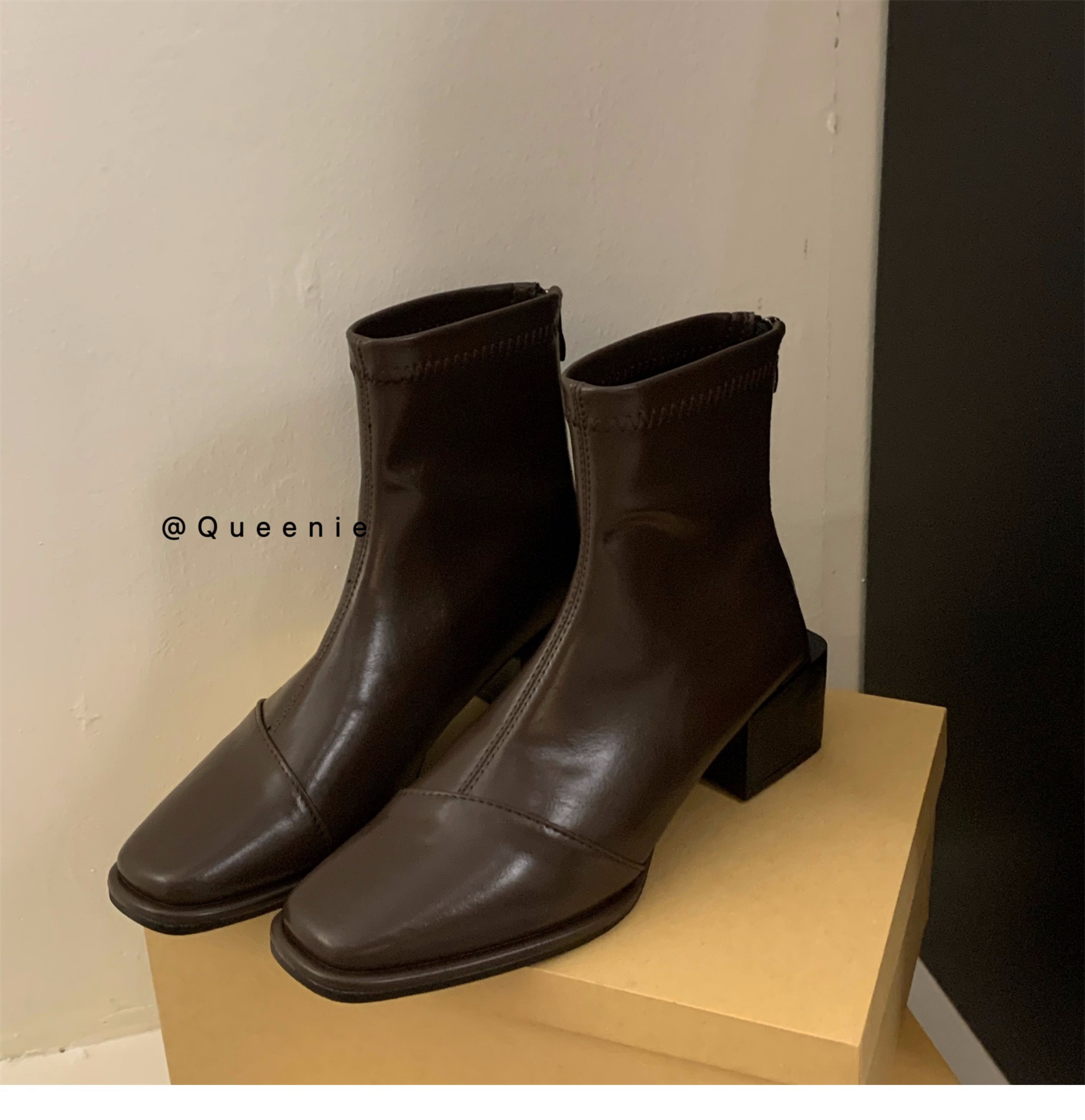【シューズ】春秋冬 韓国風 スクエアトゥ 合わせやすい 太ヒール ブーツ