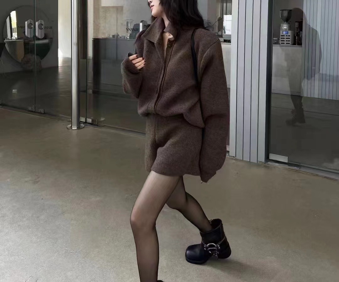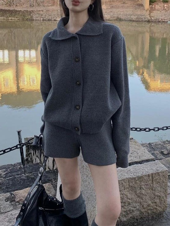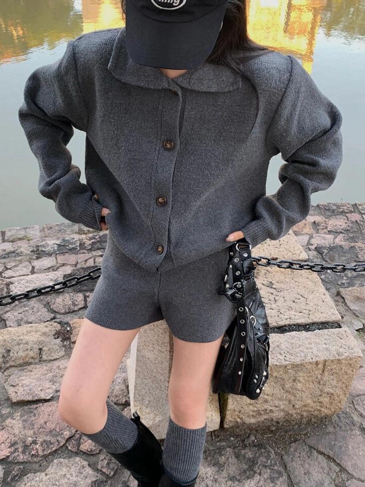 【ボトムス】秋冬 折り襟 ボタン付き ニットセーター+ ニット ショート パンツ