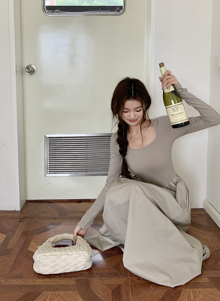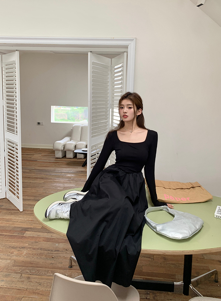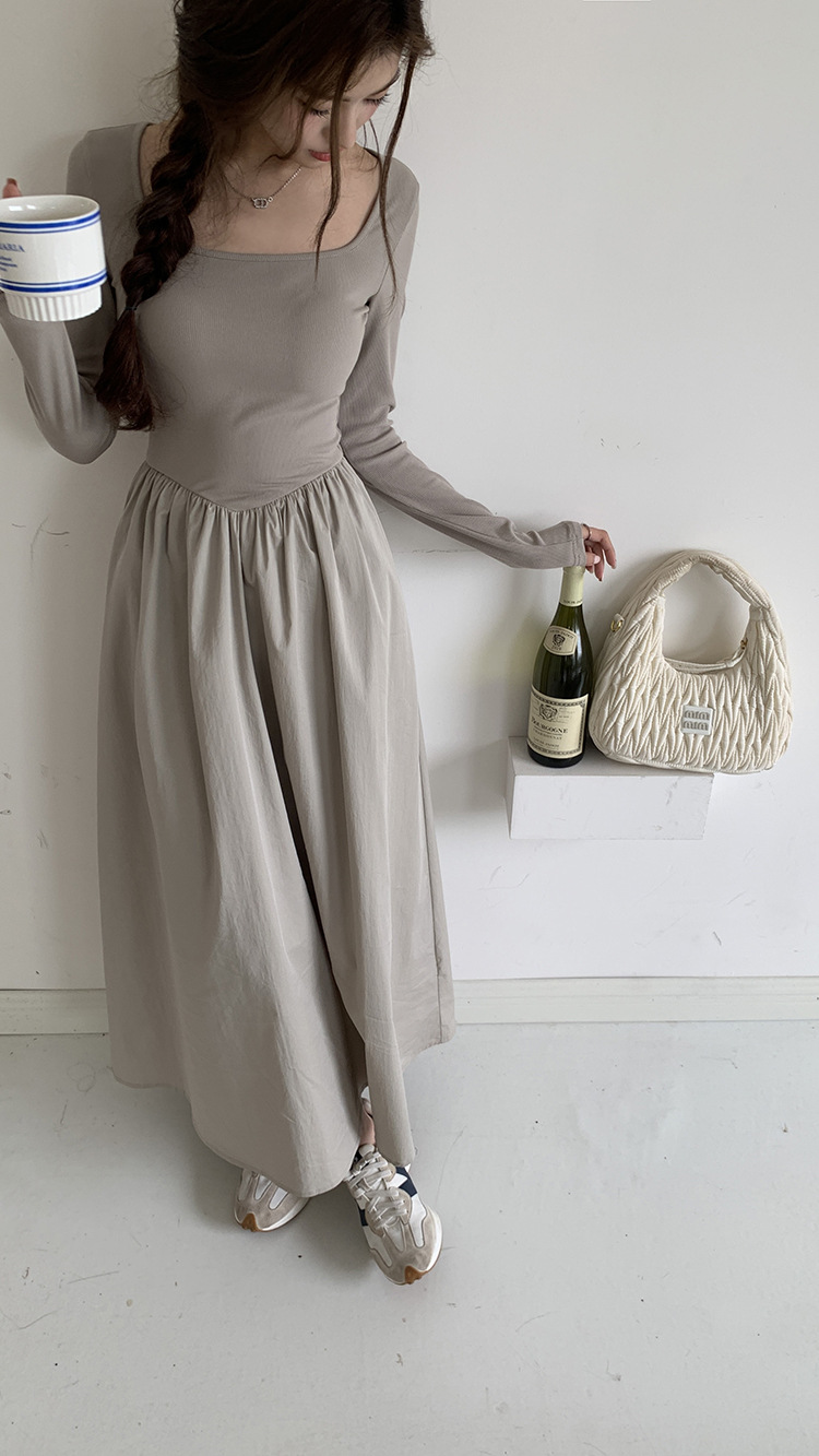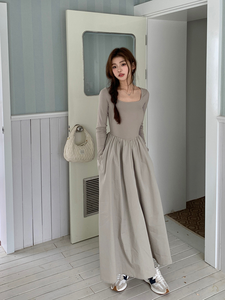 【ワンピース】春秋 トレンドアイテム スクエアネック 着痩せ 長袖ワンピース