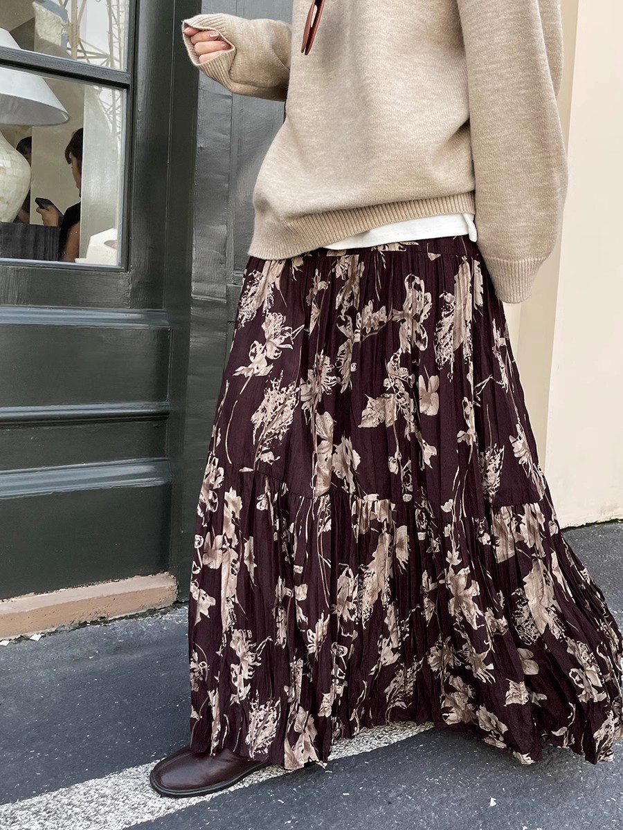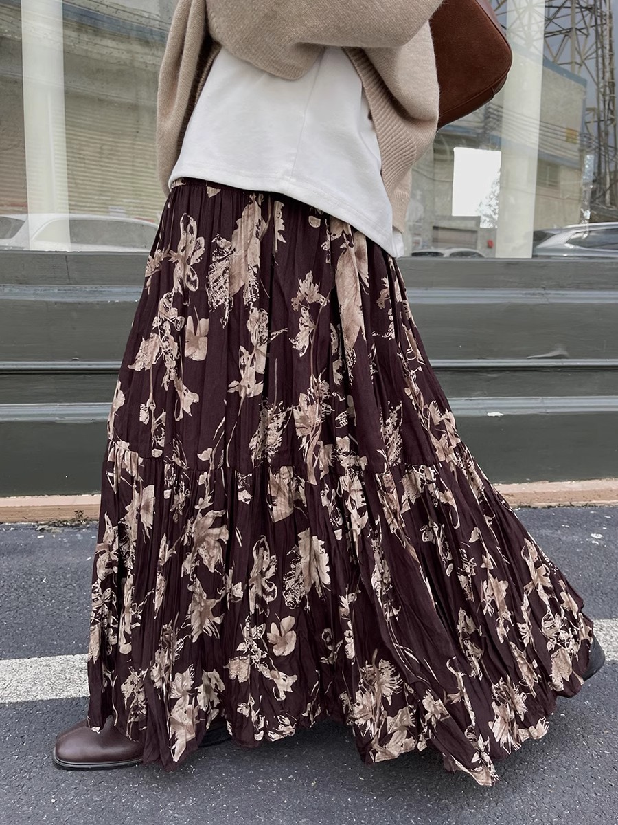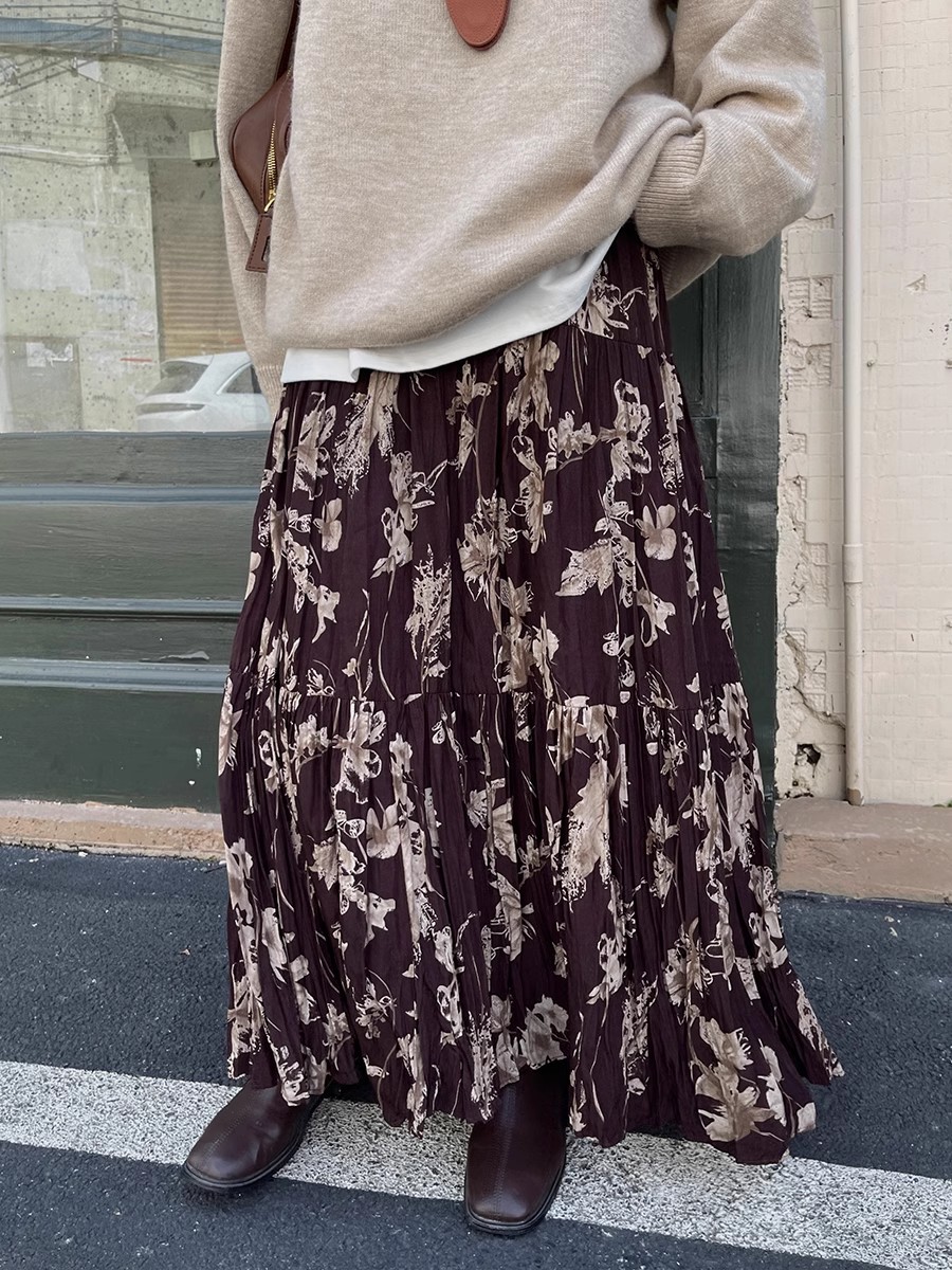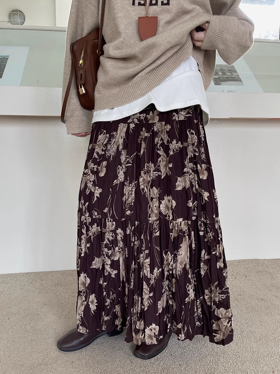 【ボトムス】裏起毛 春秋冬 レトロ フリルギャザー プリント スカート【SHシリーズ】