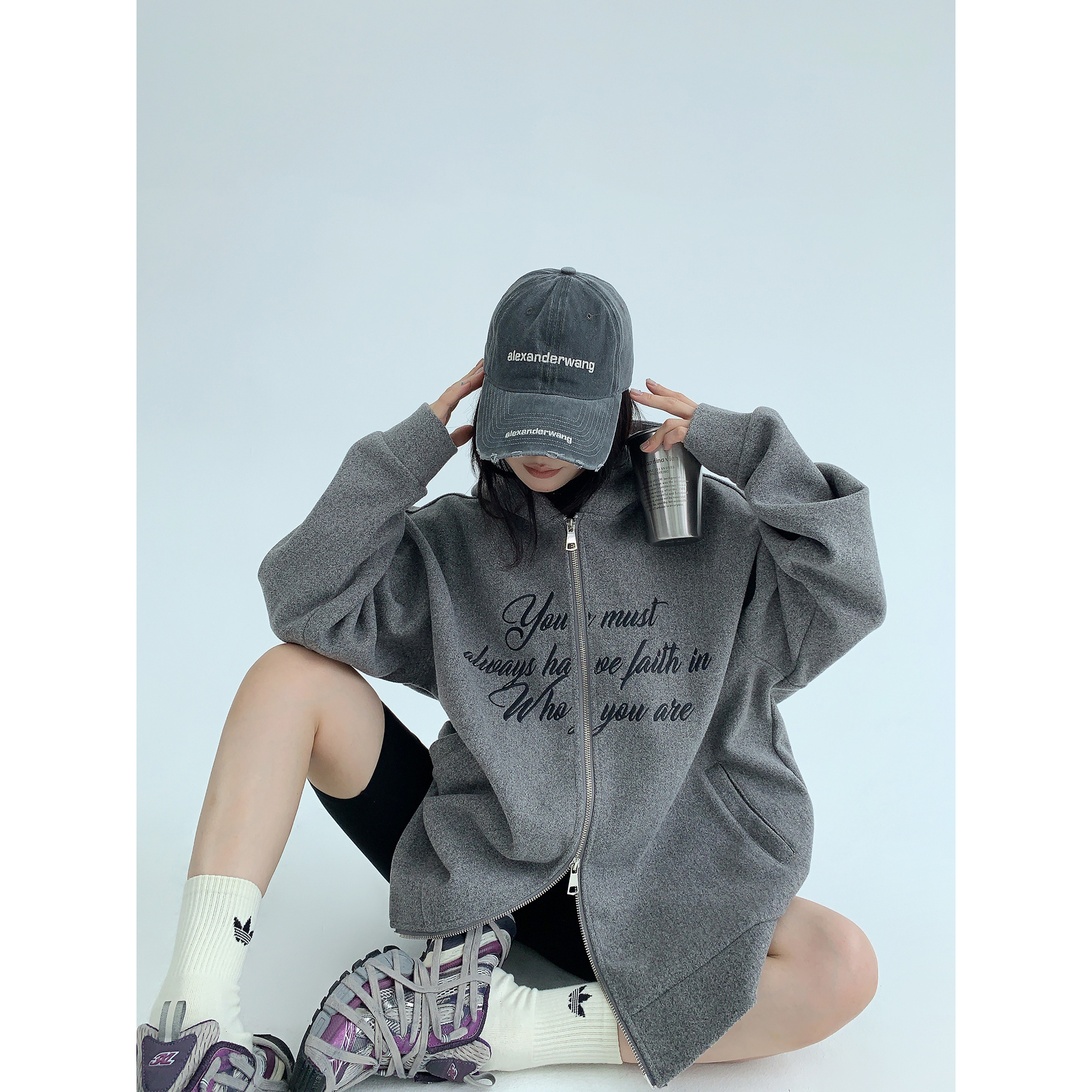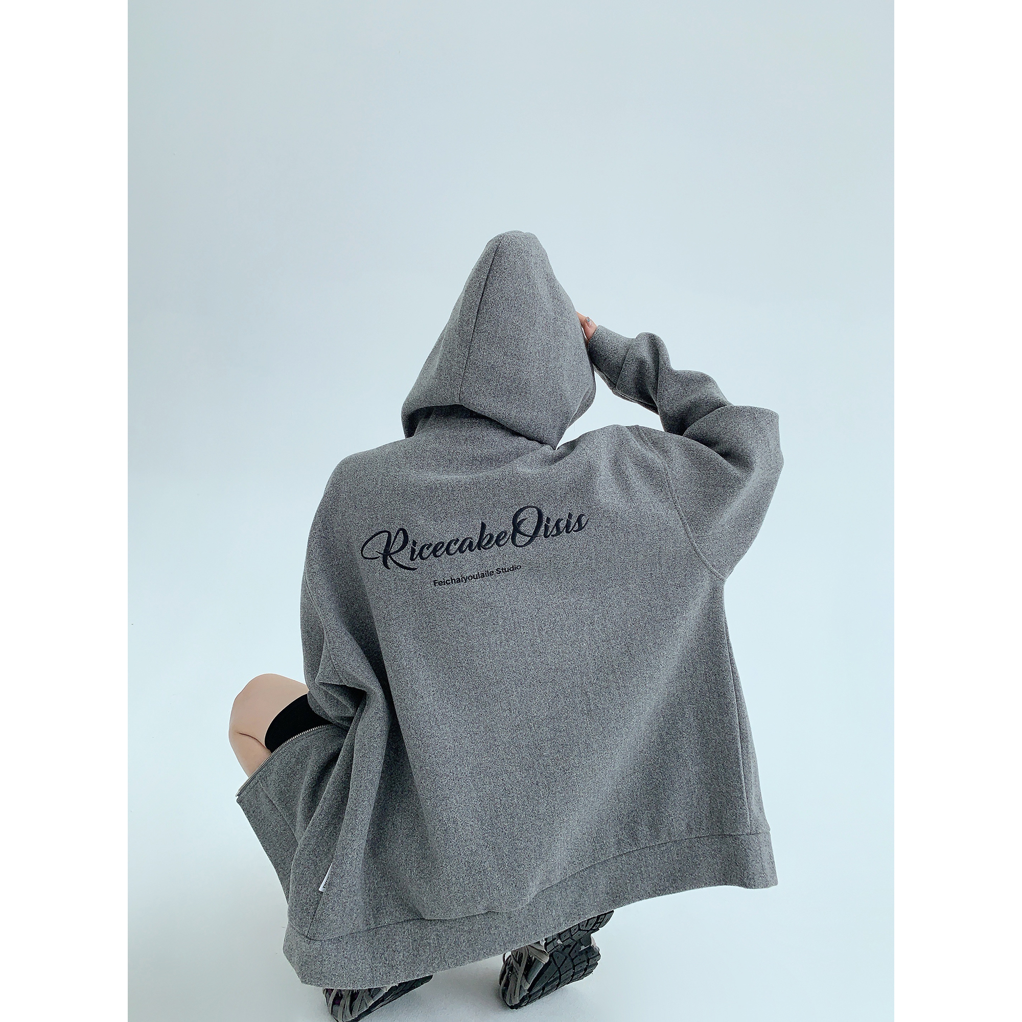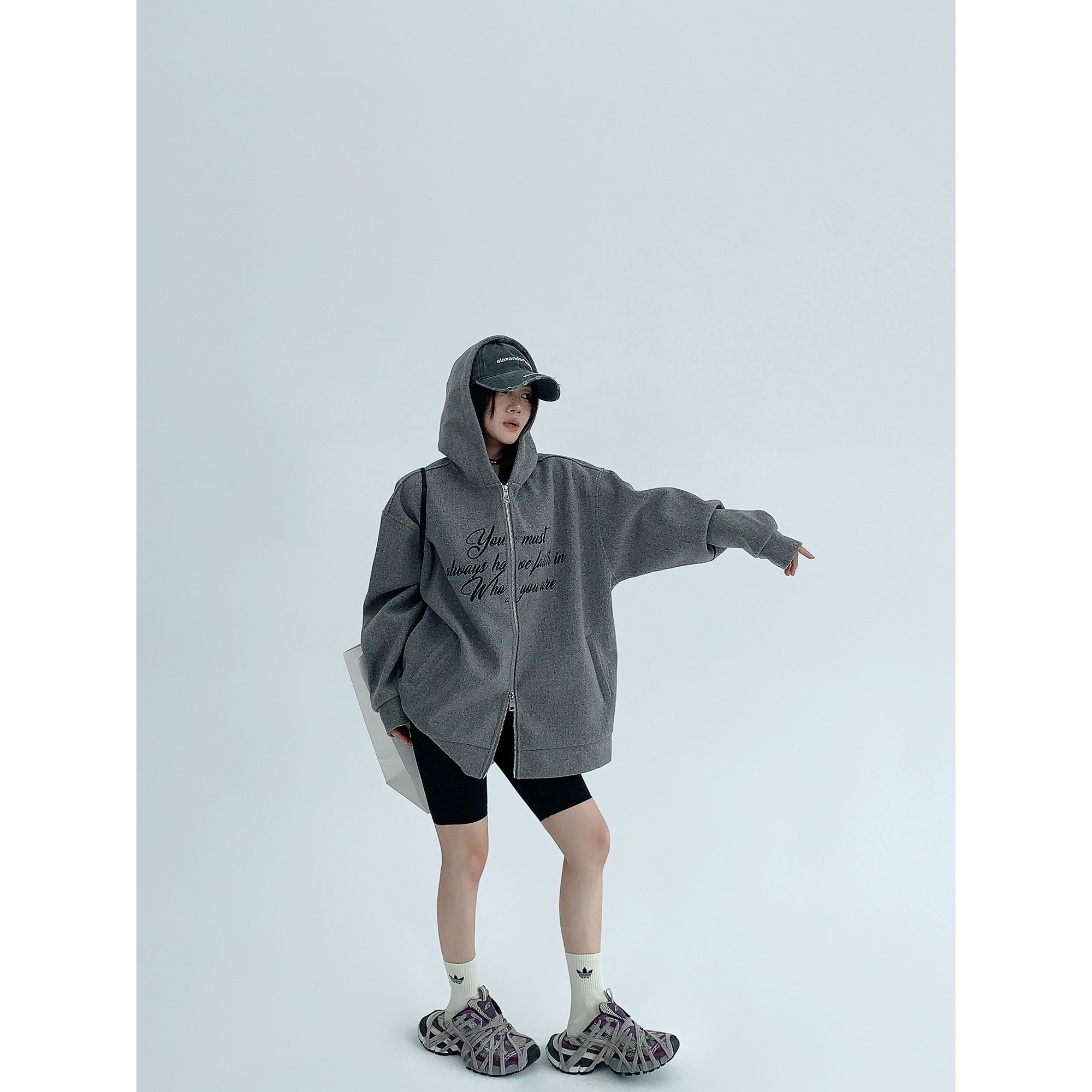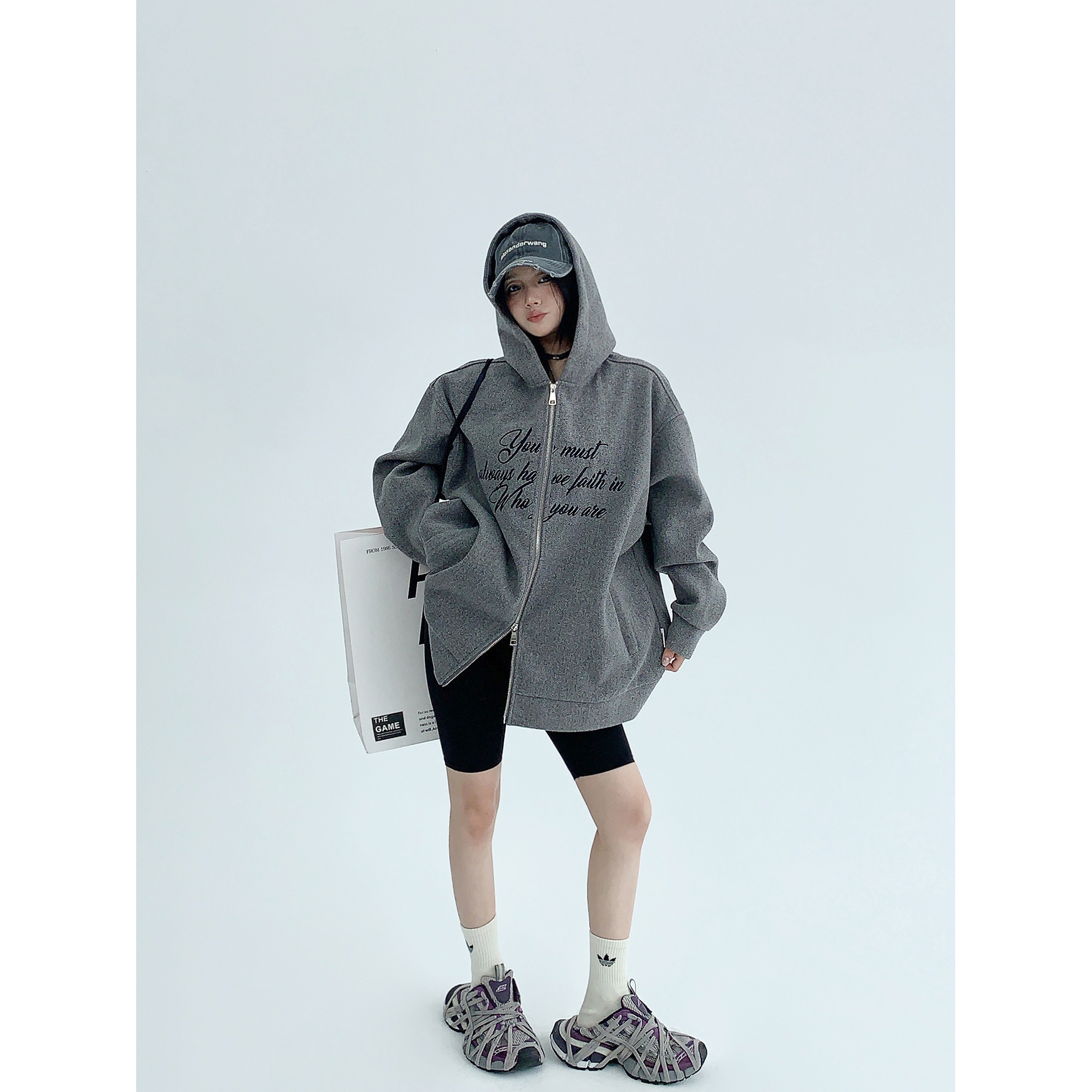 【商品名】【アウター】刺繍 ファスナー付き ゆるリラックス フード付き ジャケット