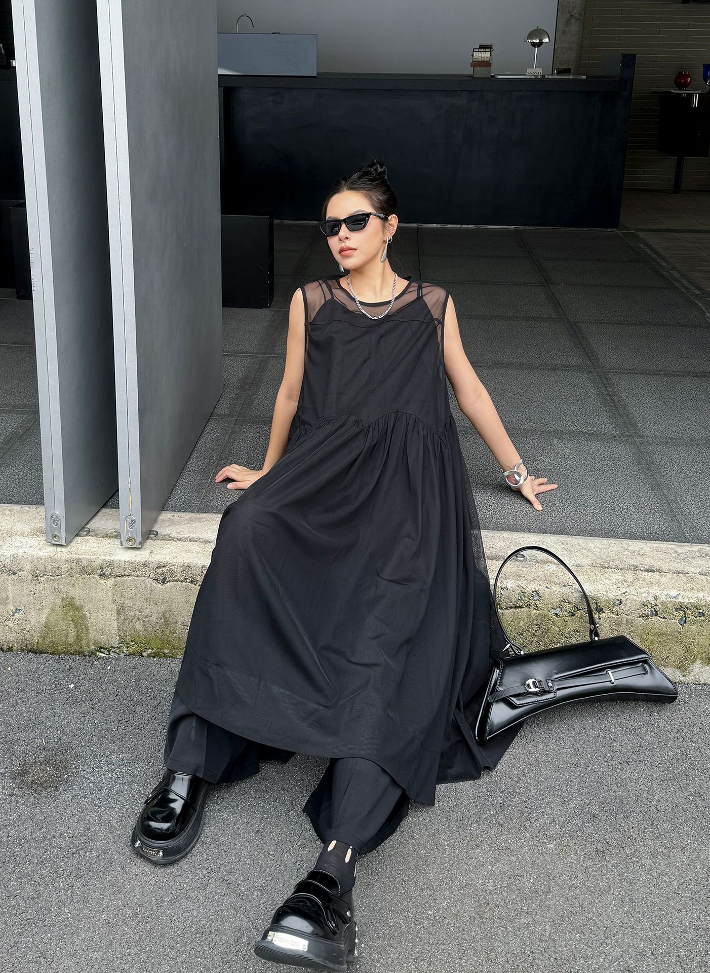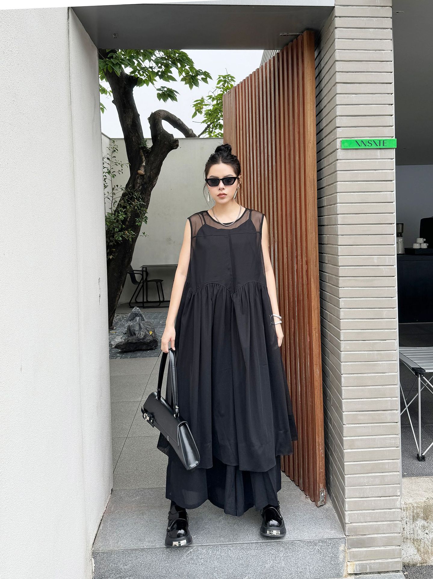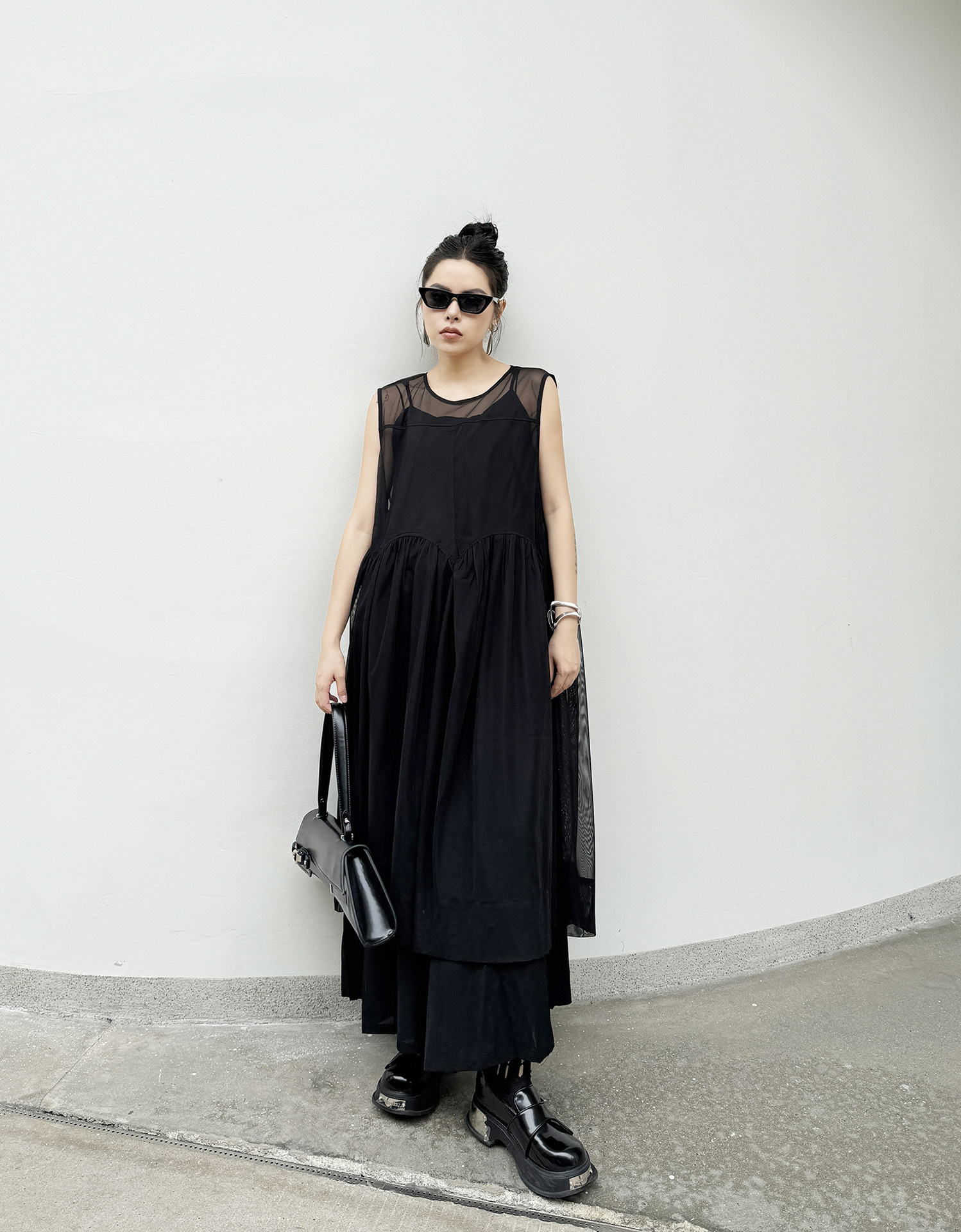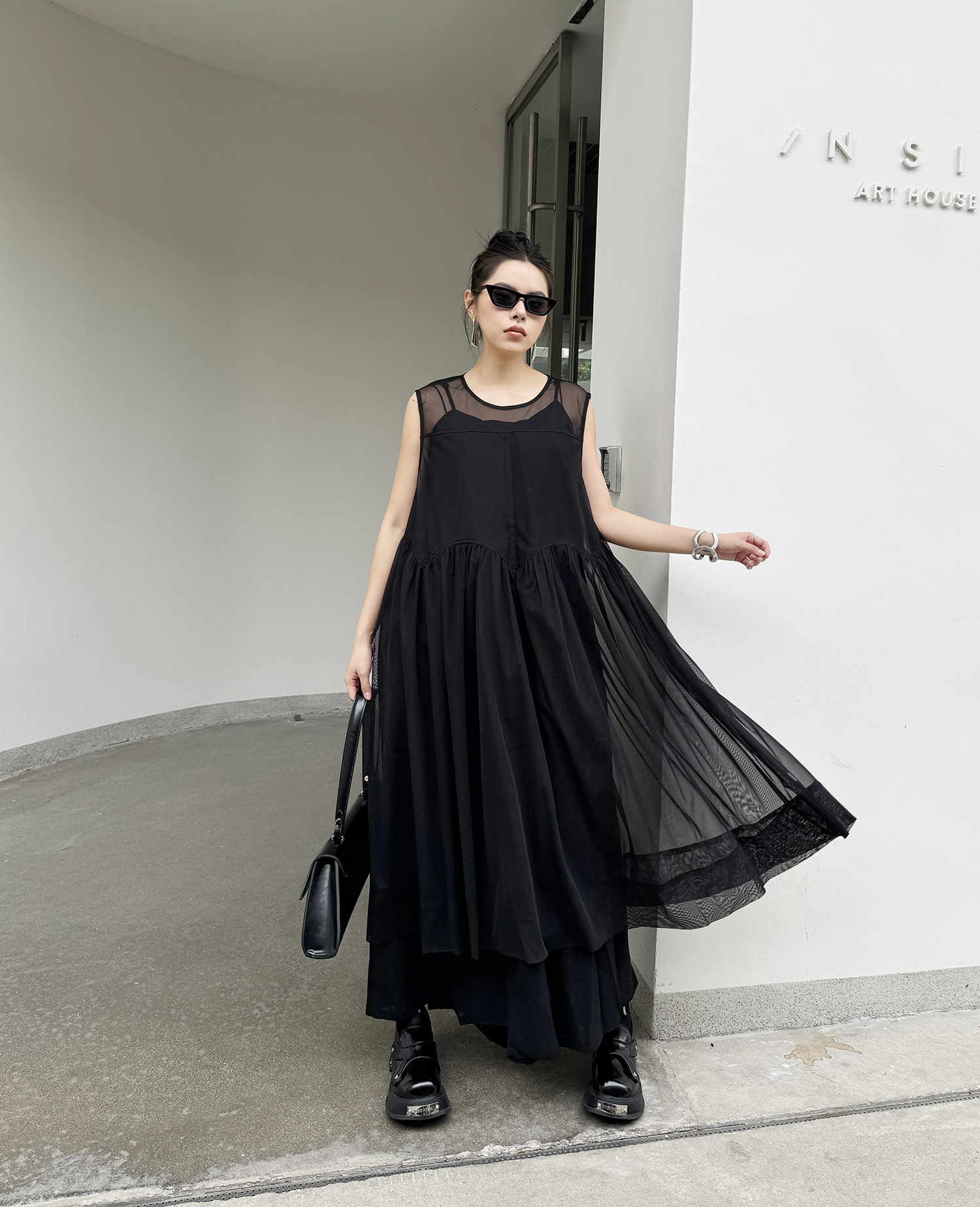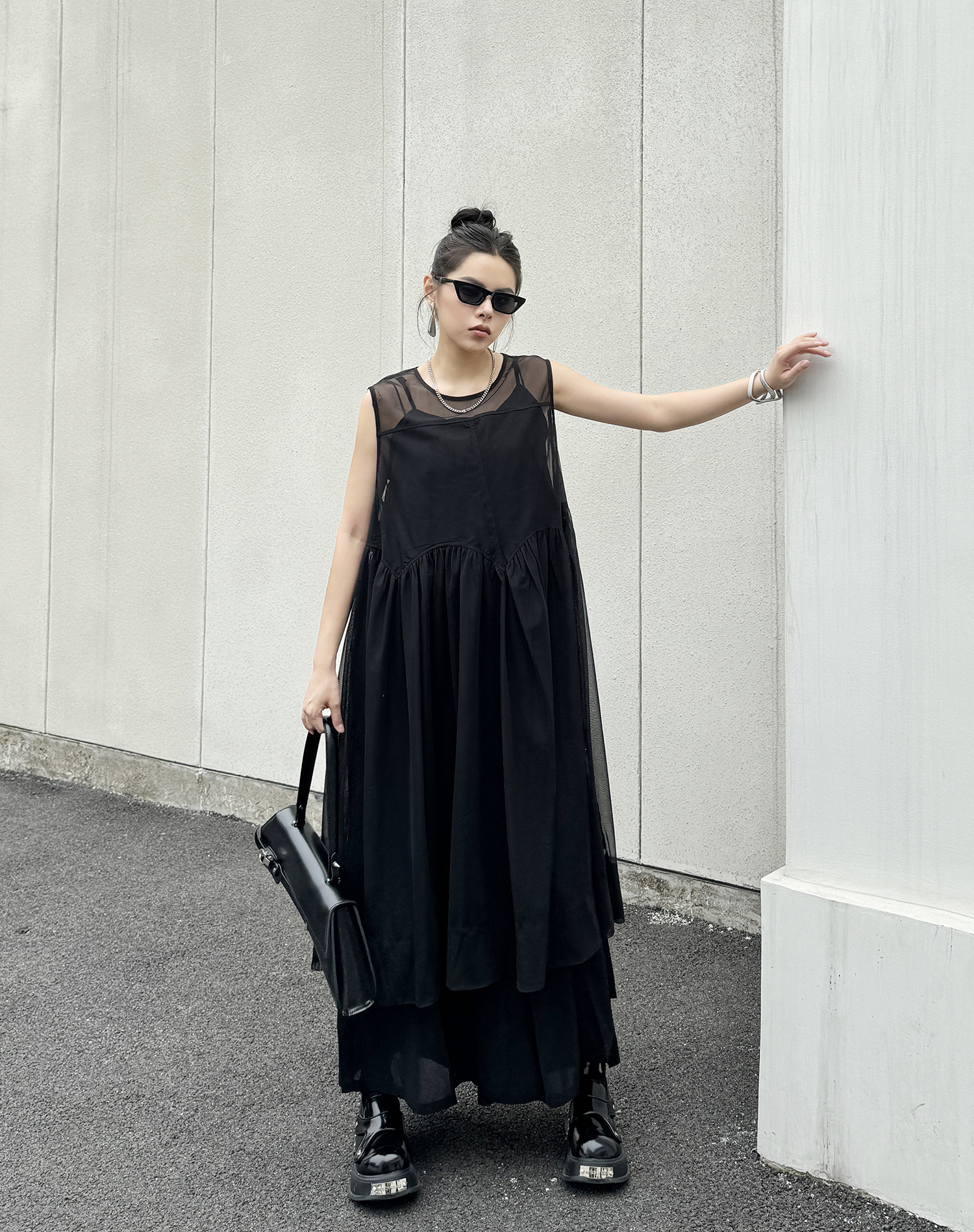 【商品名】【ワンピース】ダーク系 メッシュ素材 透け感 プリーツデザイン ノースリーブワンピース