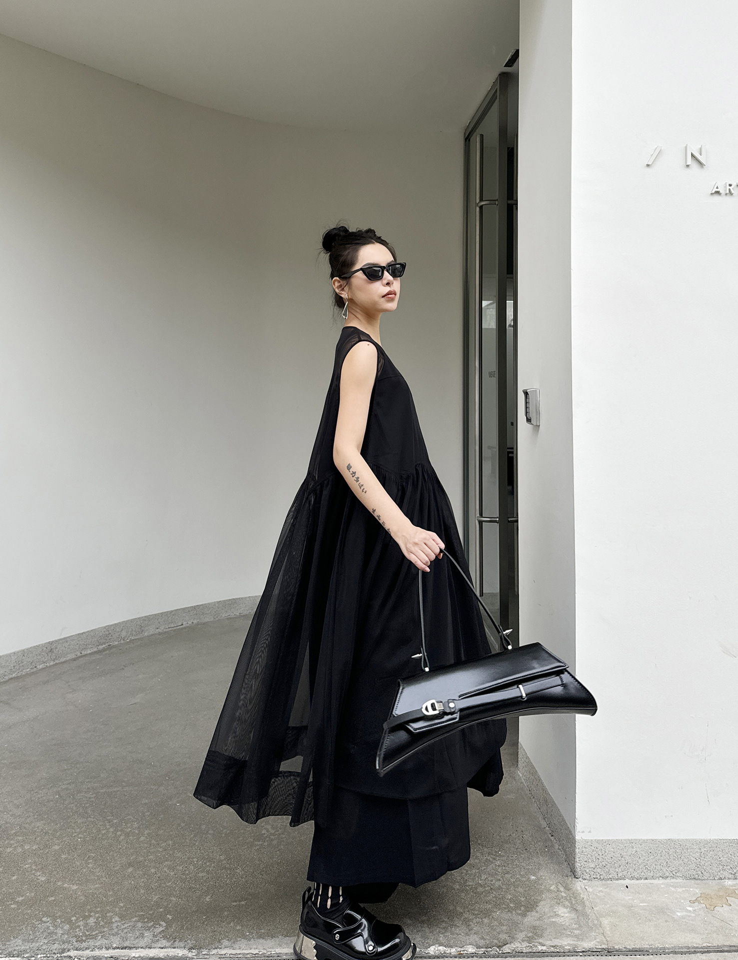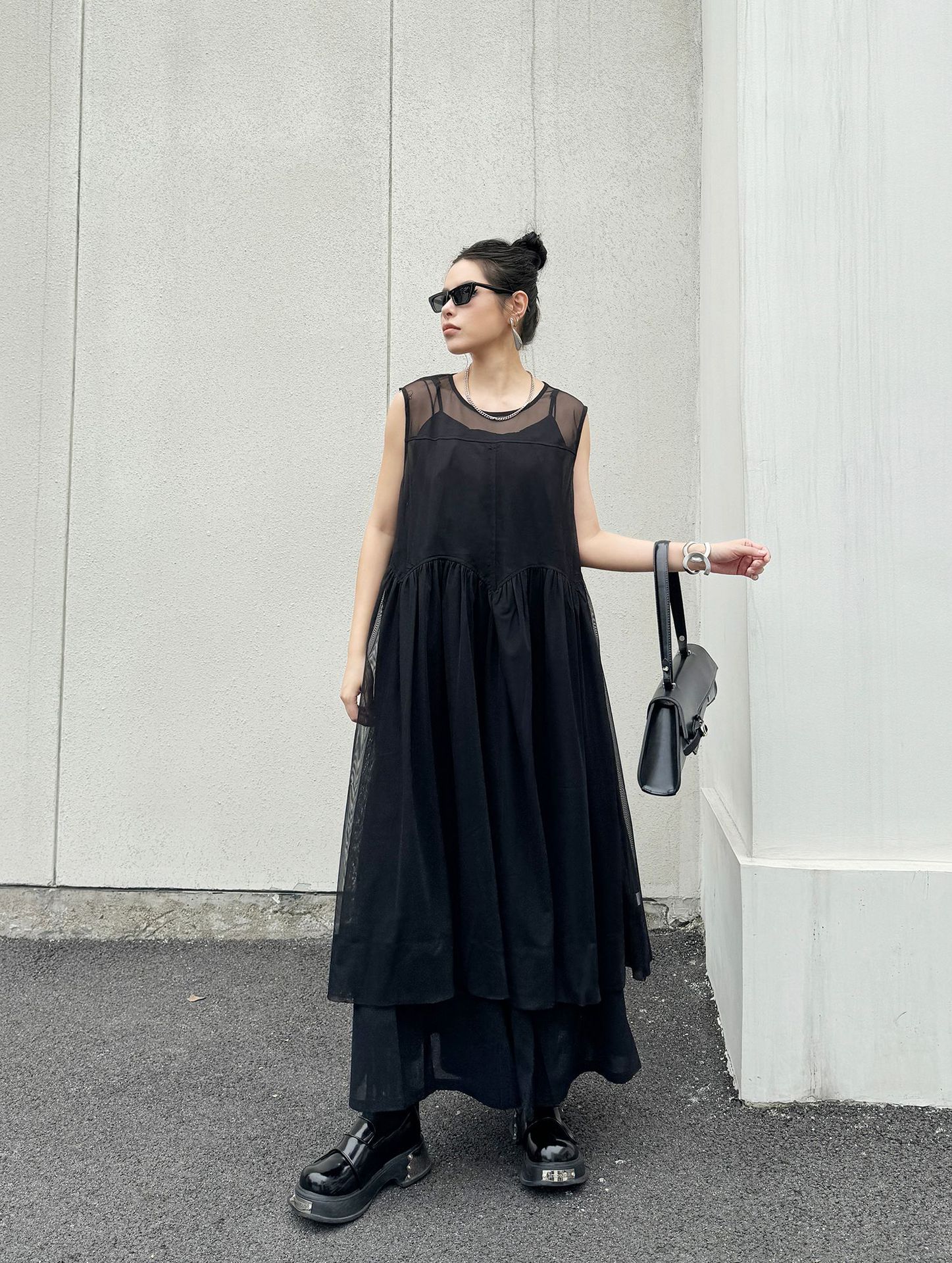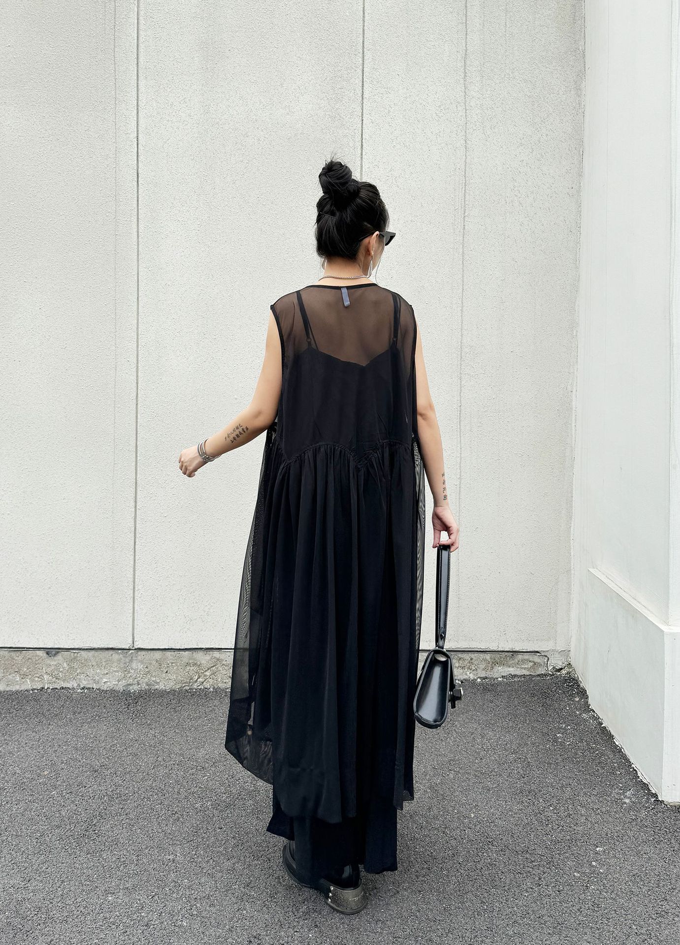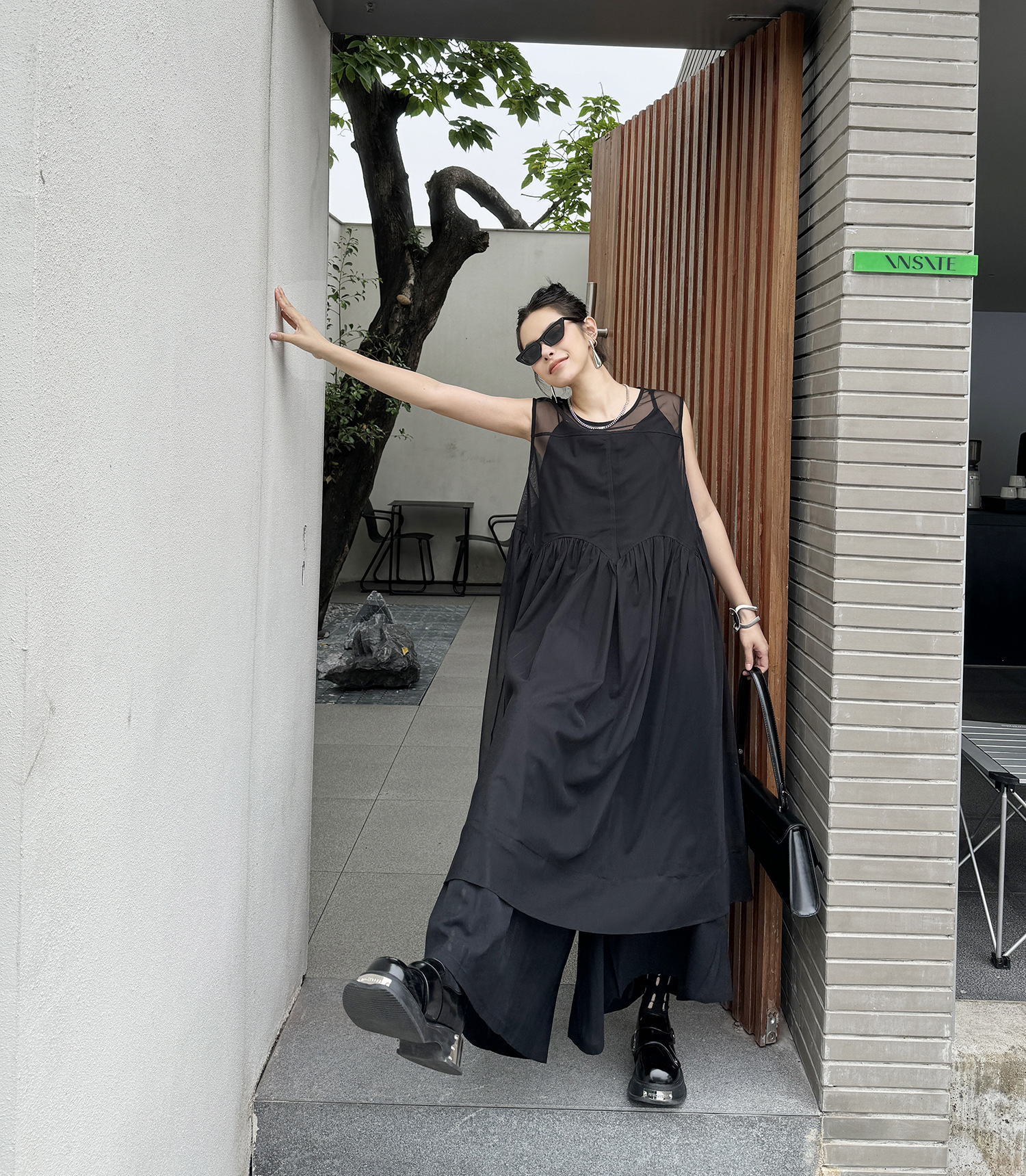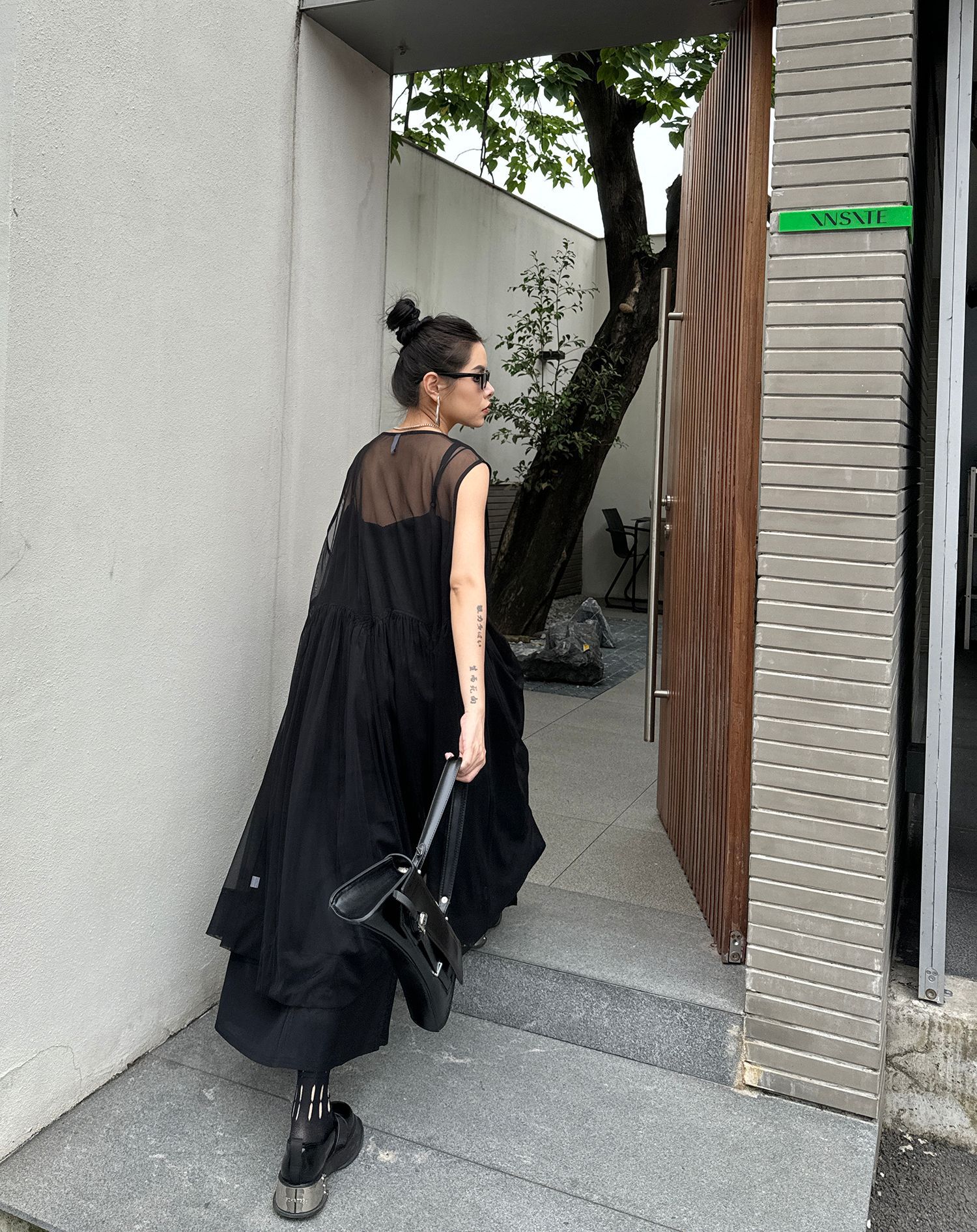 【商品名】【ワンピース】ダーク系 メッシュ素材 透け感 プリーツデザイン ノースリーブワンピース