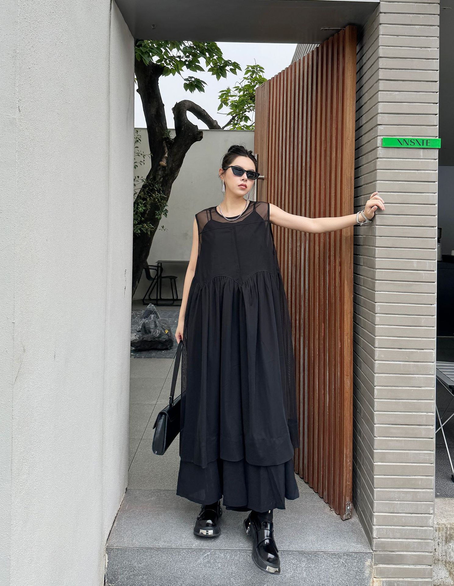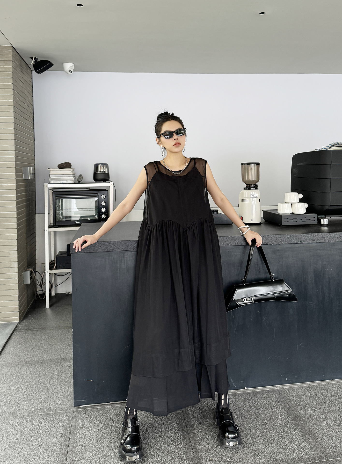 【ワンピース】夏 ダーク系 メッシュ素材 透け感 プリーツデザイン ノースリーブワンピース【AHシリーズ】