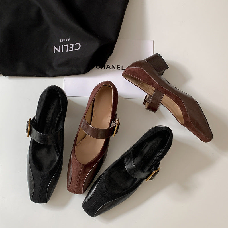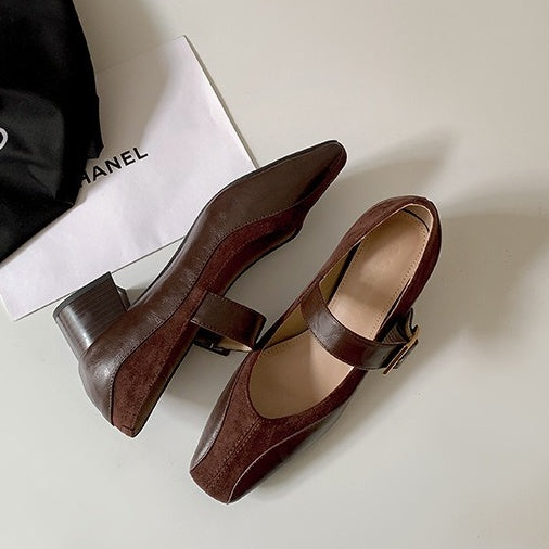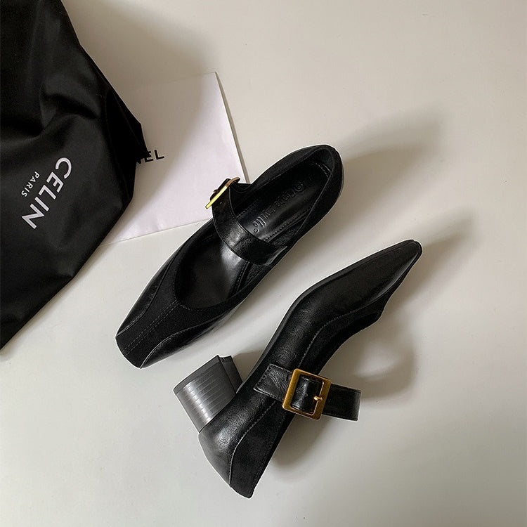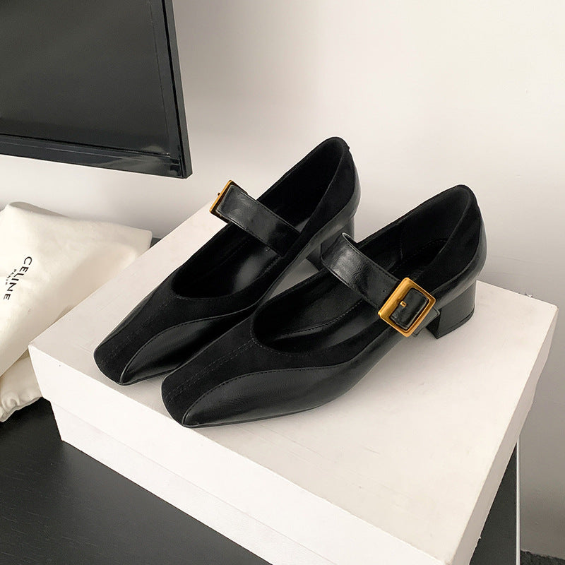 【シューズ】春秋冬 レトロ スクエアトゥ 太ヒール パンプス