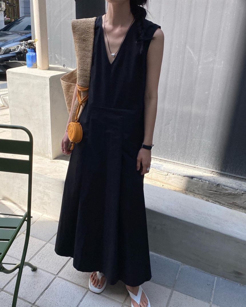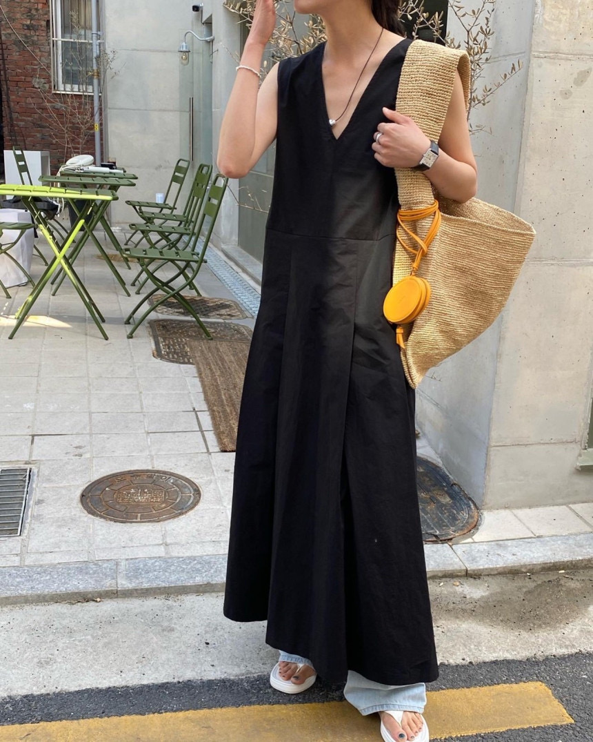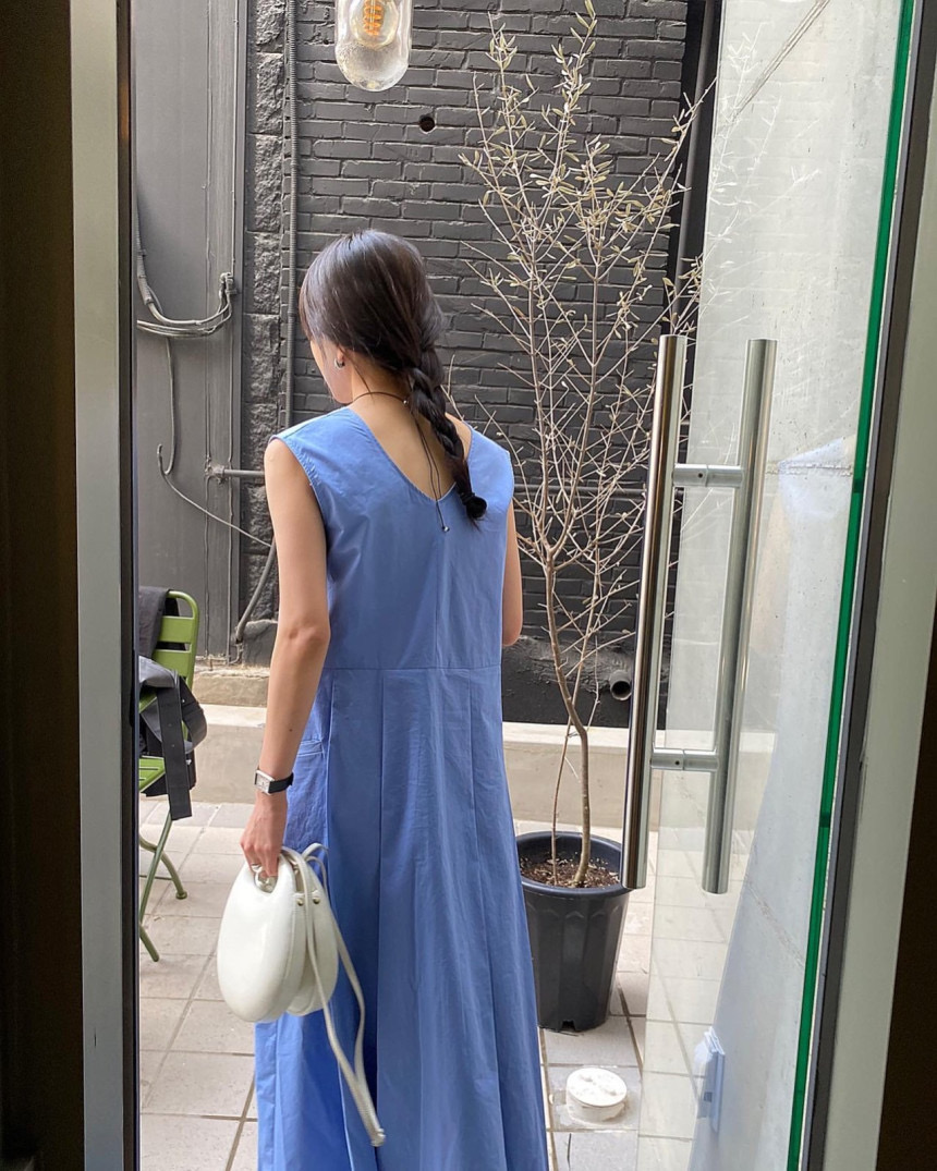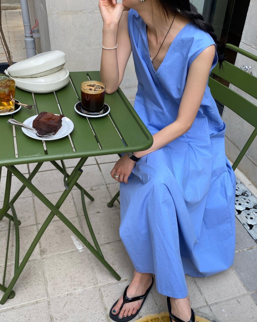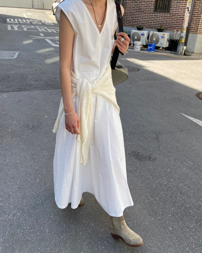 【ワンピース】夏 Vネック フリルギャザー タンクトップ ノースリーブ ワンピース