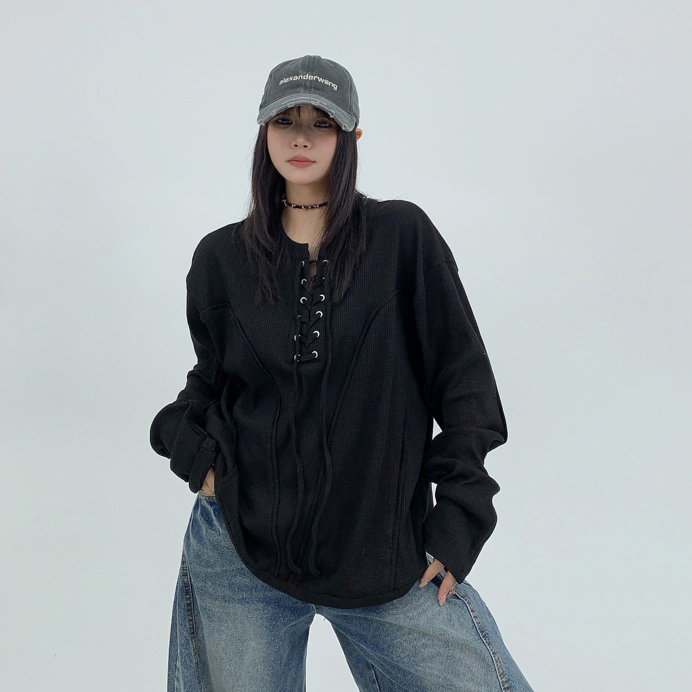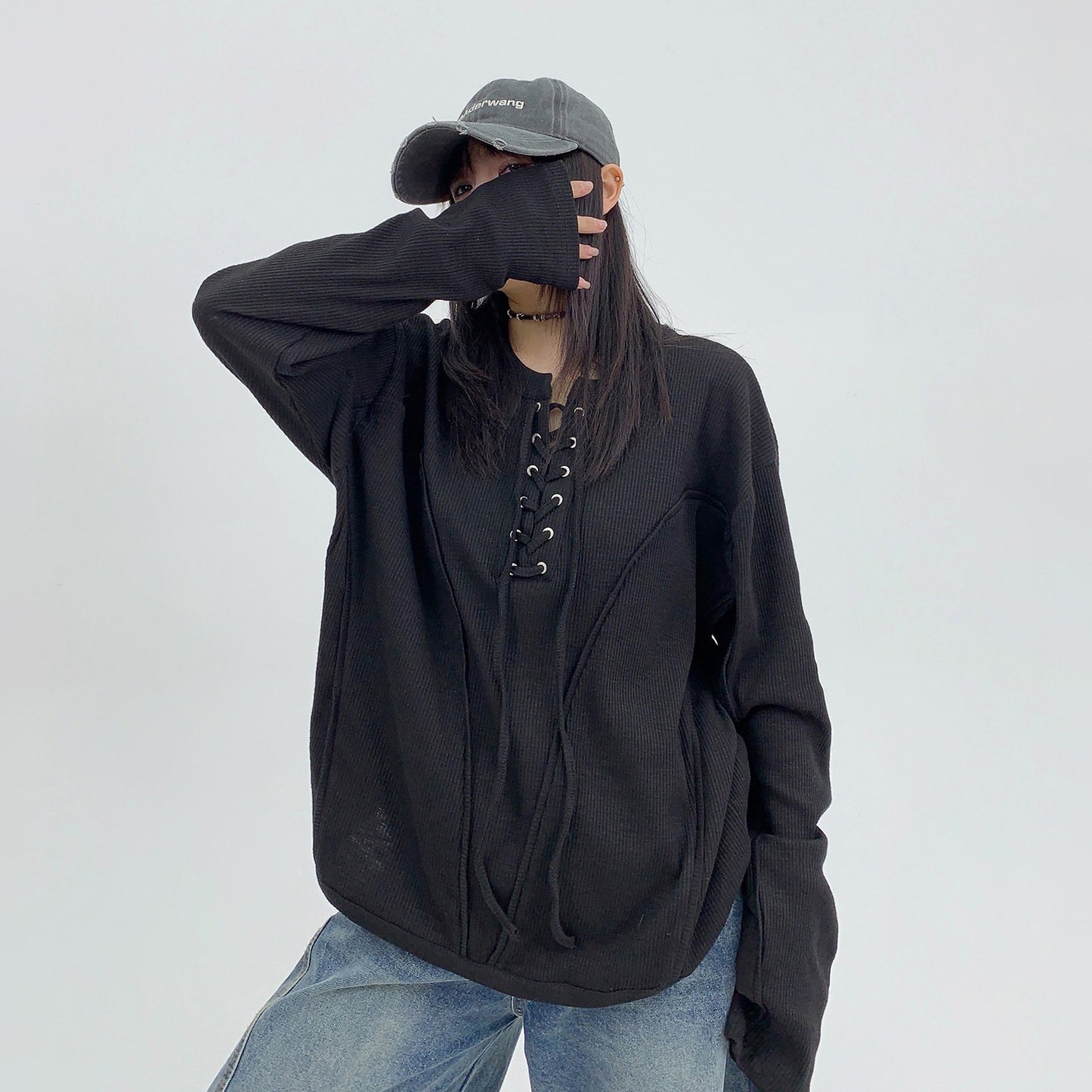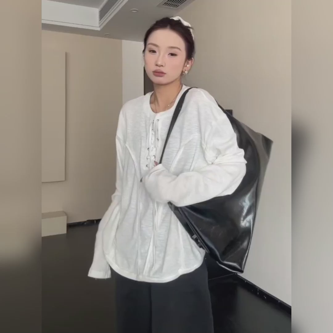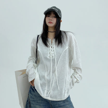 【トップス】春秋 カジュアル ユニークデザイン レースアップ 長袖 Tシャツ【FCシリーズ】