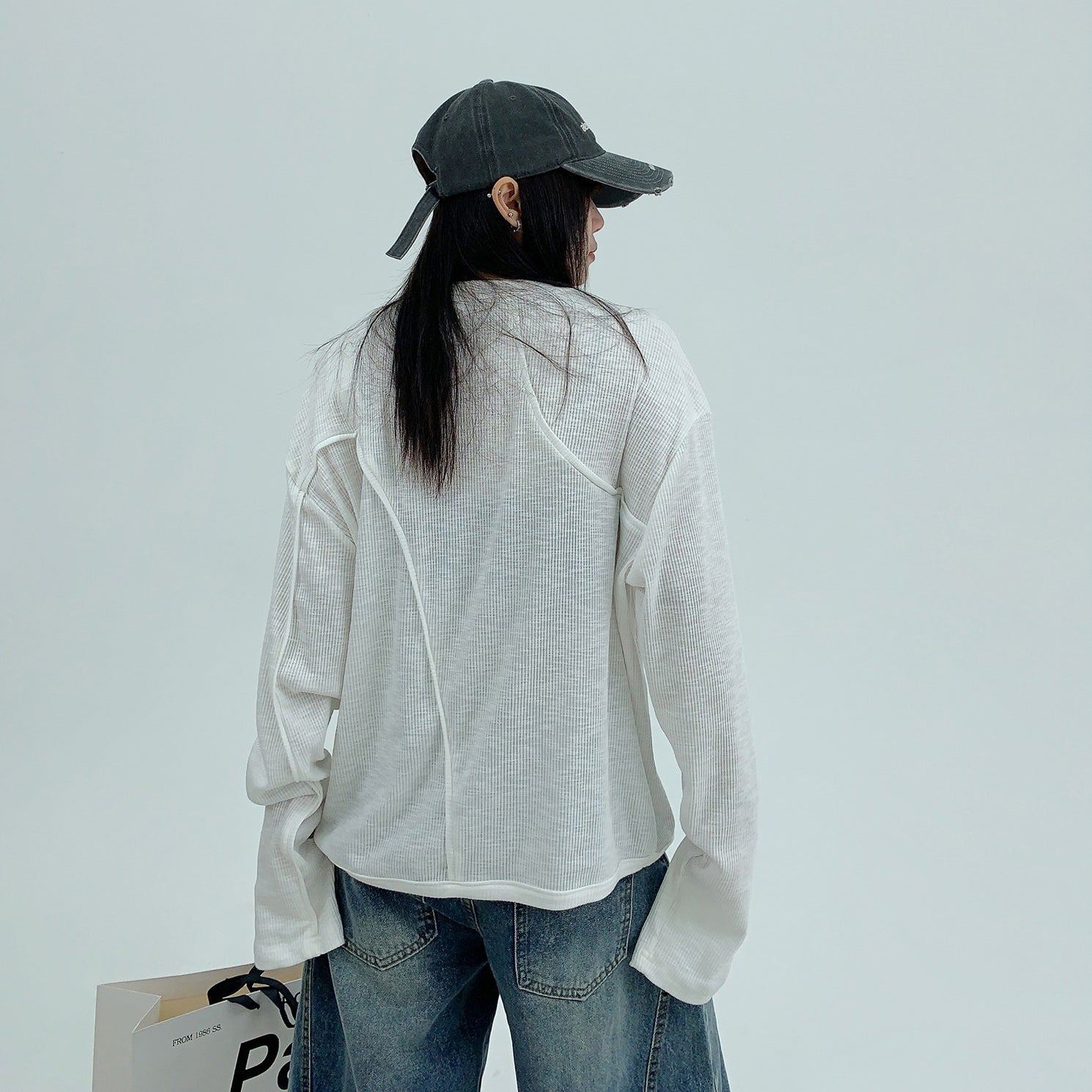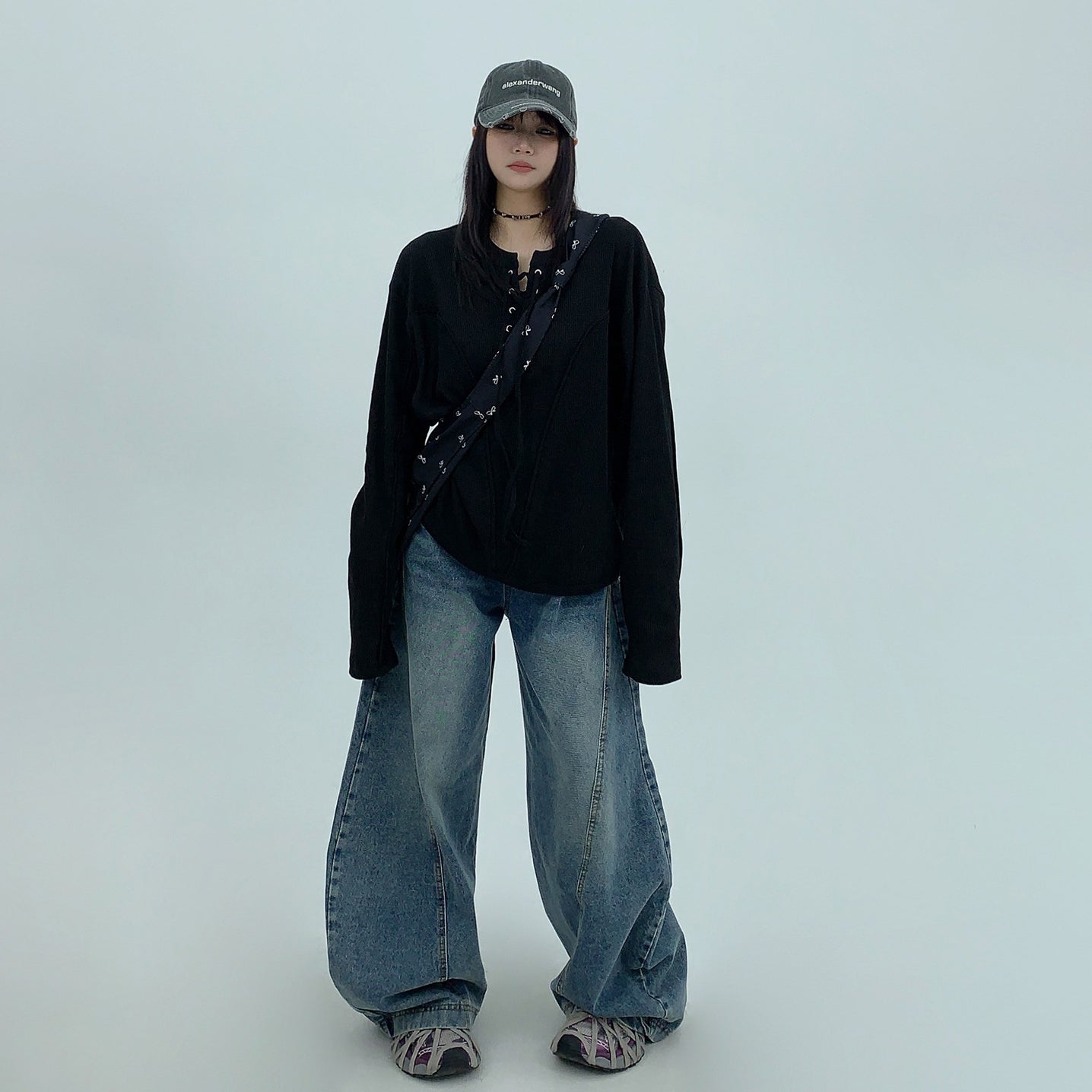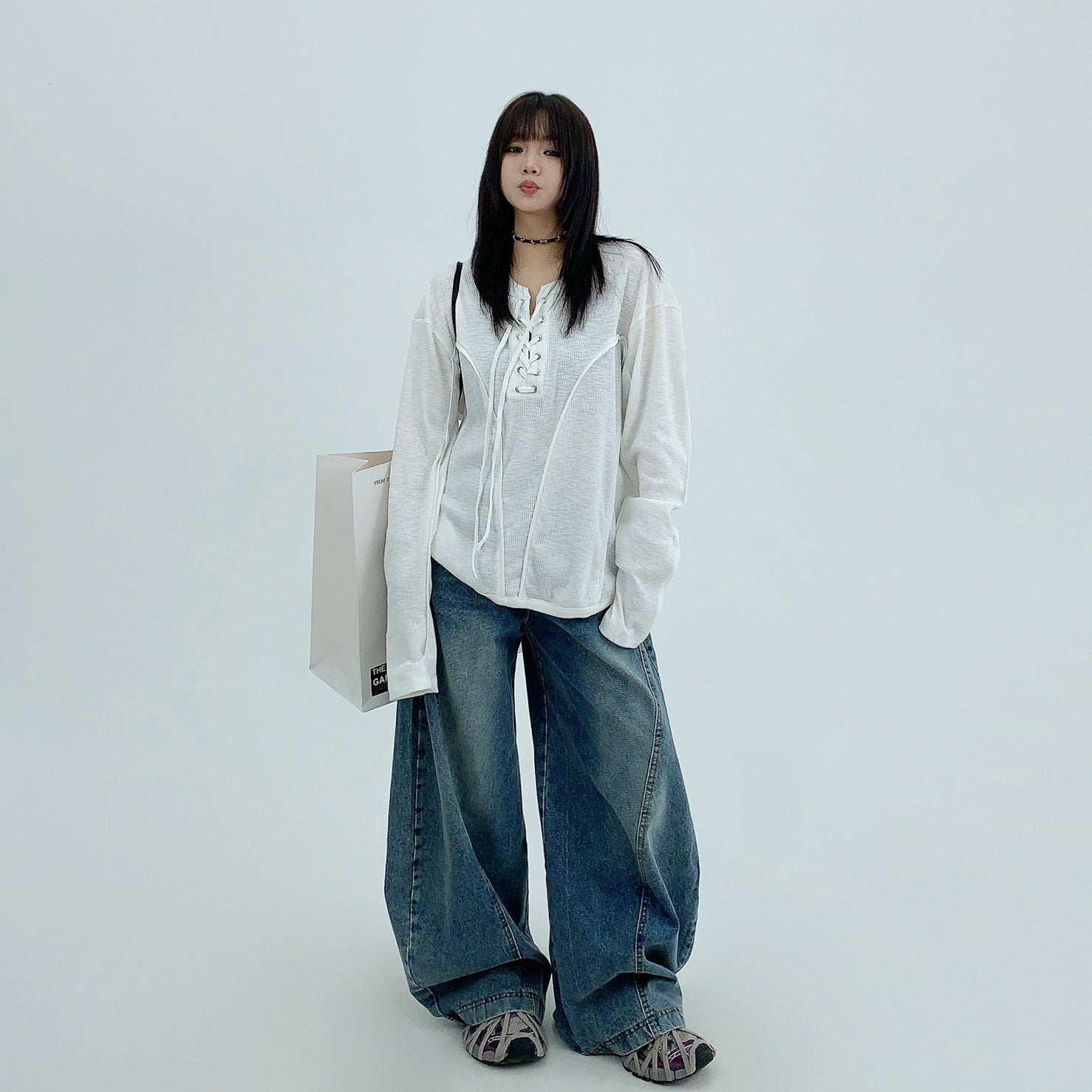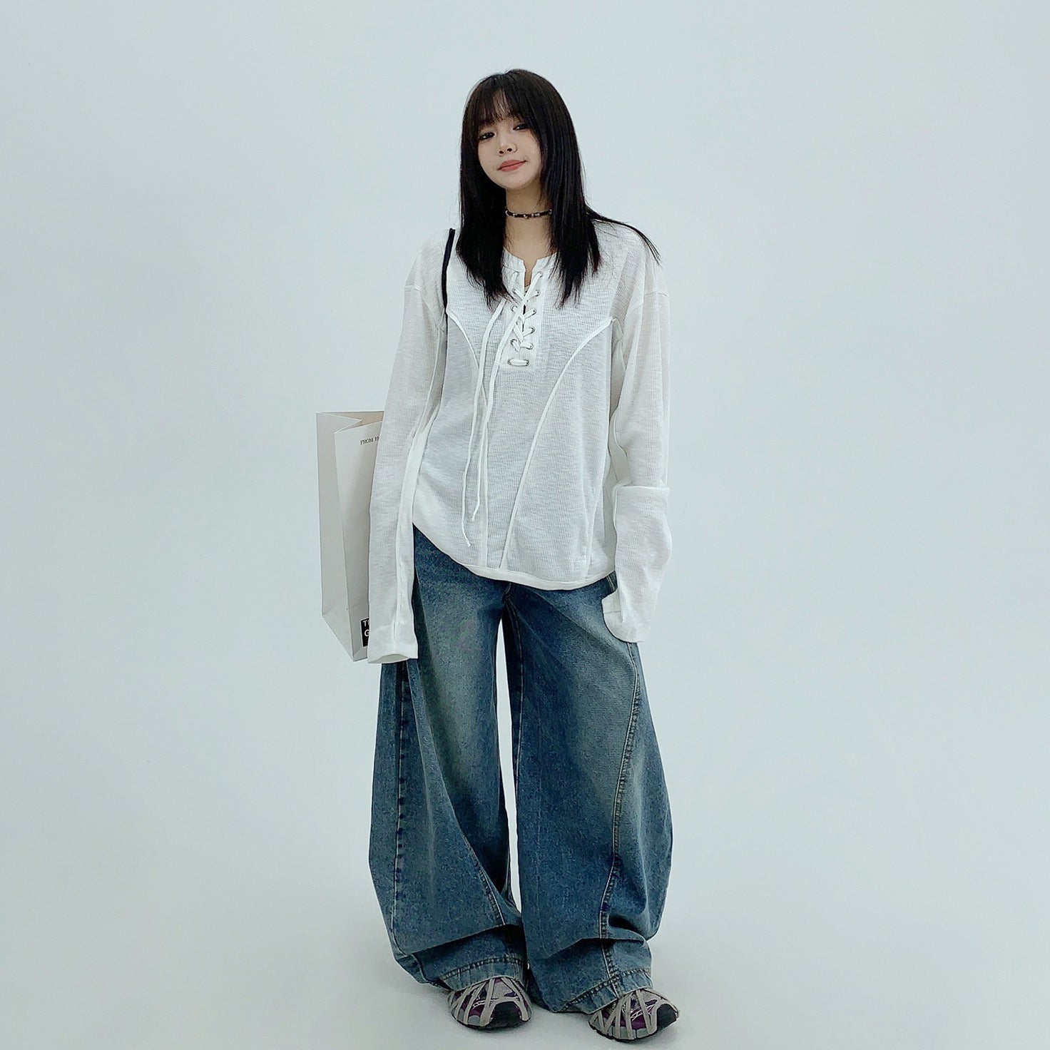 【トップス】春秋 カジュアル ユニークデザイン レースアップ 長袖 Tシャツ【FCシリーズ】