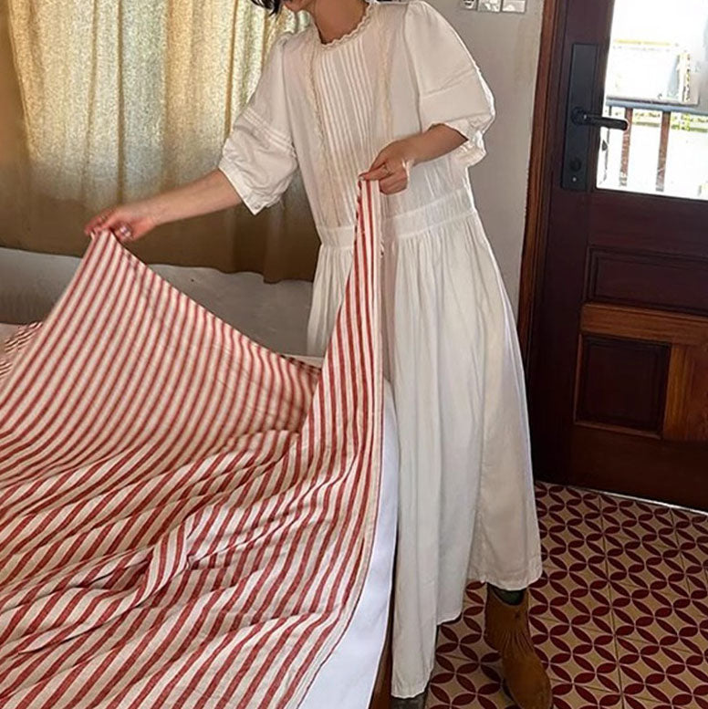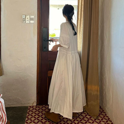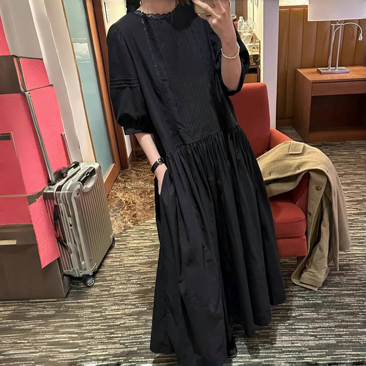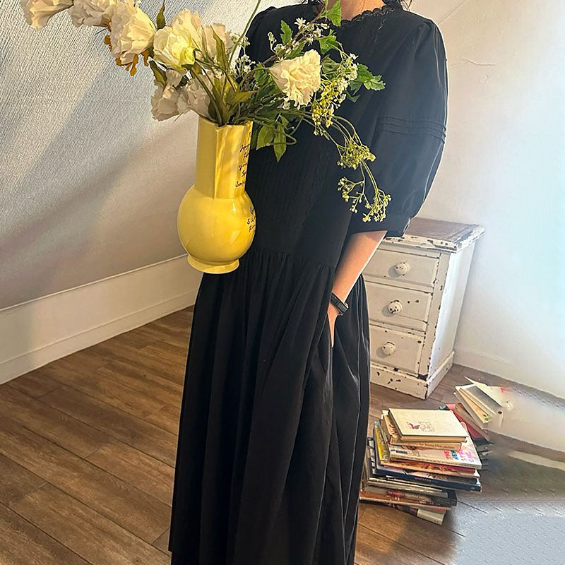 【ワンピース】無地 夏 切り替え プリーツ パフスリーブドレス 半袖ワンピース