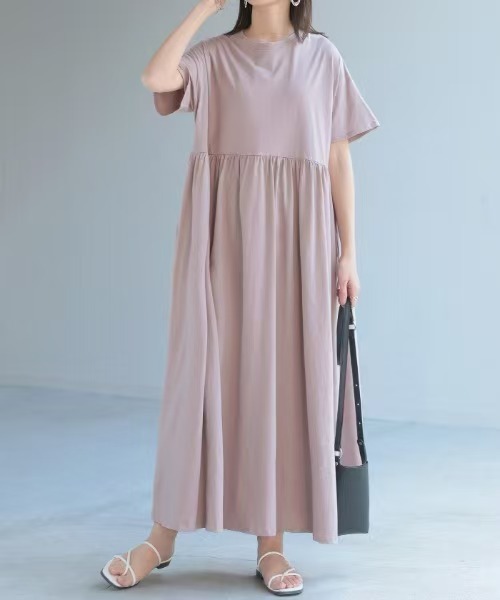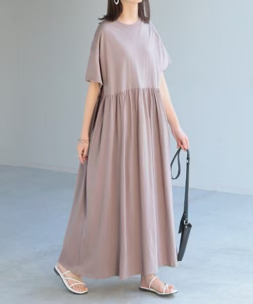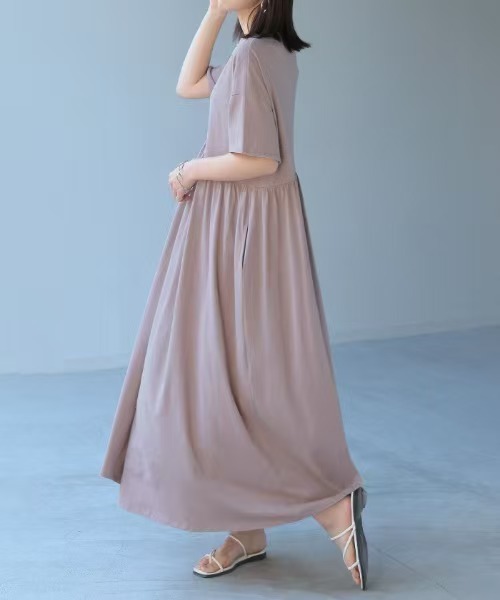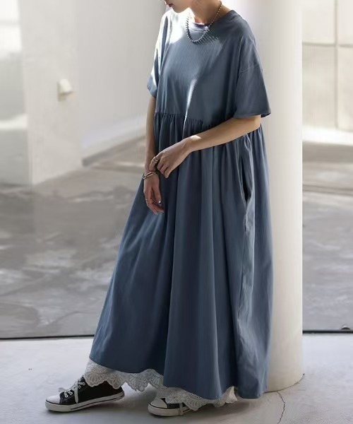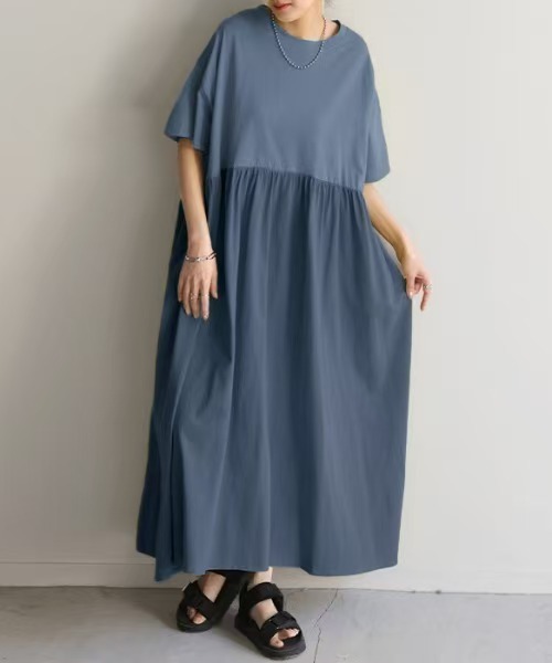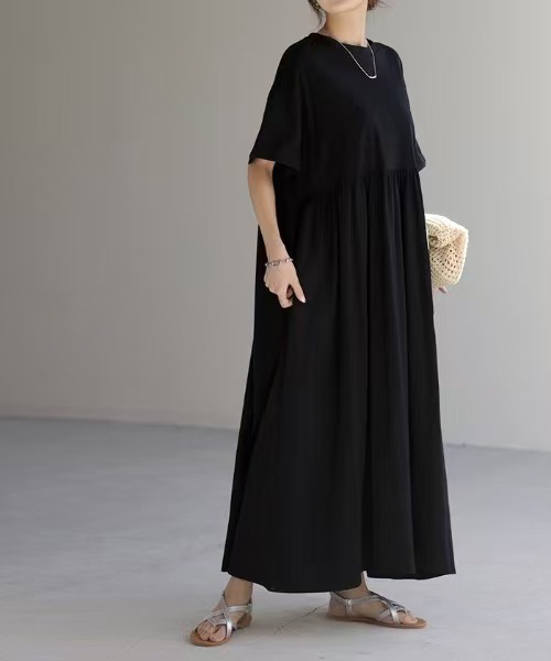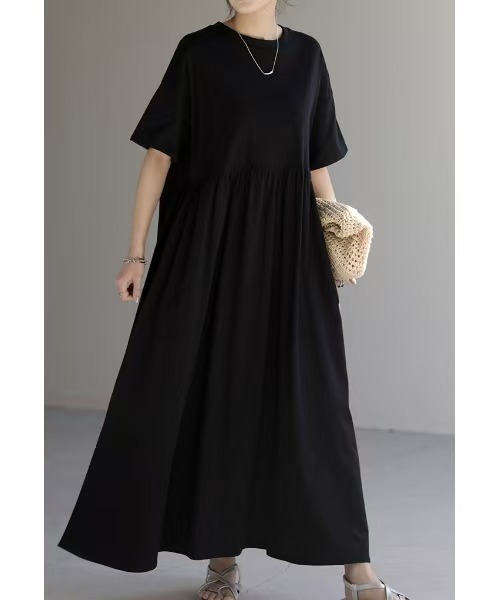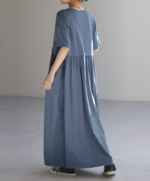 【ワンピース】ジャパニーズスタイル 夏 ポケット付き クルーネック ロング 半袖ワンピース