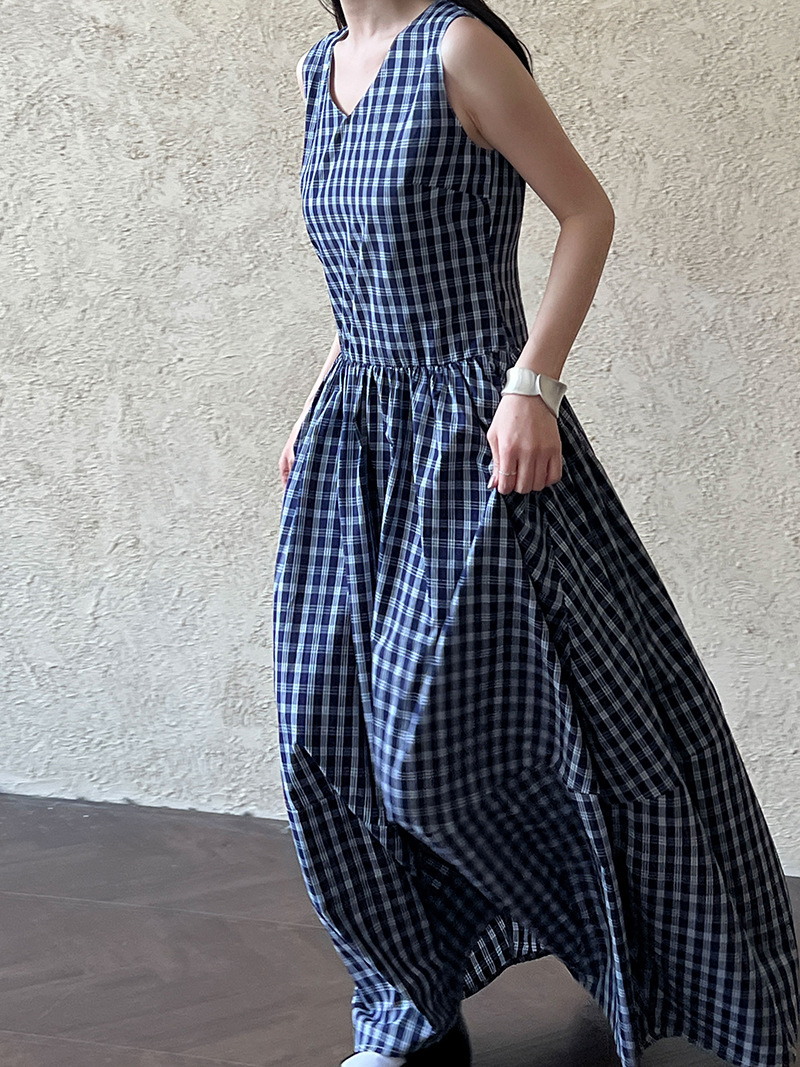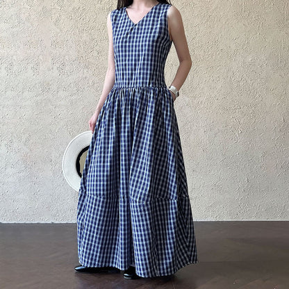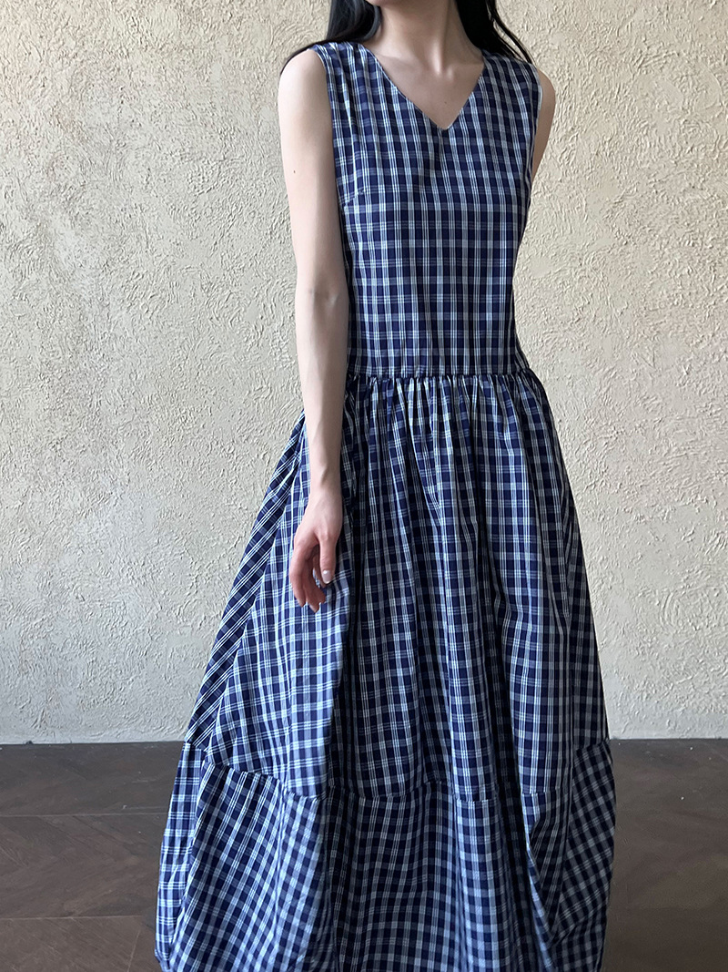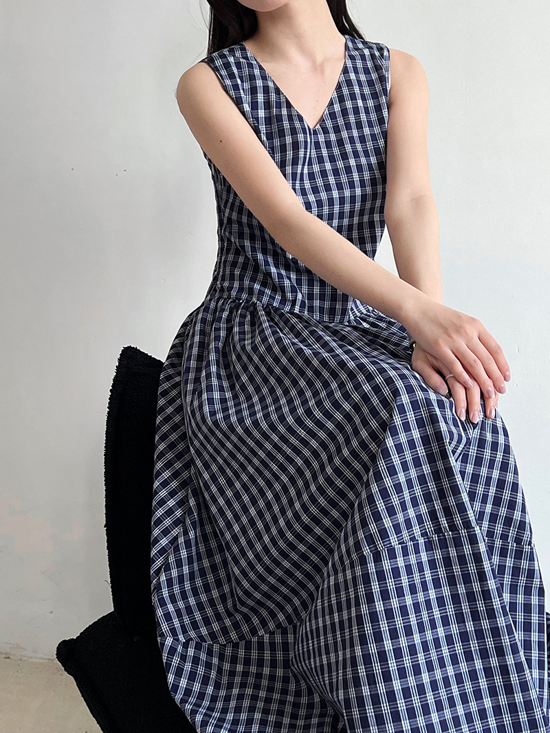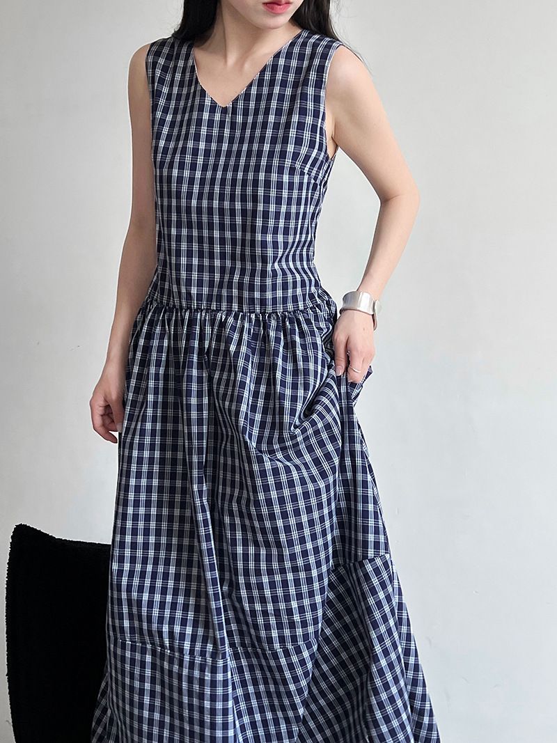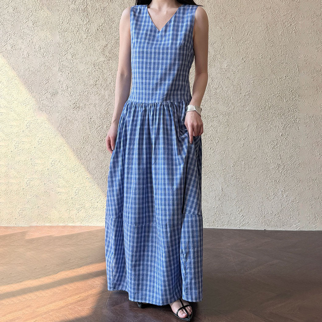 【ワンピース】コットン100% フレンチ 春夏 Vネック チェック ノースリーブワンピース【SNシリーズ】