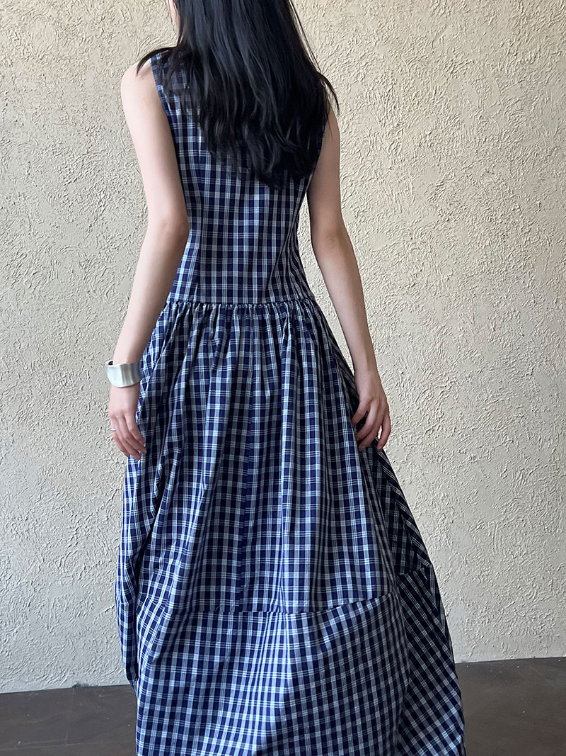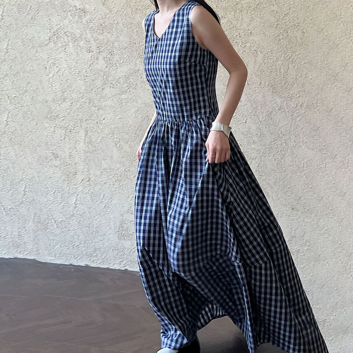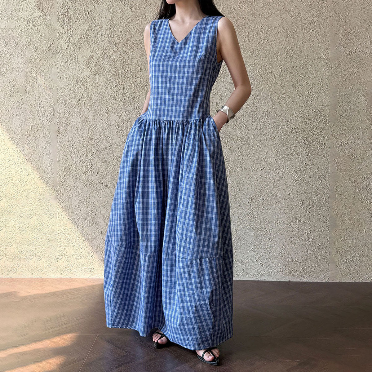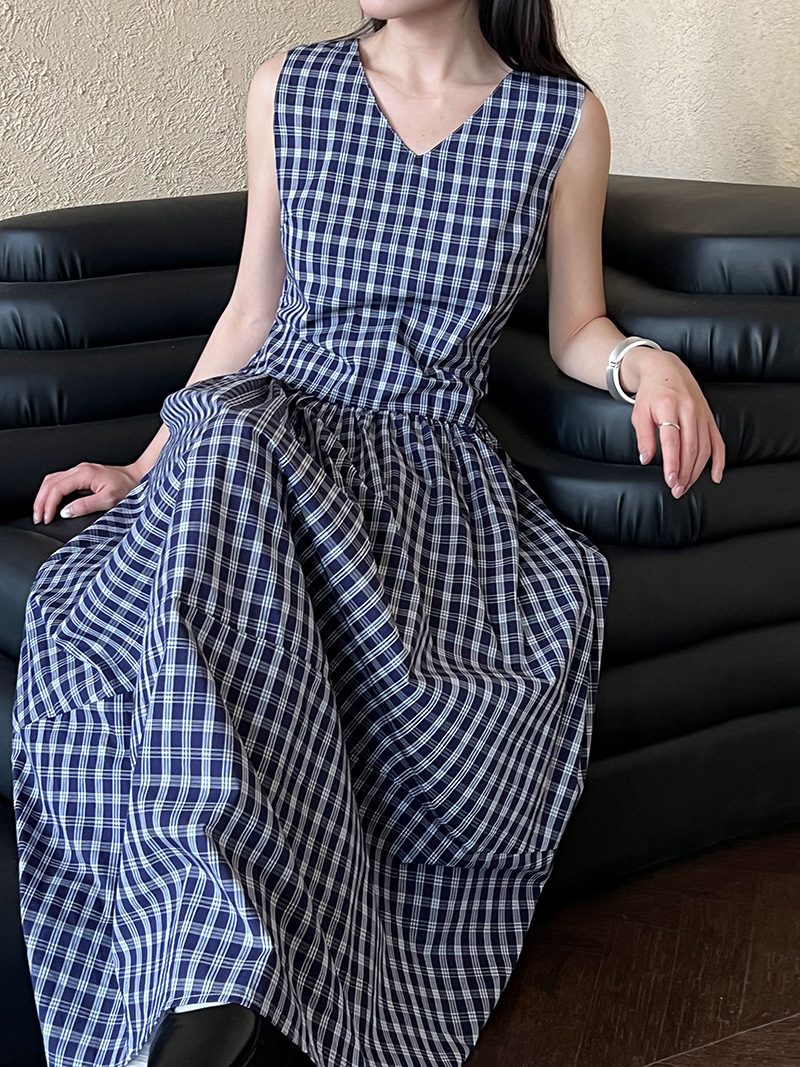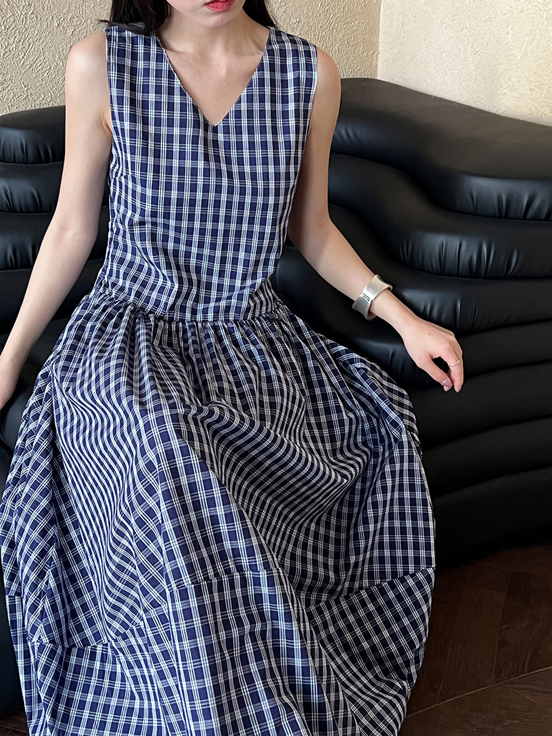 【ワンピース】コットン100% フレンチ 春夏 Vネック チェック ノースリーブワンピース【SNシリーズ】