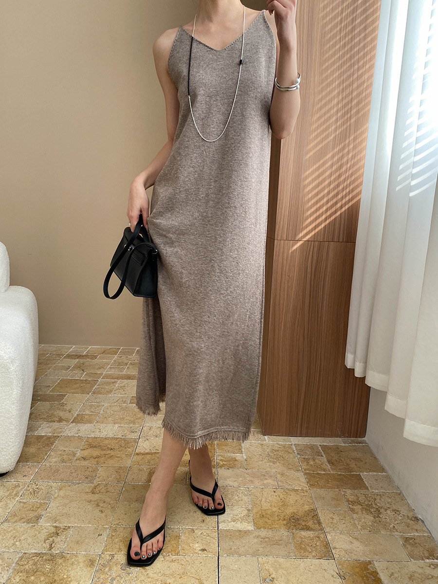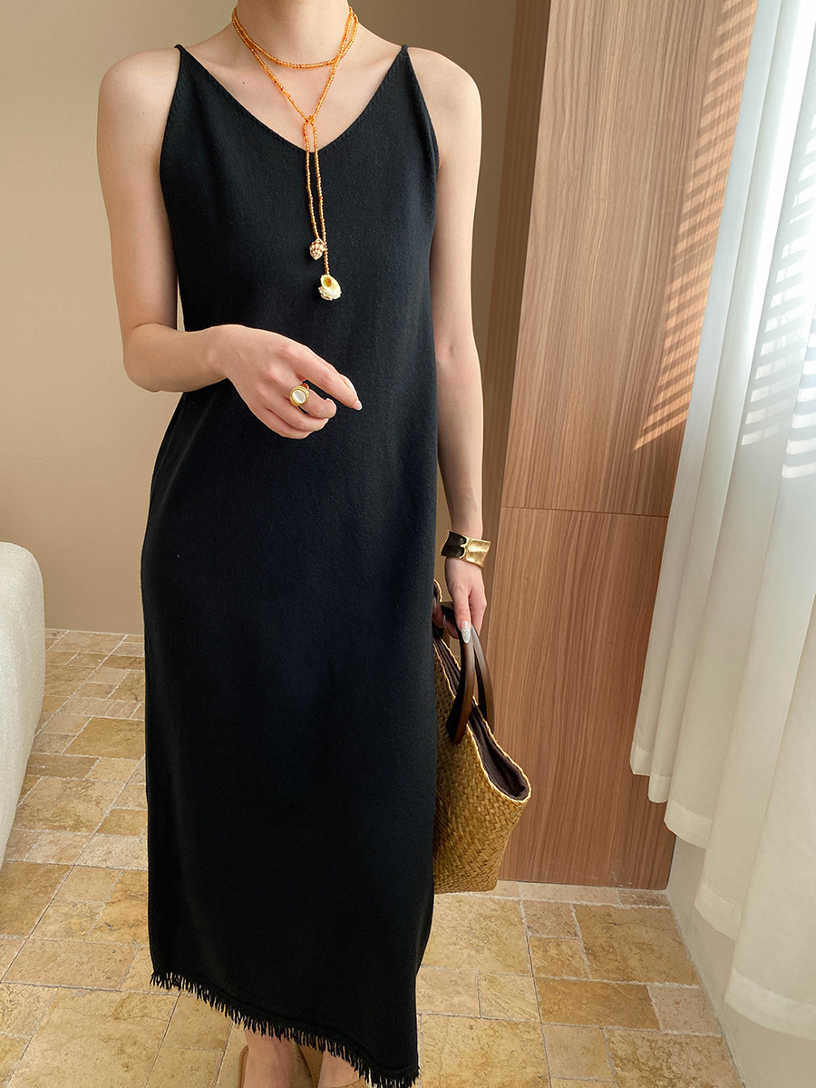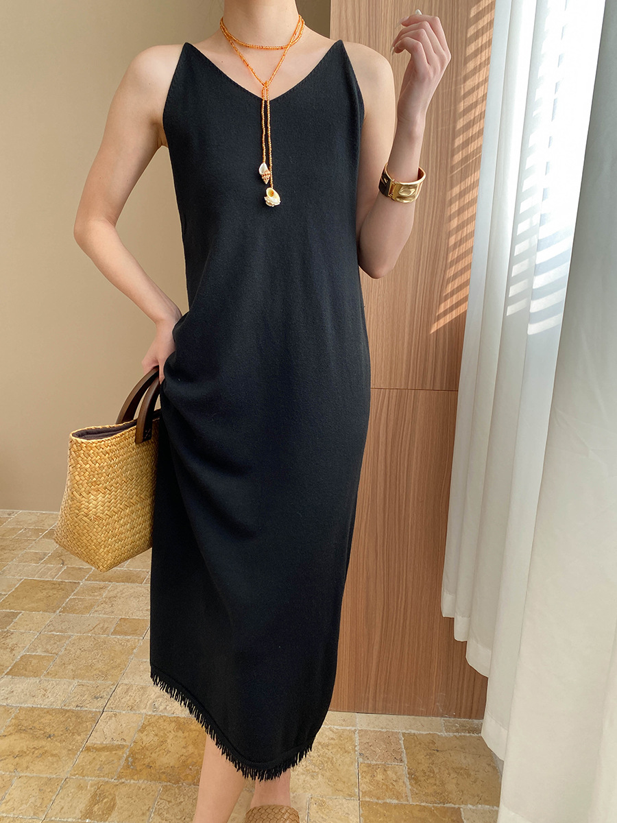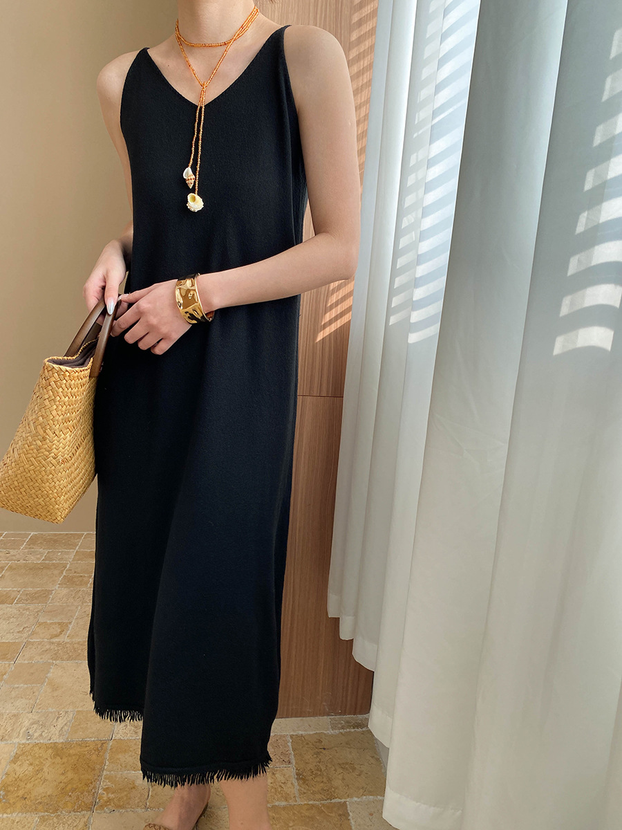 【ワンピース】フリンジデザイン 夏 フレンチエレガント Vネック スリム見え ノースリーブ ニットワンピース【SNシリーズ】