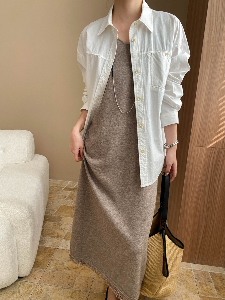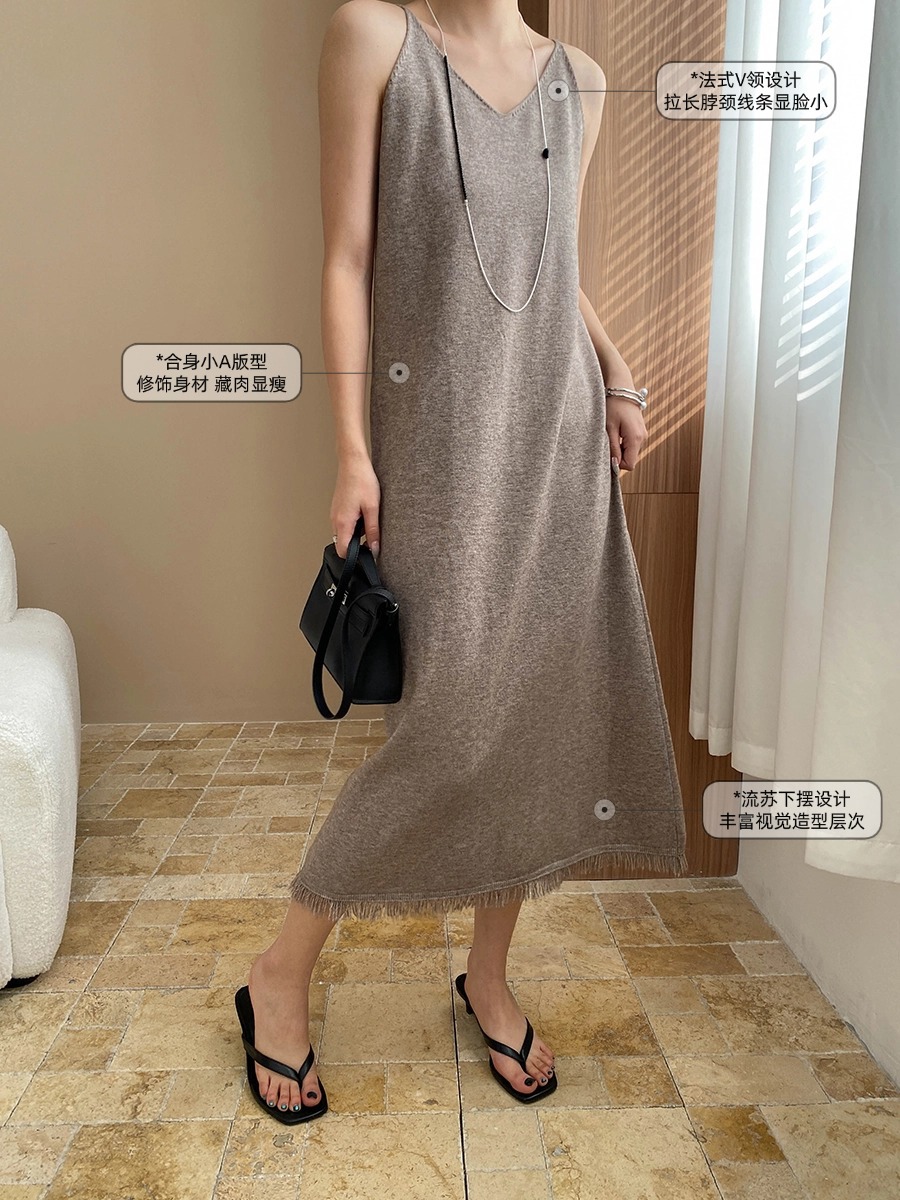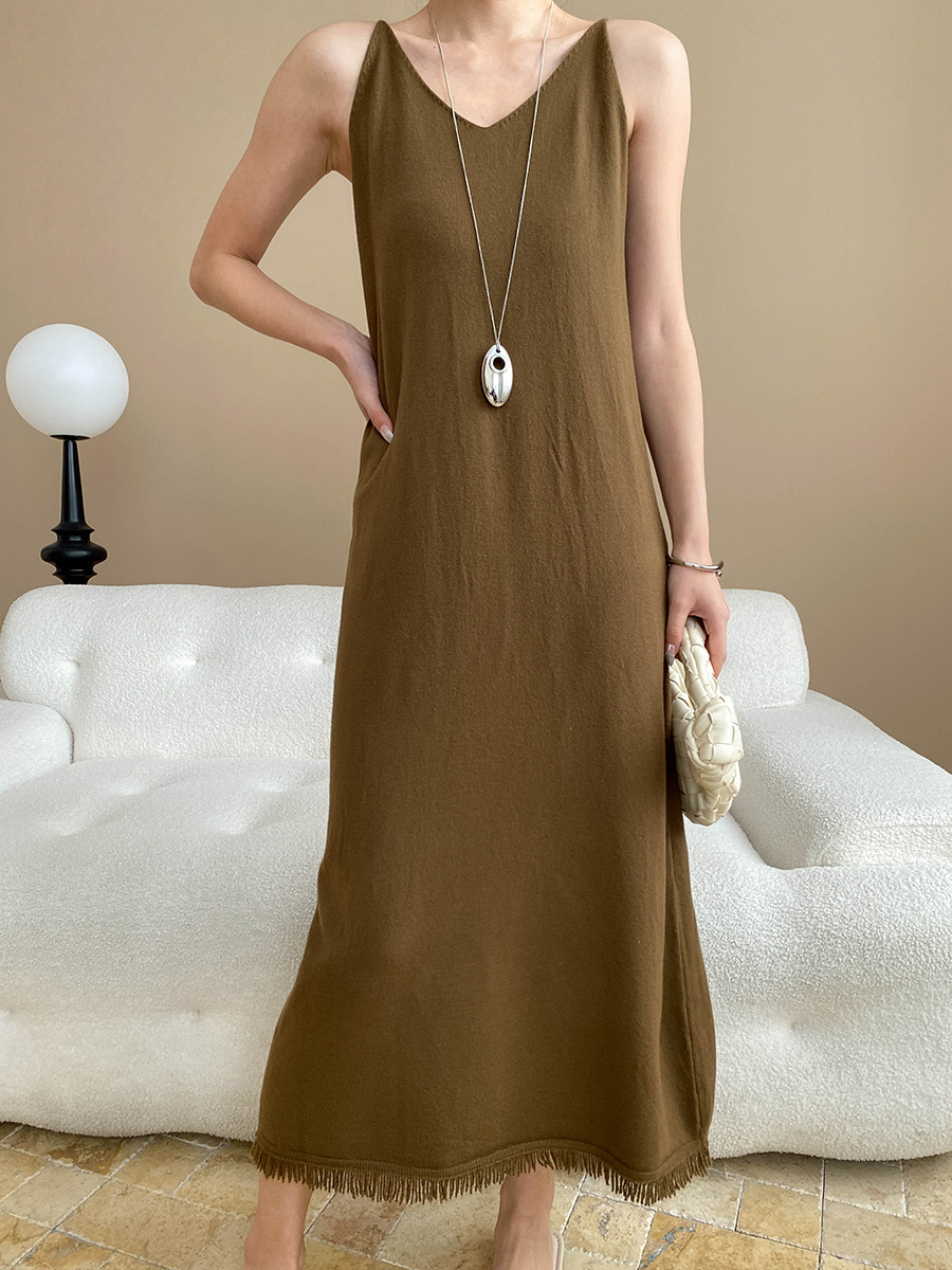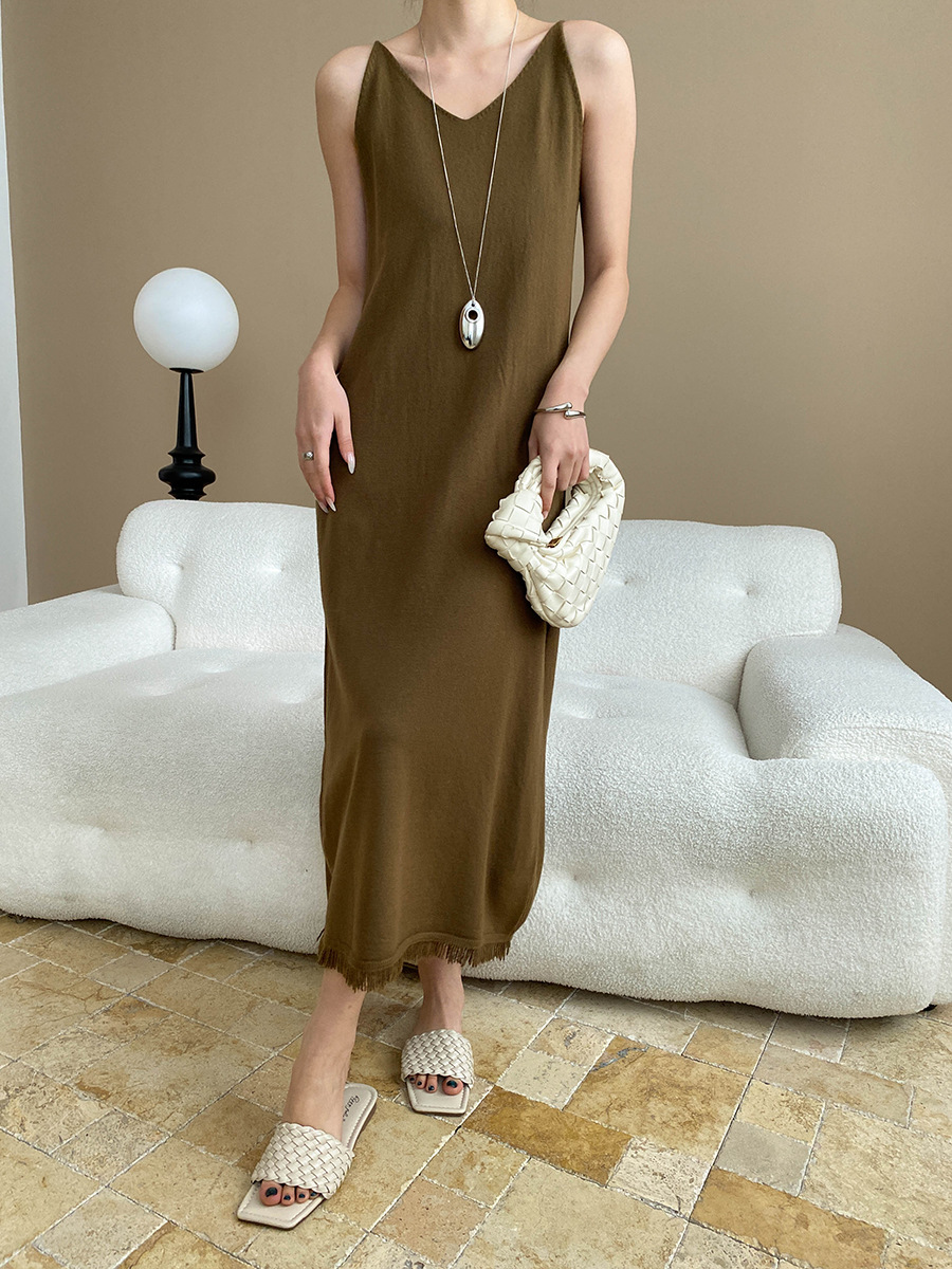 【ワンピース】フリンジデザイン 夏 フレンチエレガント Vネック スリム見え ノースリーブ ニットワンピース【SNシリーズ】