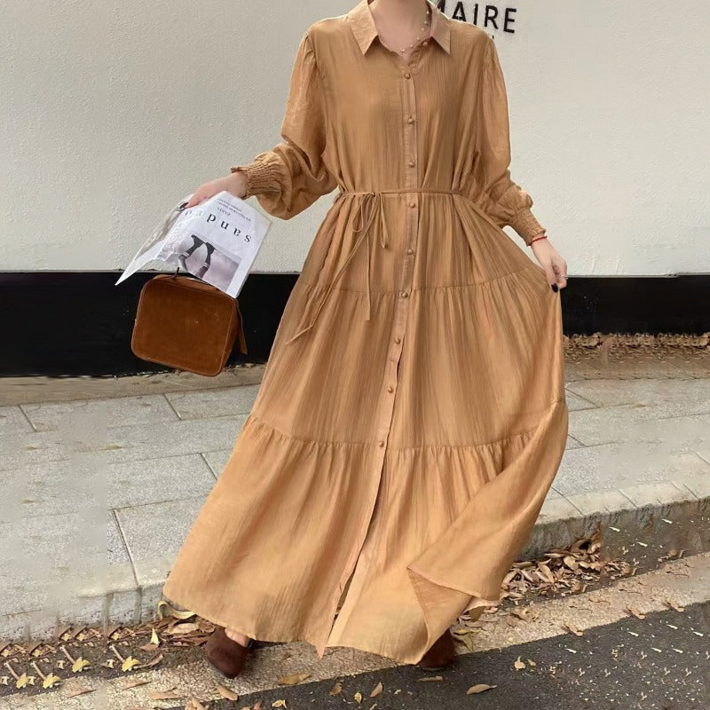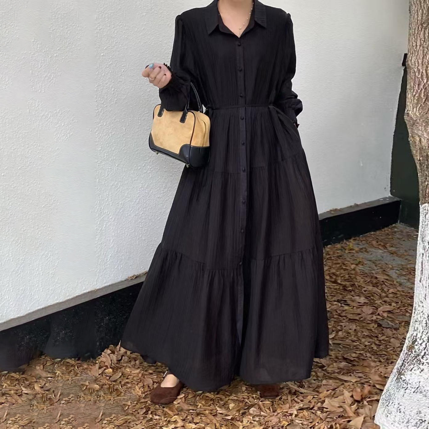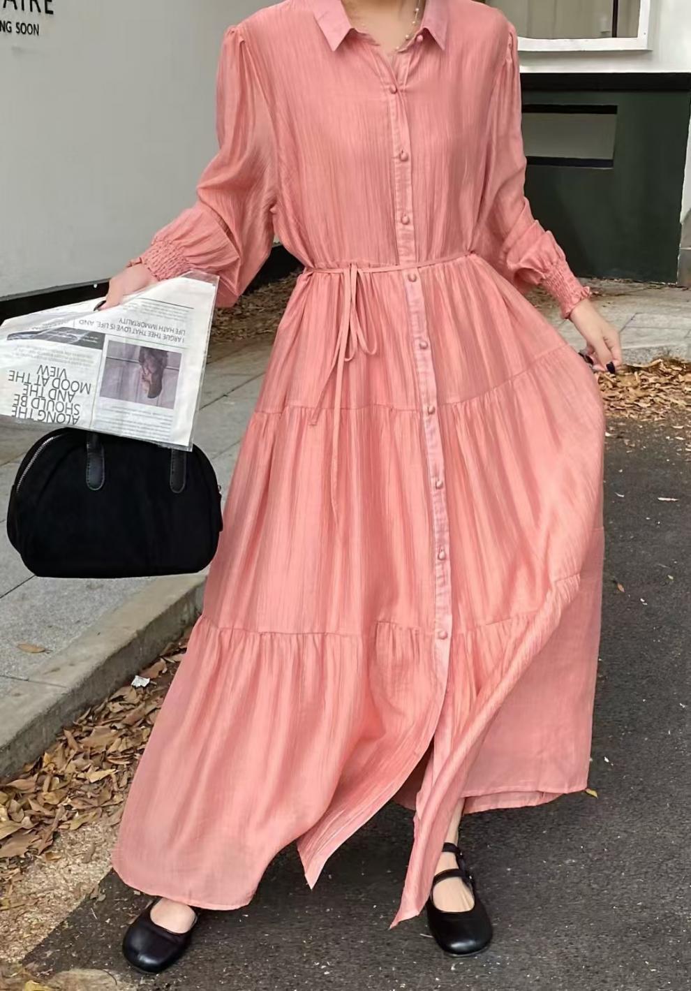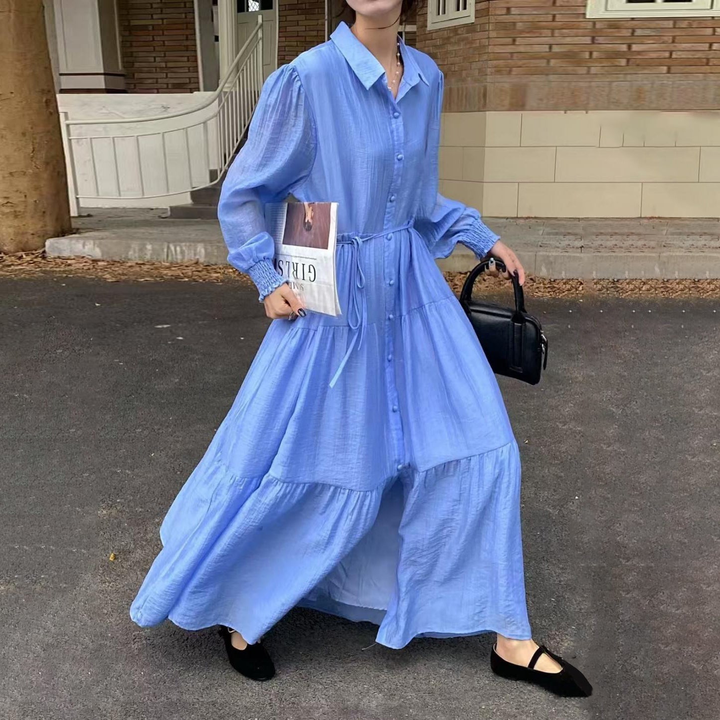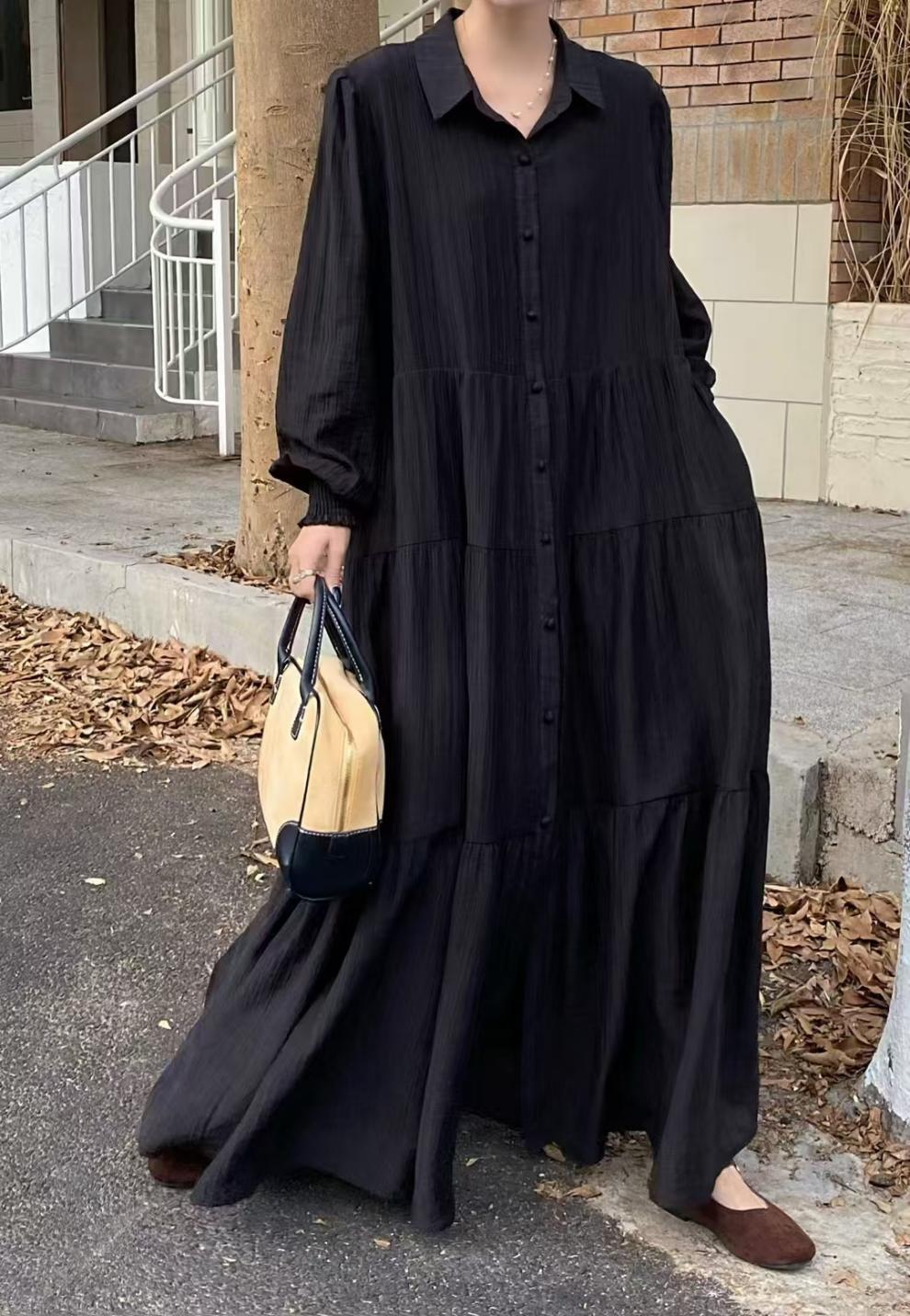 【ワンピース】7カラー 韓国風 ゆったり 大きめサイズ シングルボタン エレガント 長袖ワンピース