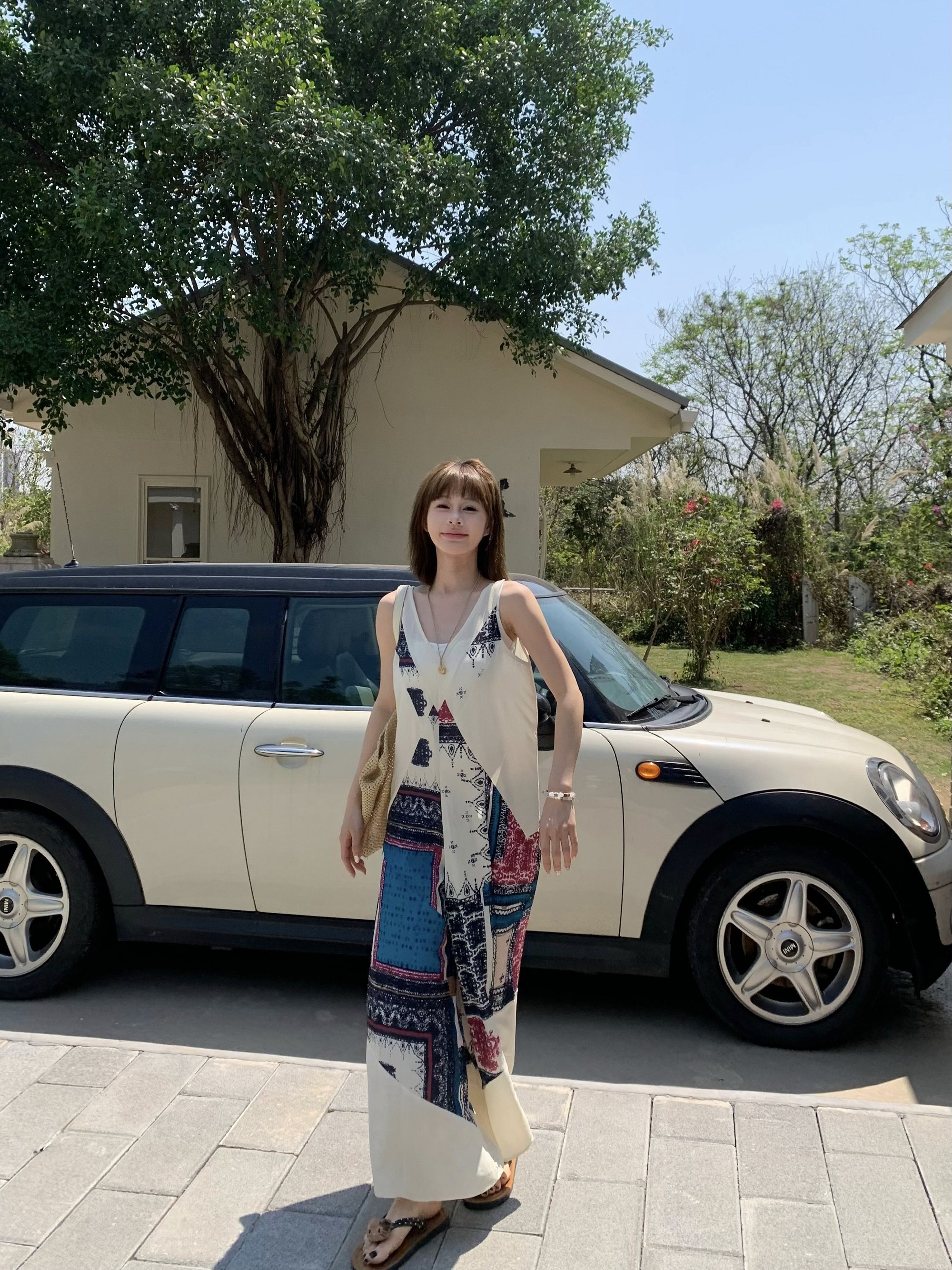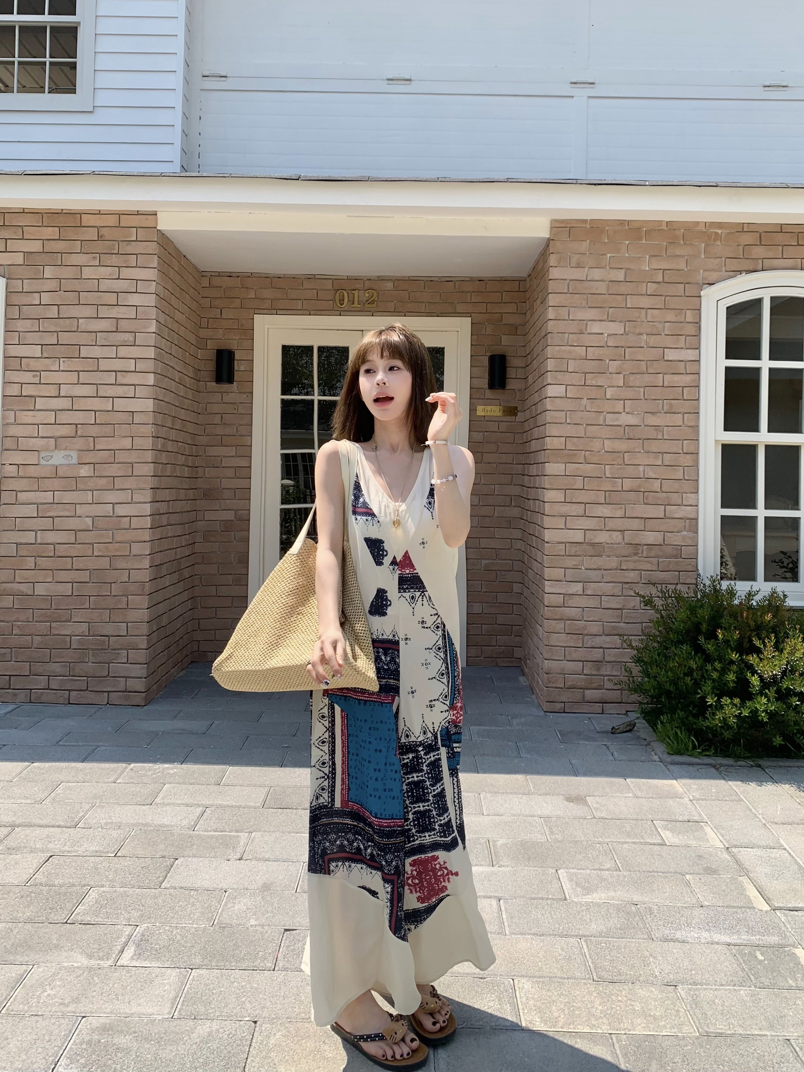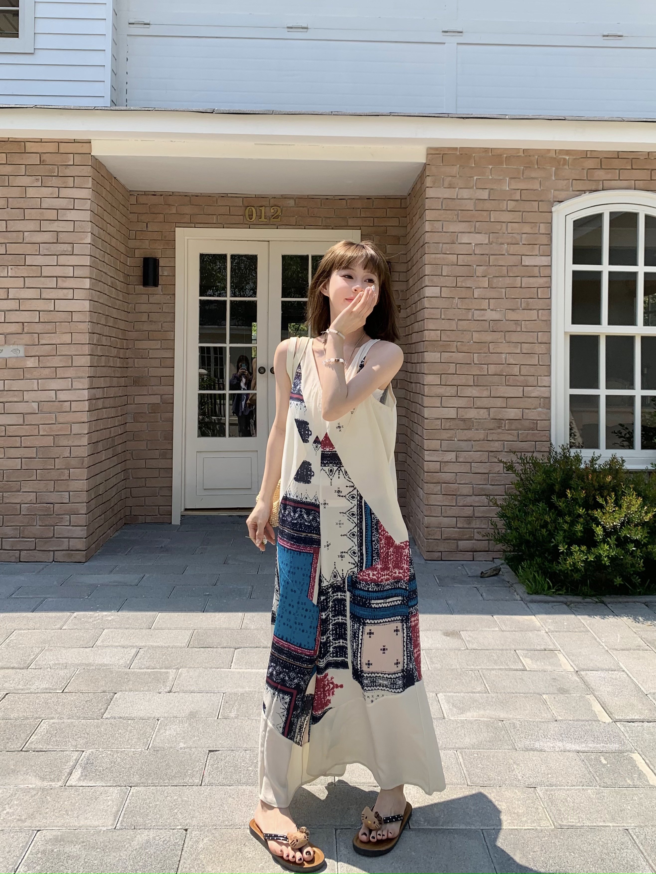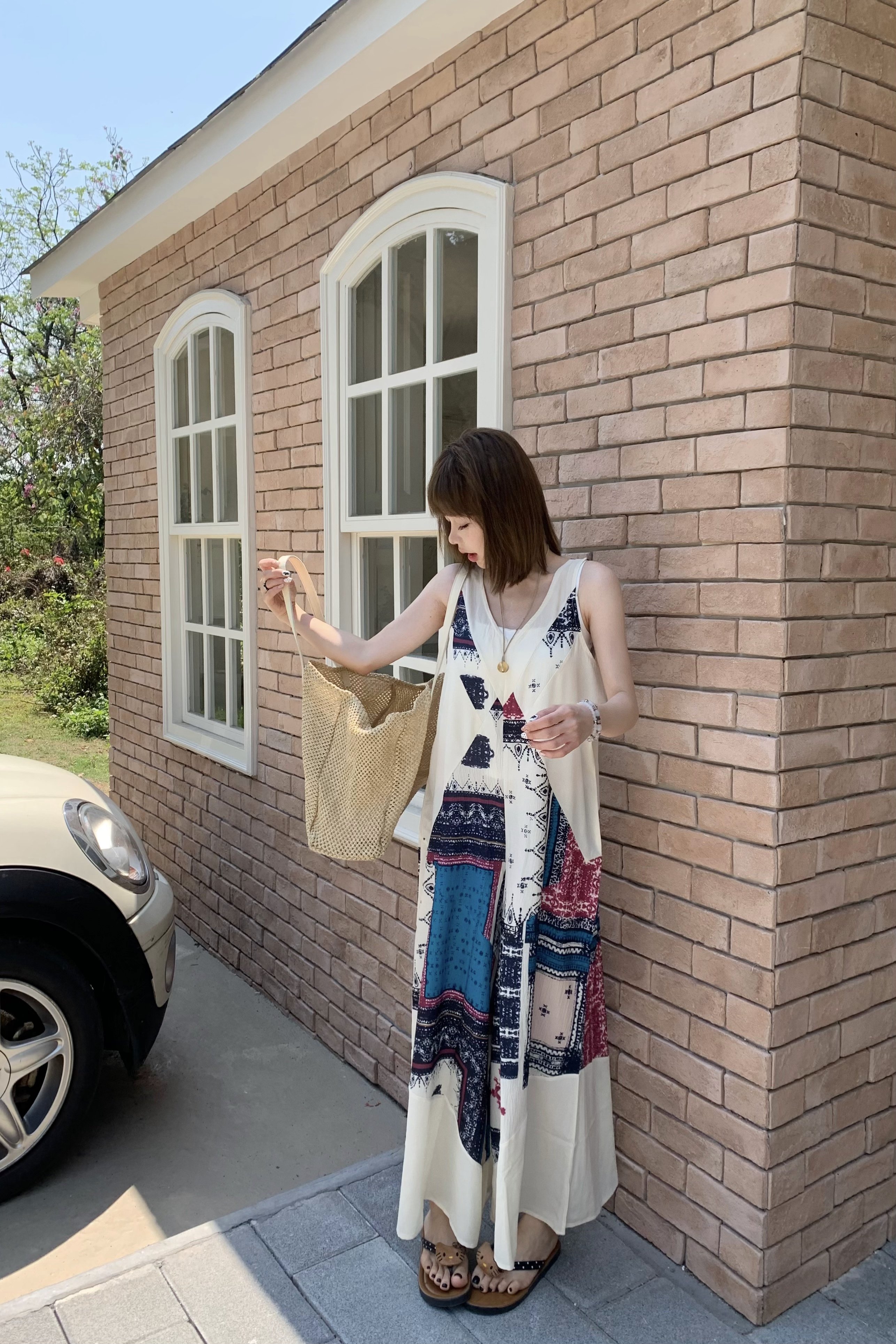 【ボトムス】ヴィンテージプリント デザインVネック アイランドスタイル ノースリーブキャミオールインワン【SHシリーズ】