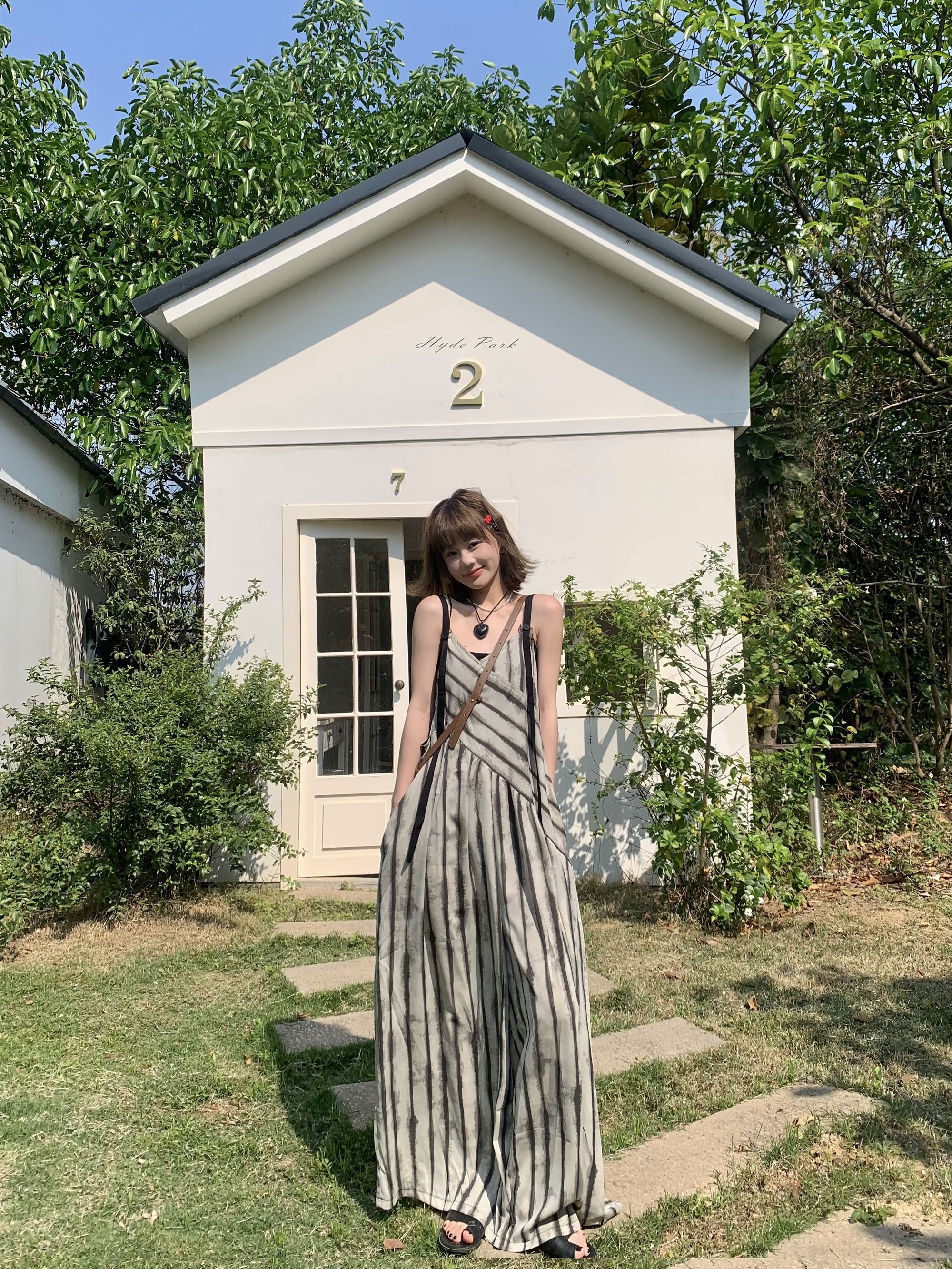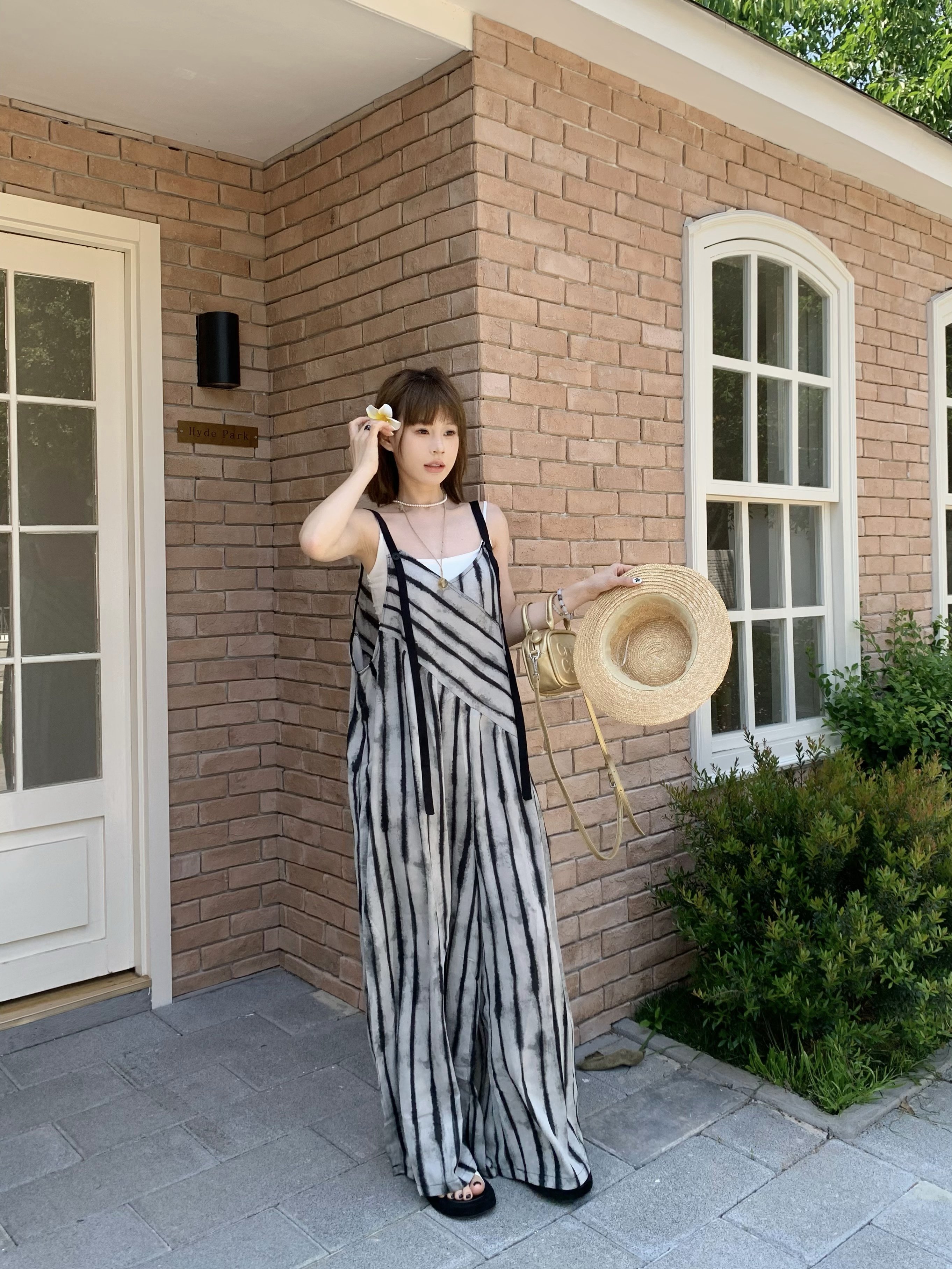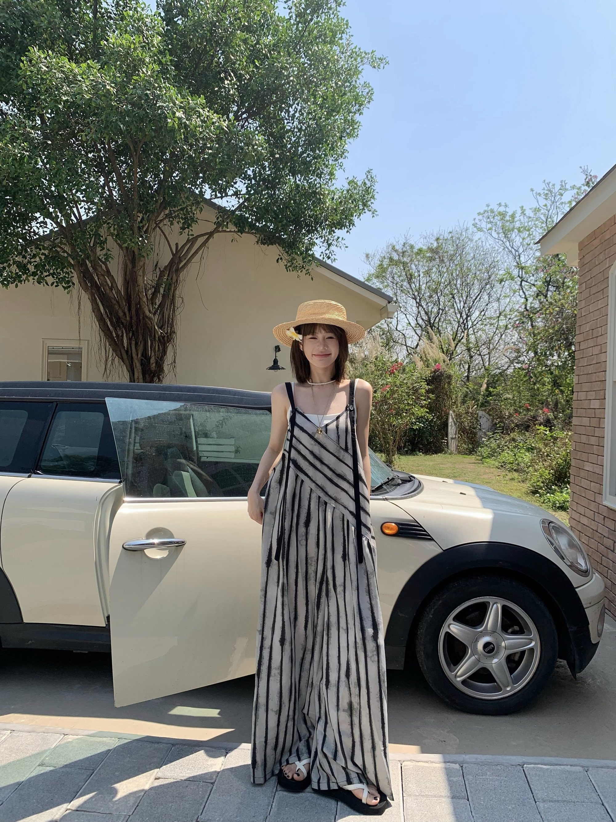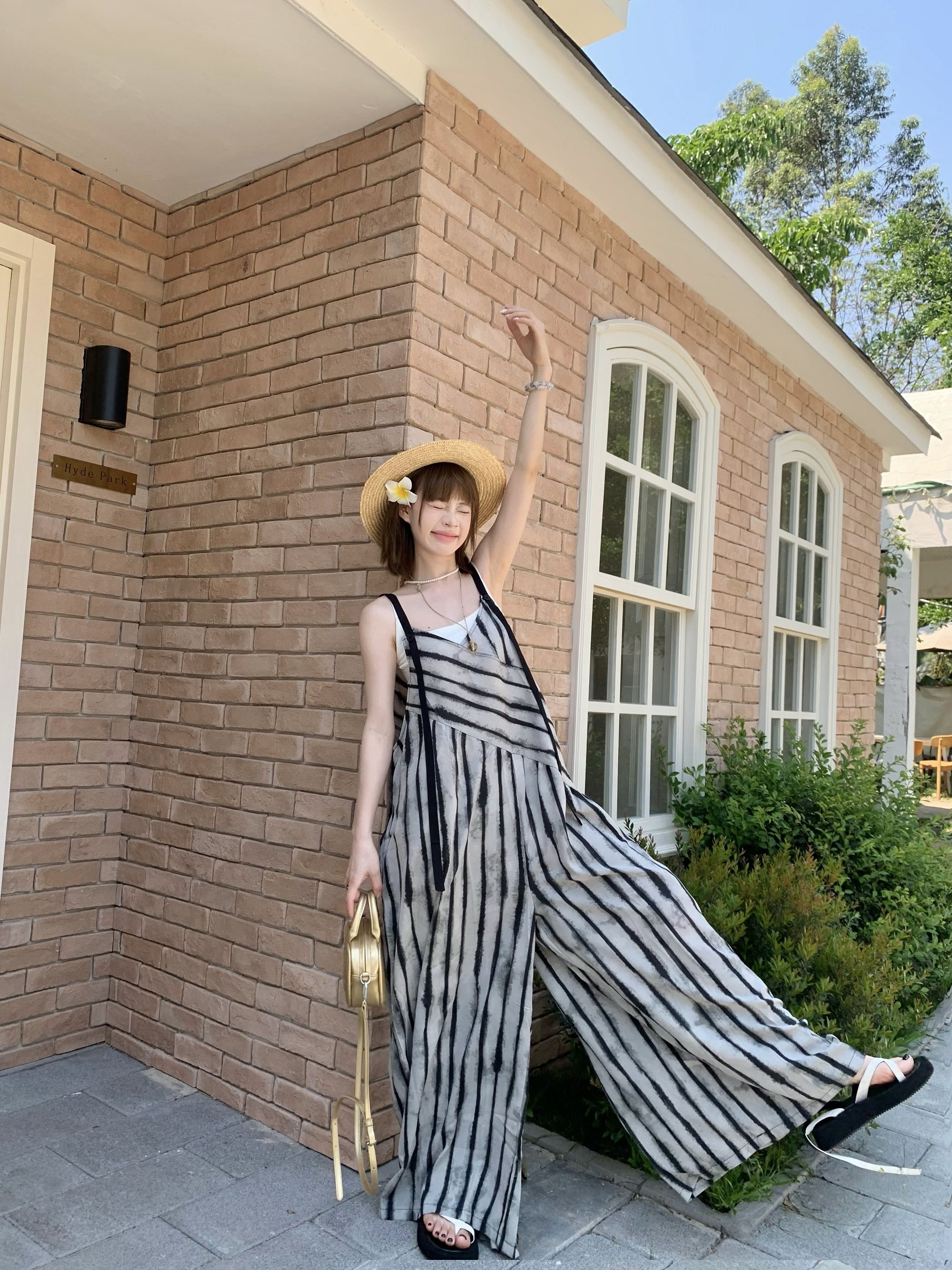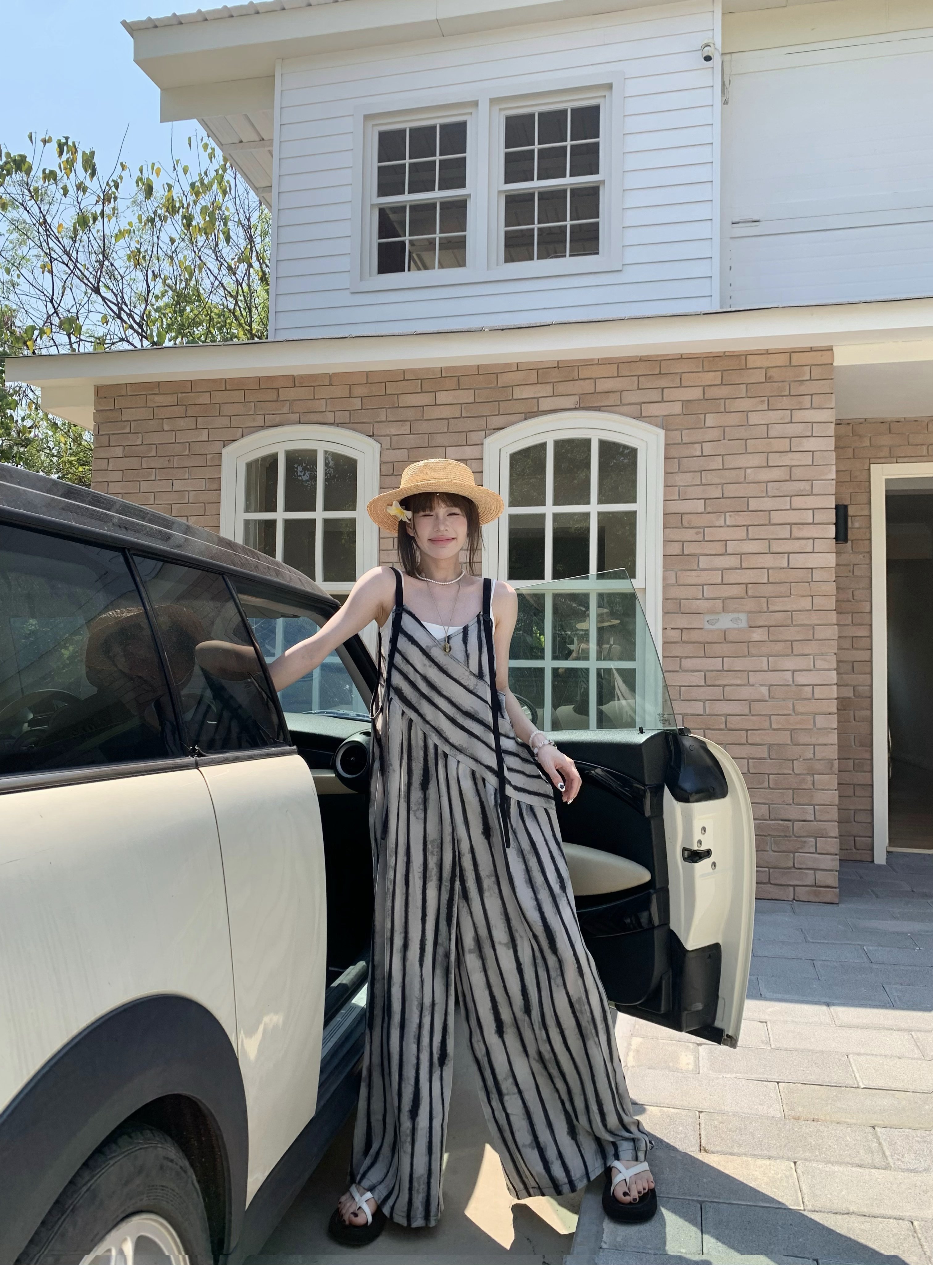 【ボトムス】夏新作 ルーズシルエット オーバーサイズ ストライプ キャミサロペット ワイドパンツ 【SHシリーズ】
